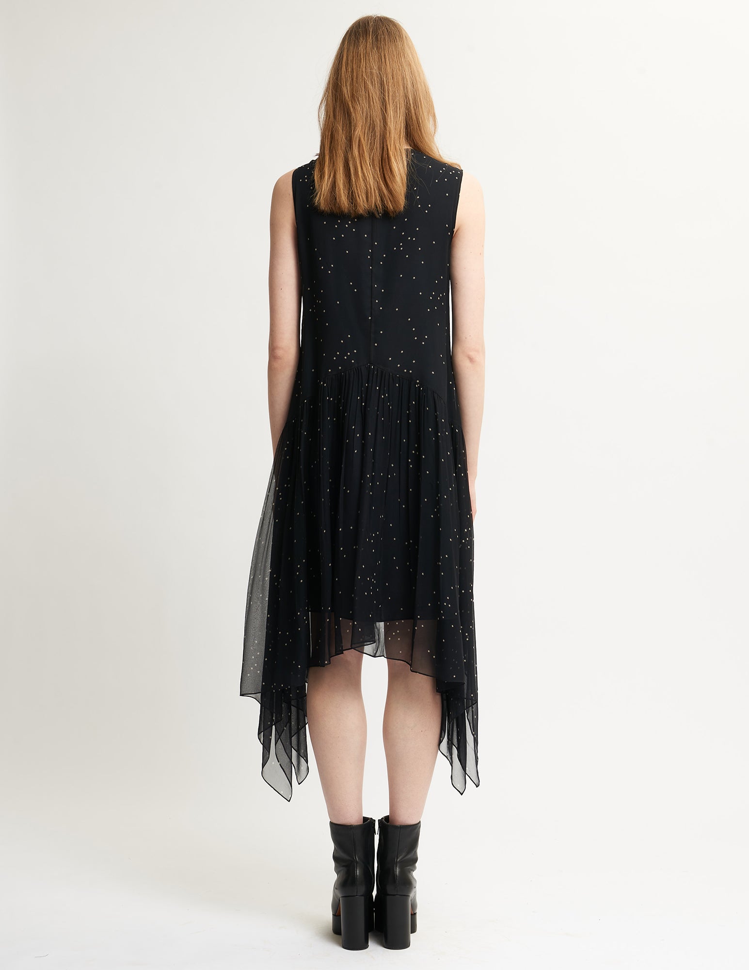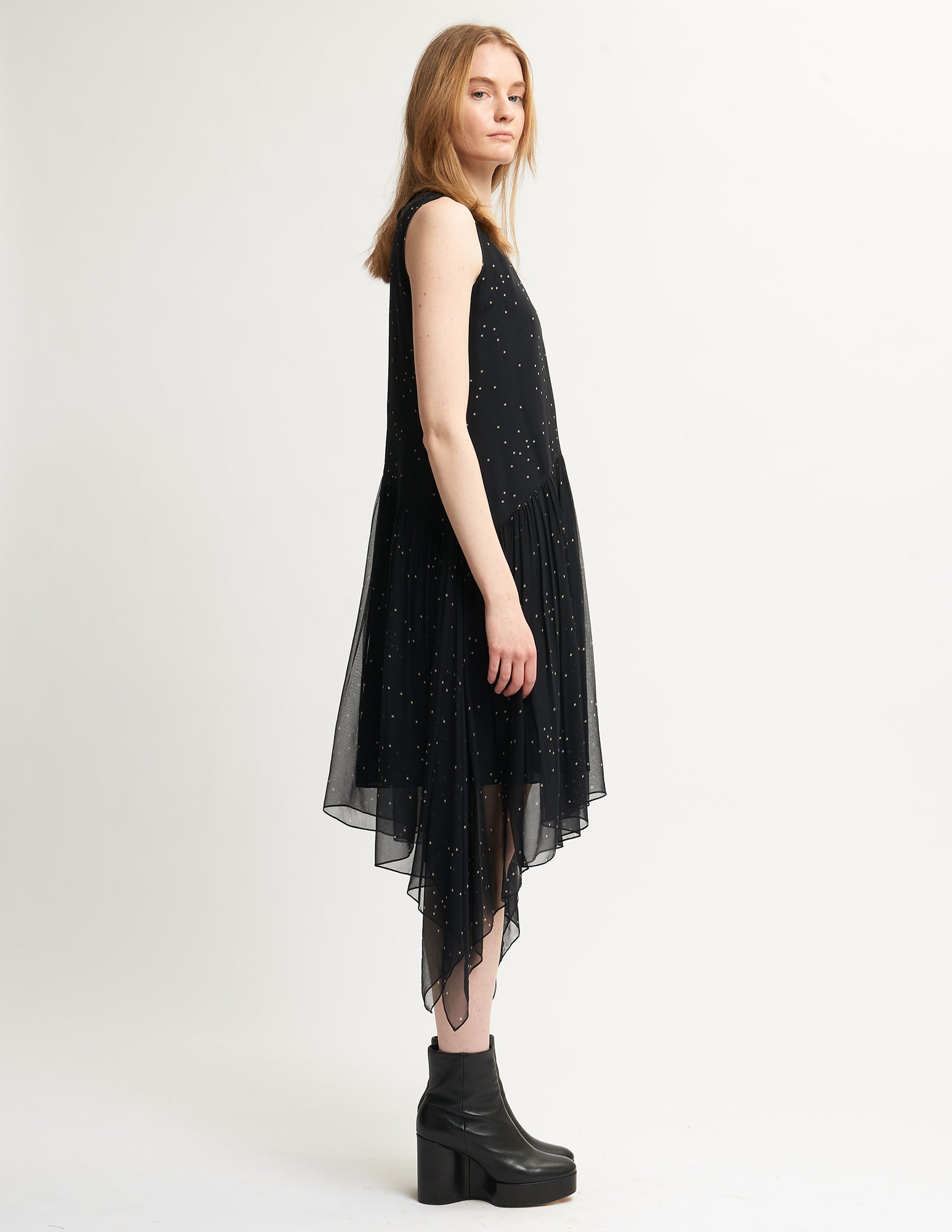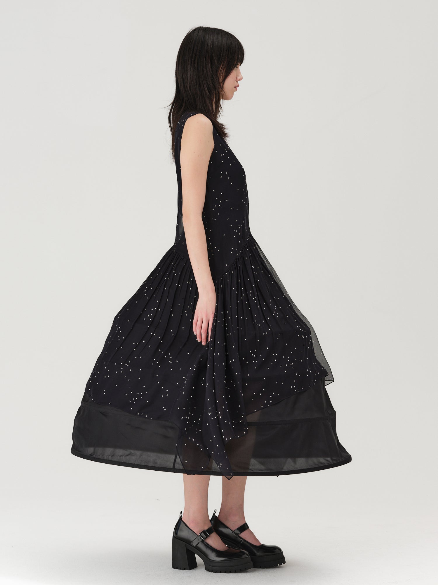 sleeveless chiffon dress featuring an a-line silhouette, angled waist seam and asymmetric shirred skirt.