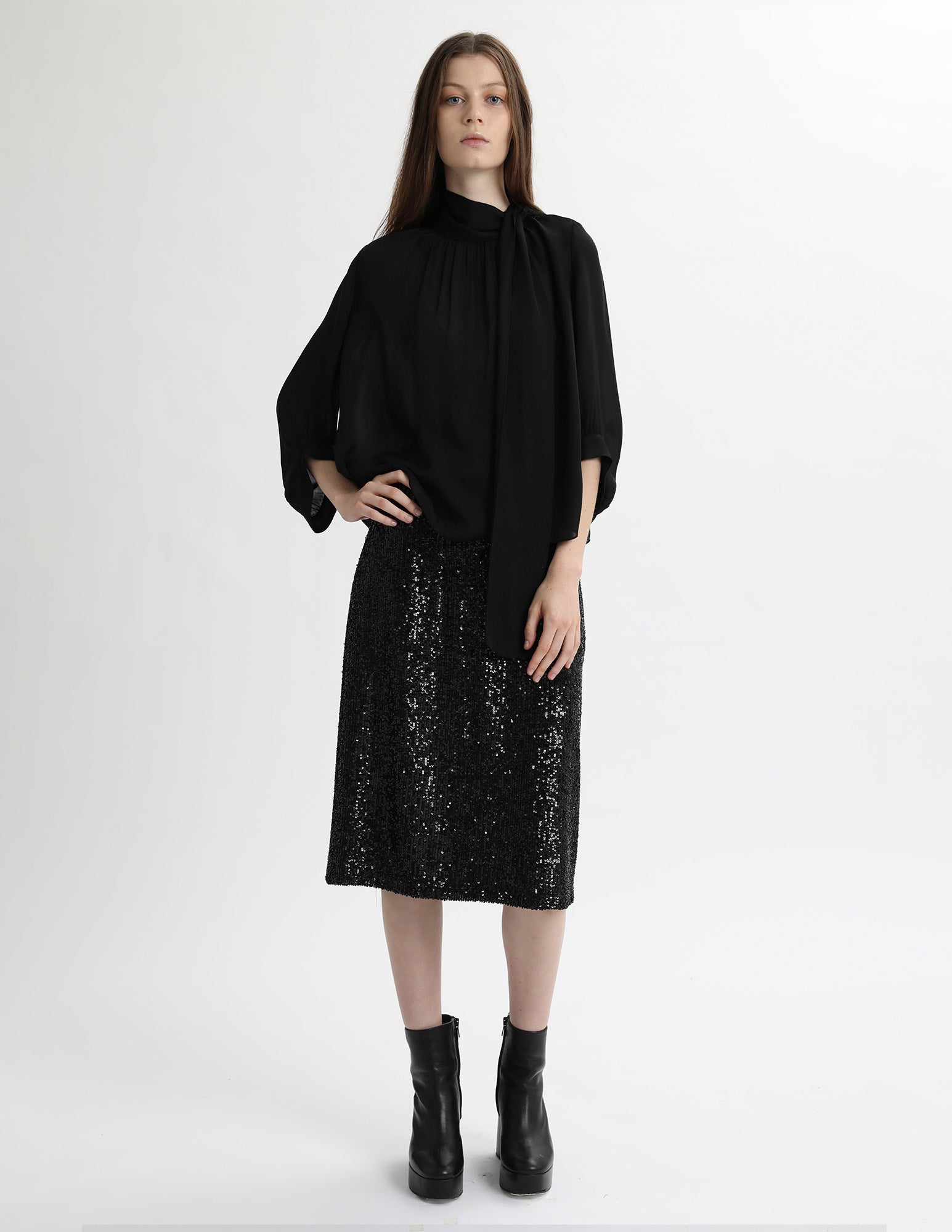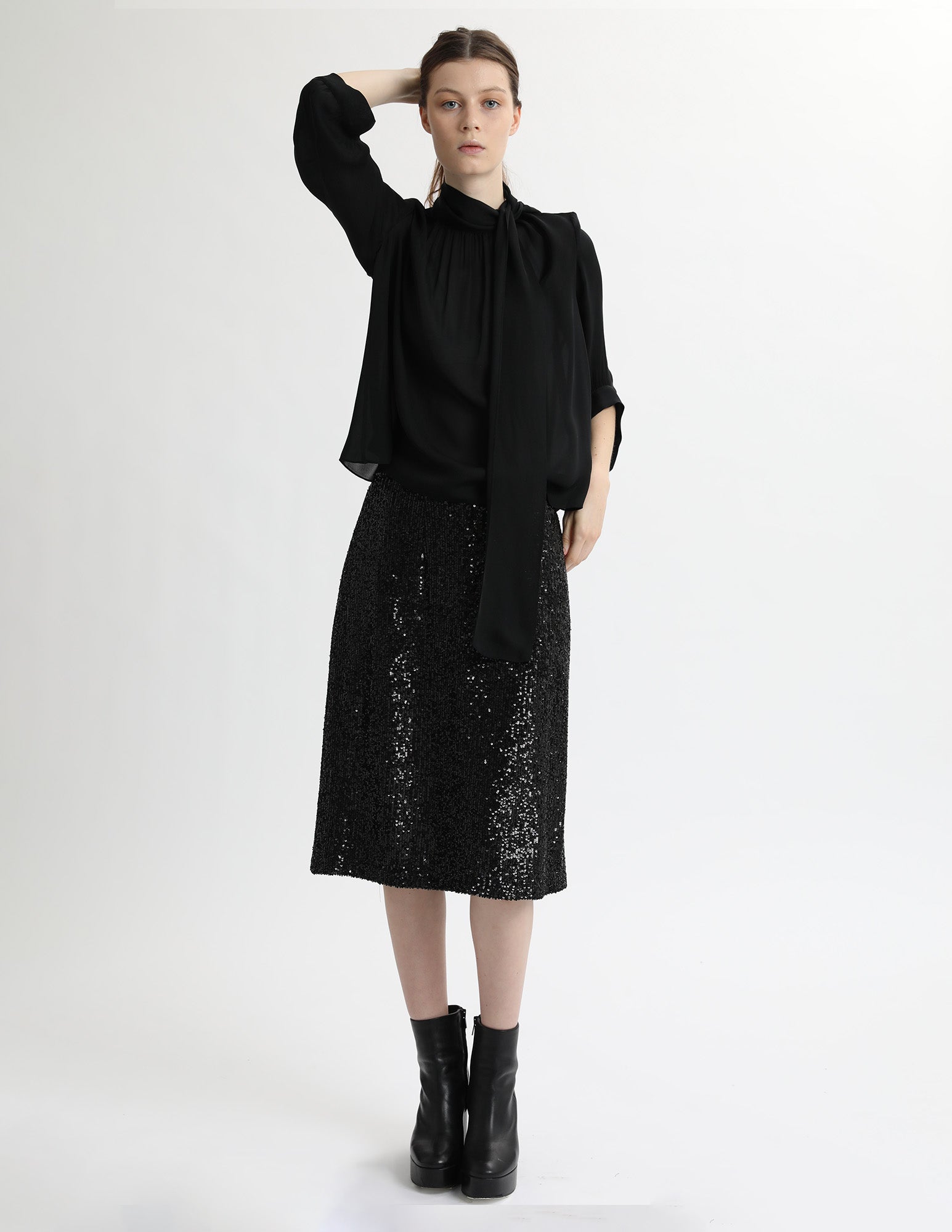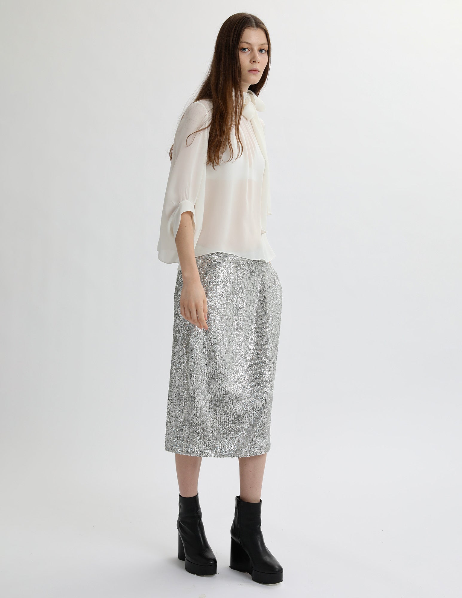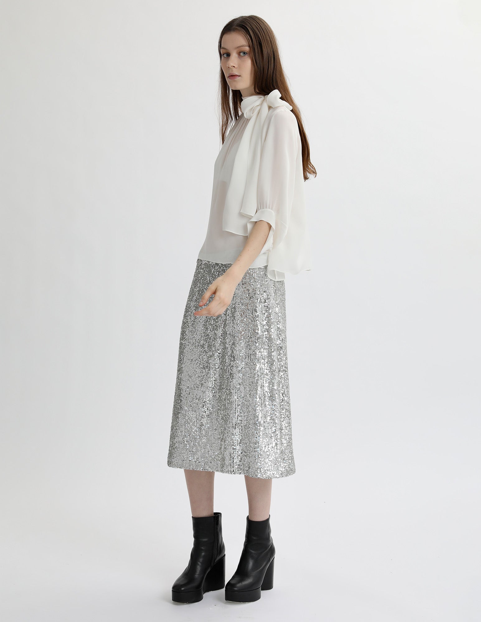sequin midi skirt that has a loose silhouette, a waistband, and interior pockets. styled with the fable blouse.