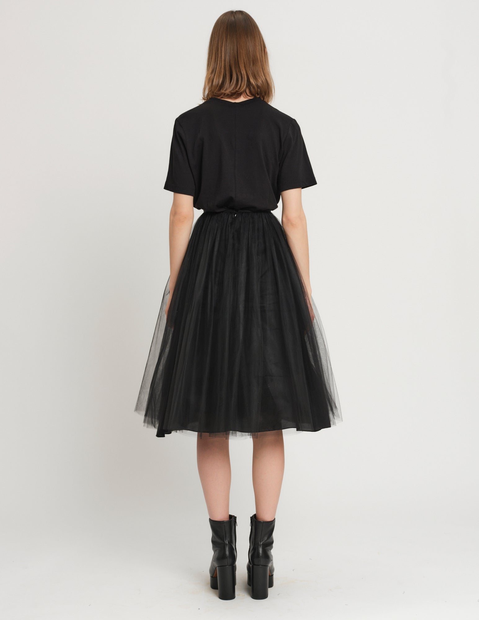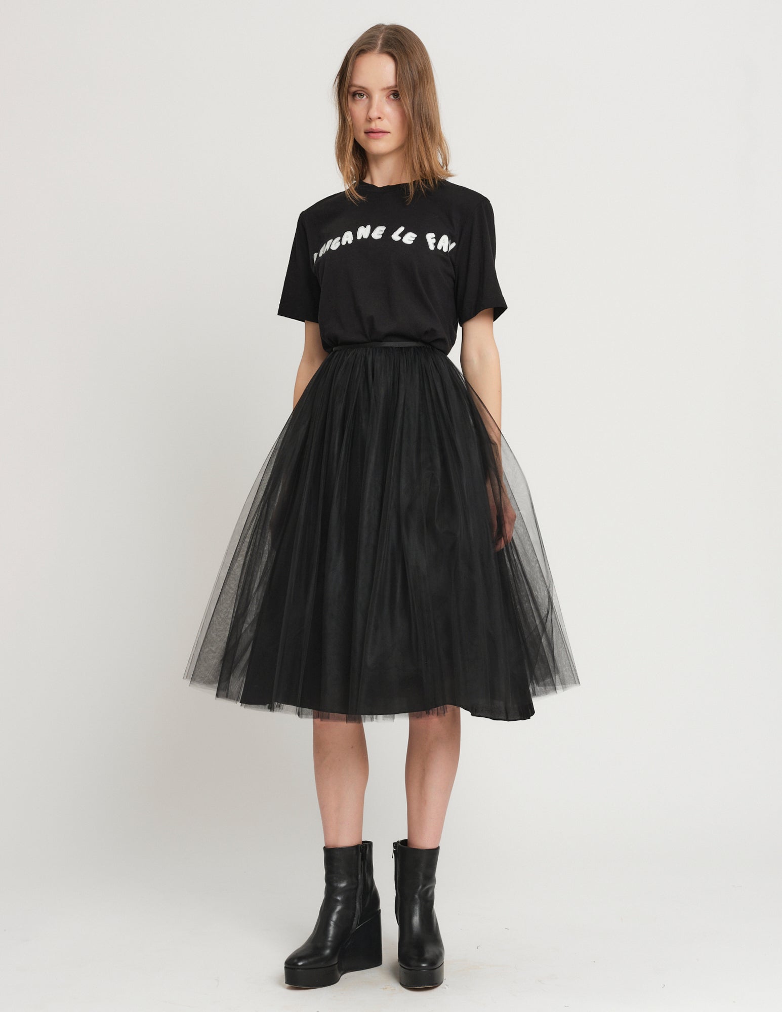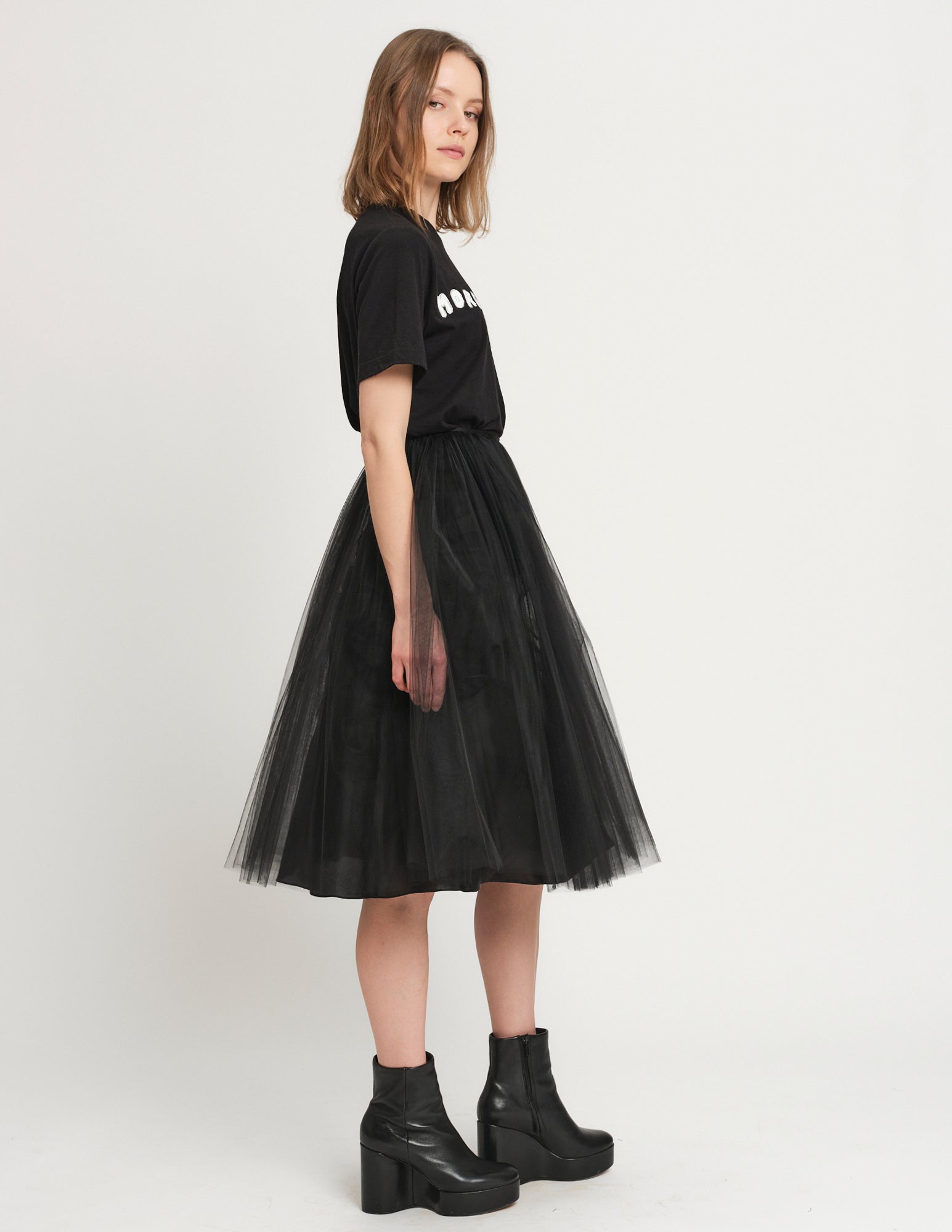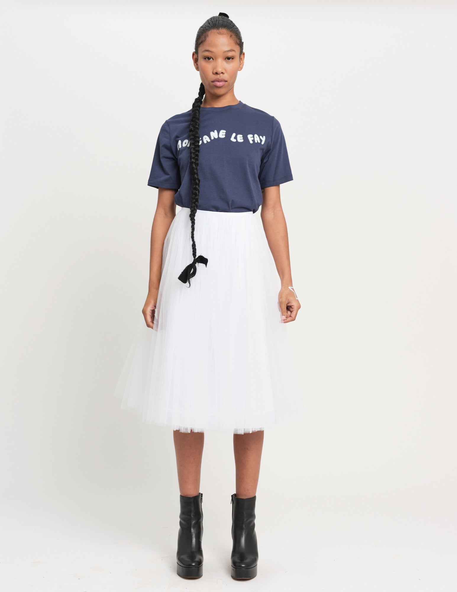 introducing the dream catcher, a unisex cotton t shirt featuring crew neck, short sleeve, and regular fit. morgane le fay bubble logo printed across chest. styled with the daphne crinoline.