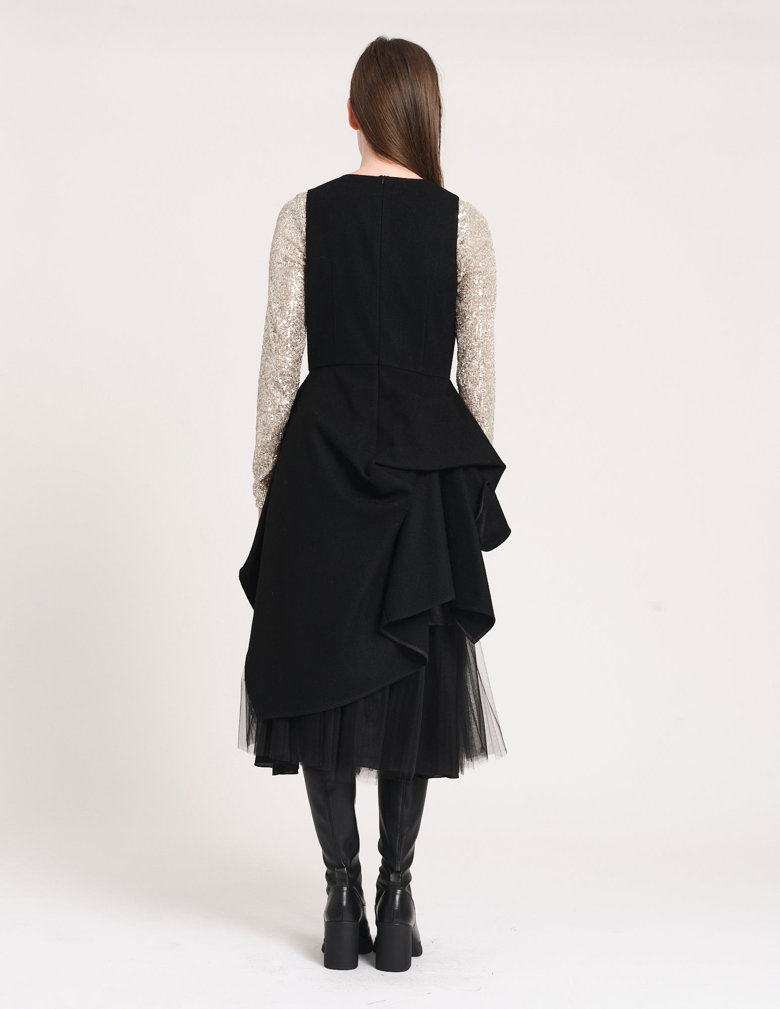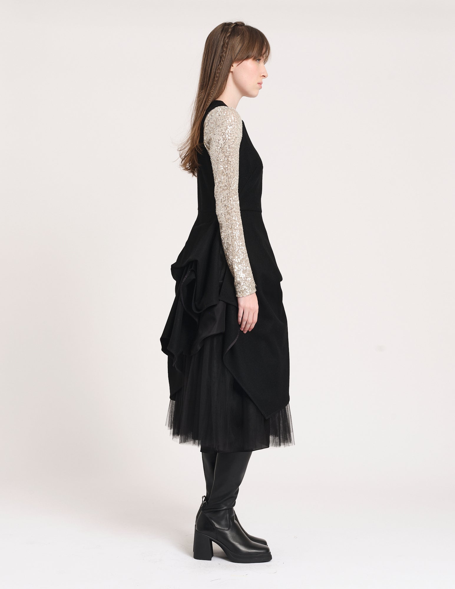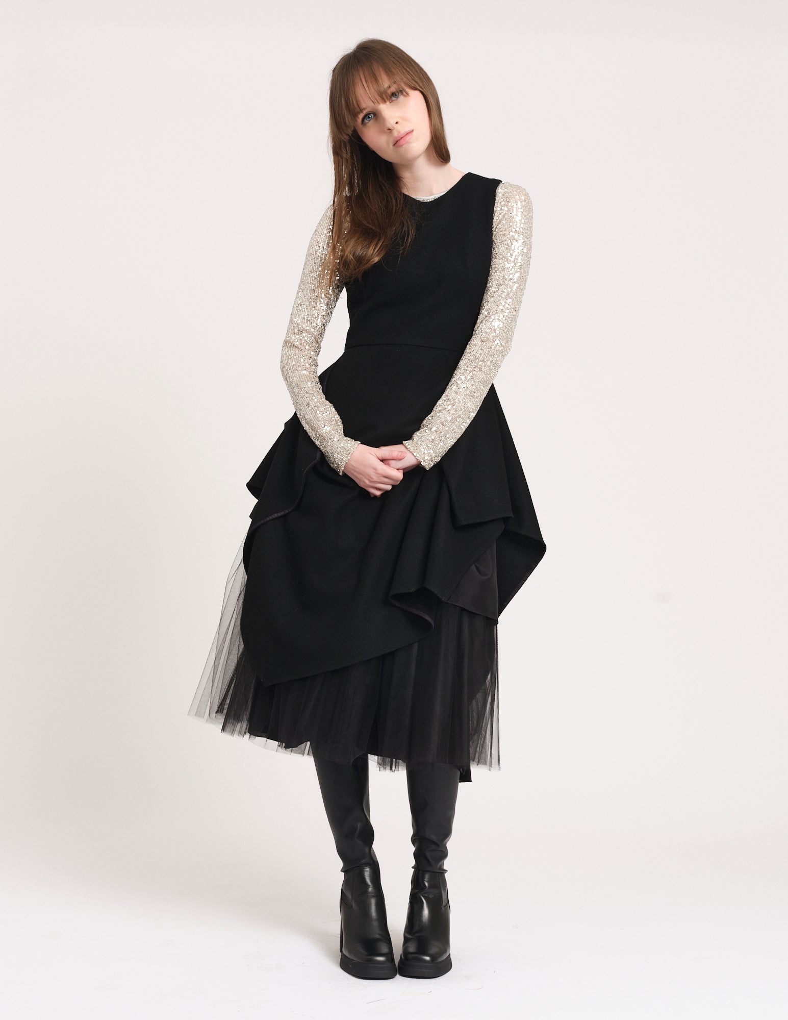short wool flannel dress featuring signature fitted bodice and romantically draped panel skirt. styled with the vivienne top and daphne crinoline.