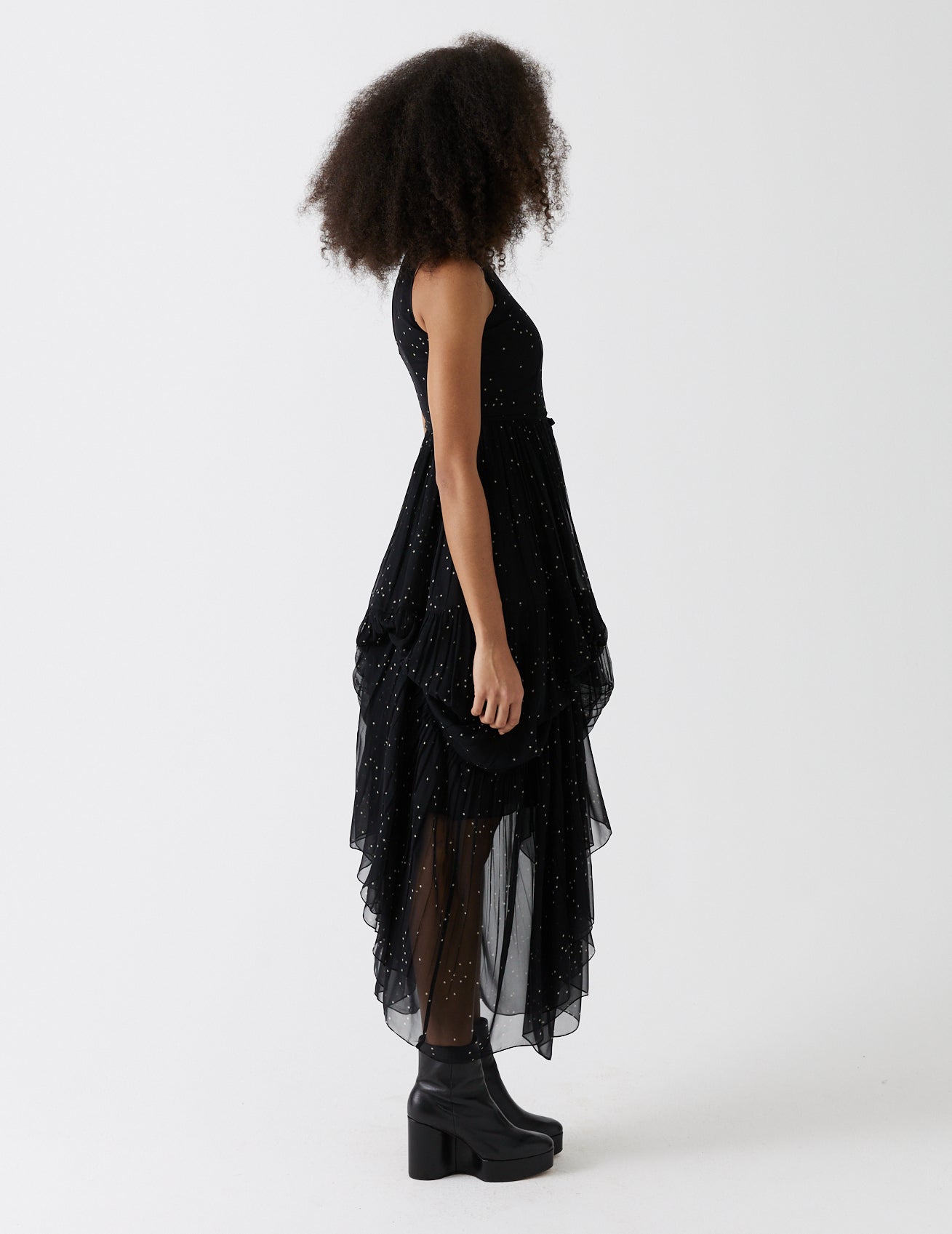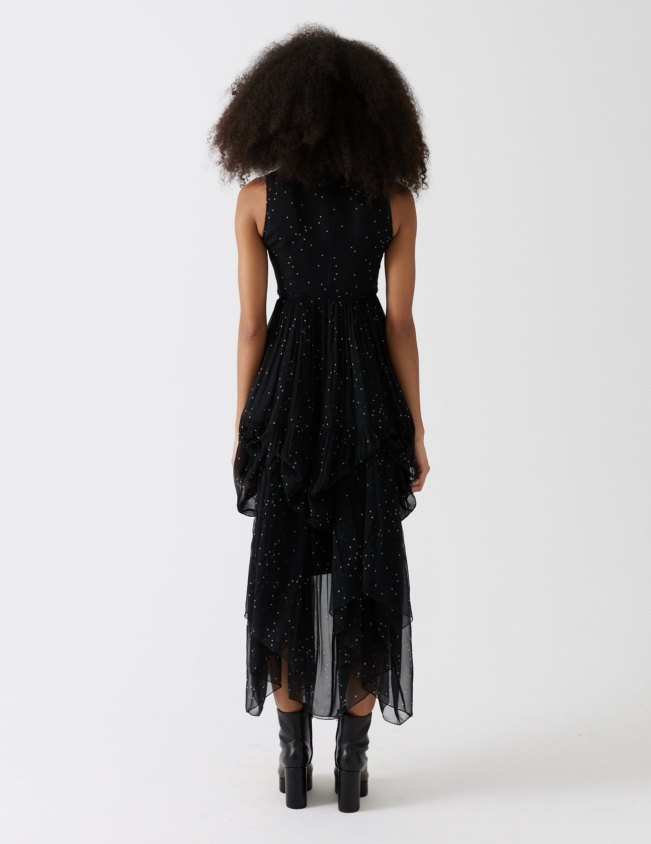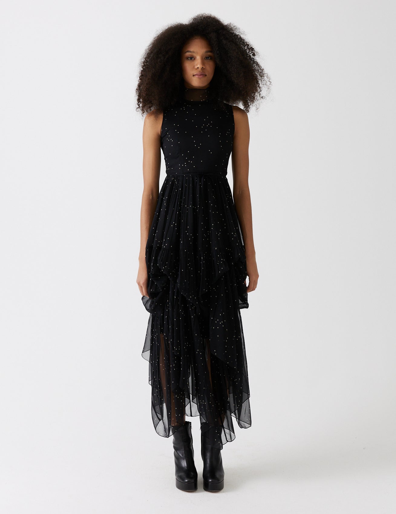 maxi dress with signature chiffon star print, high collar, tiered skirt, and interior ties to create optional drapery.