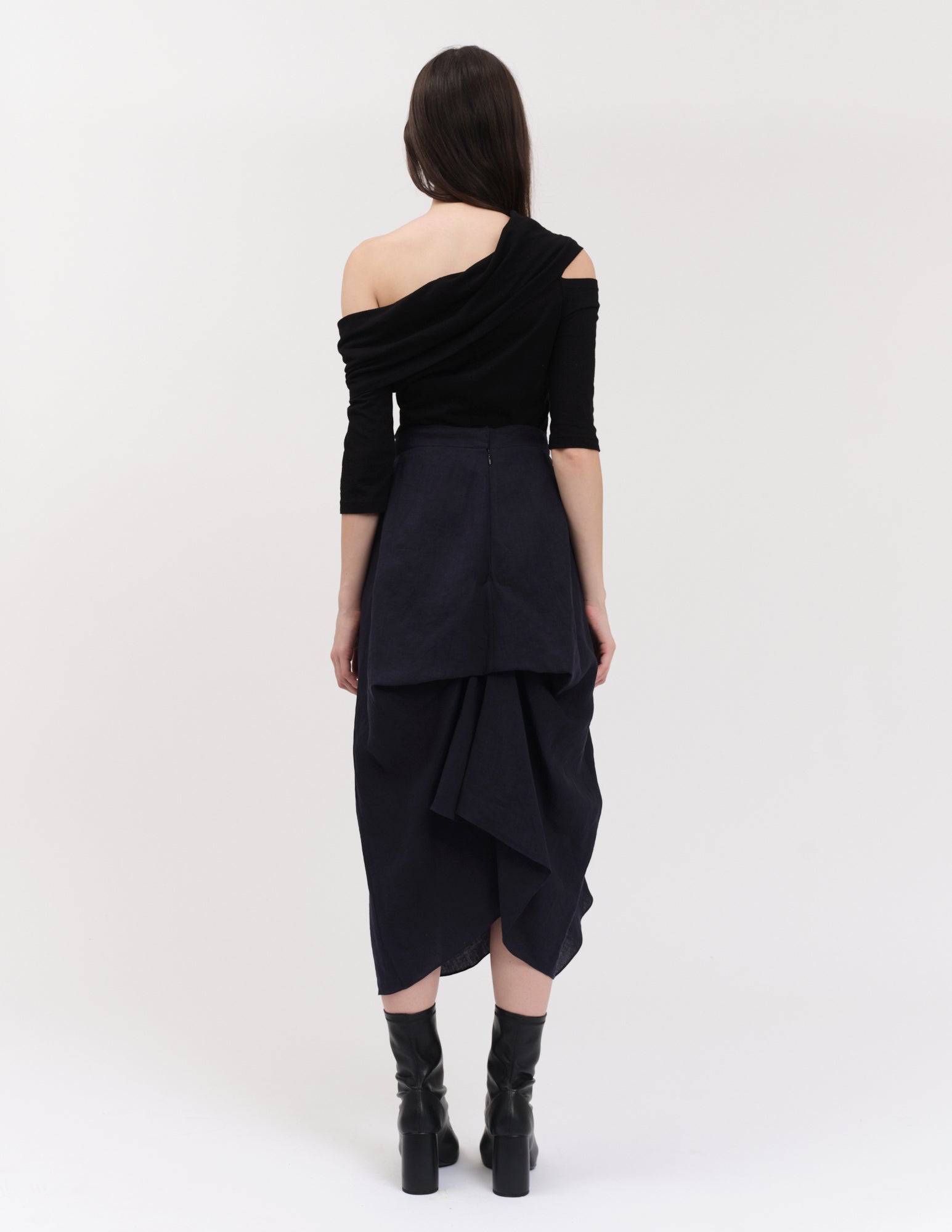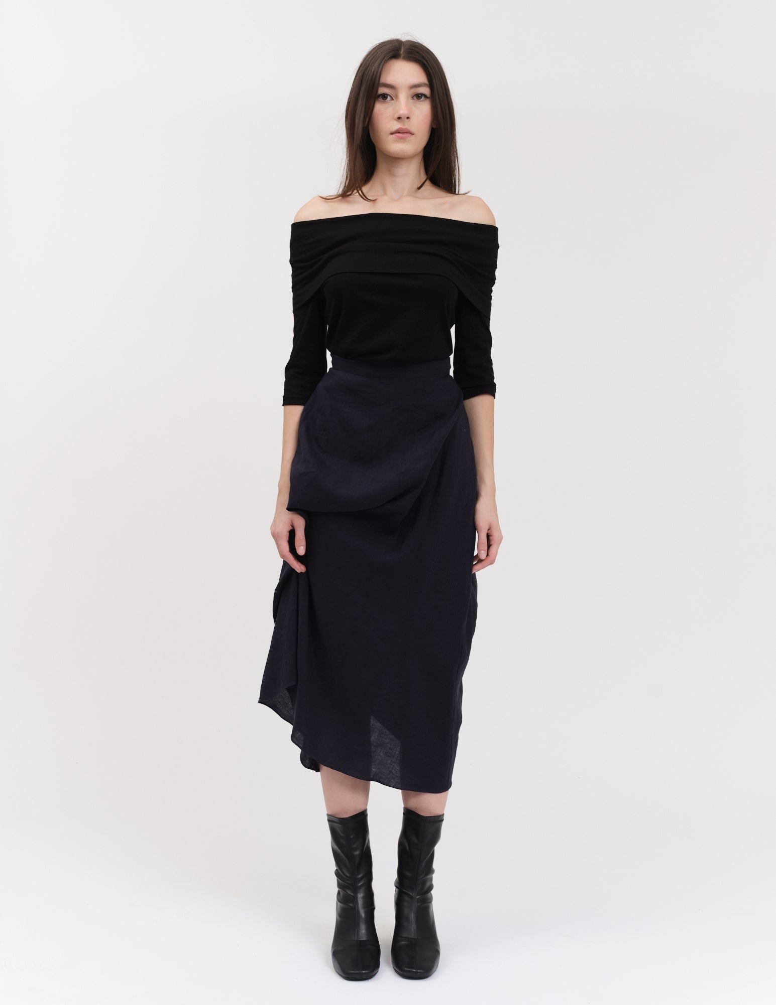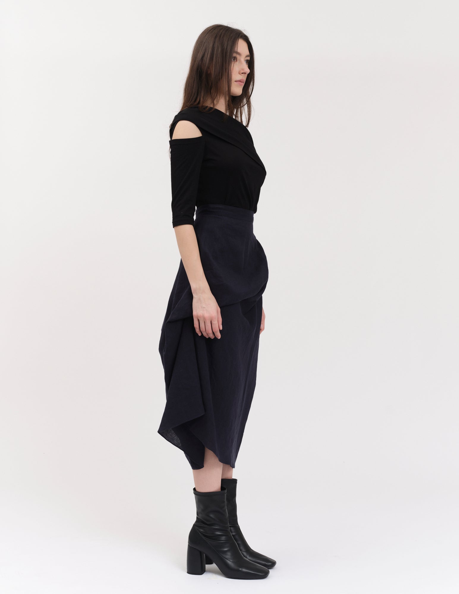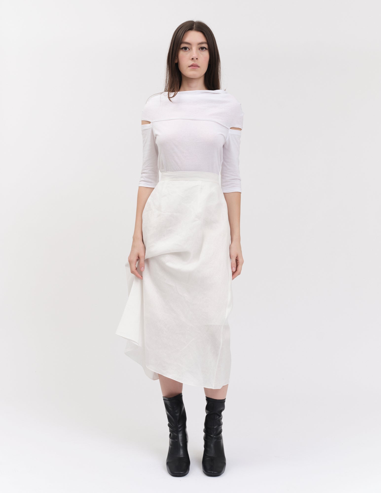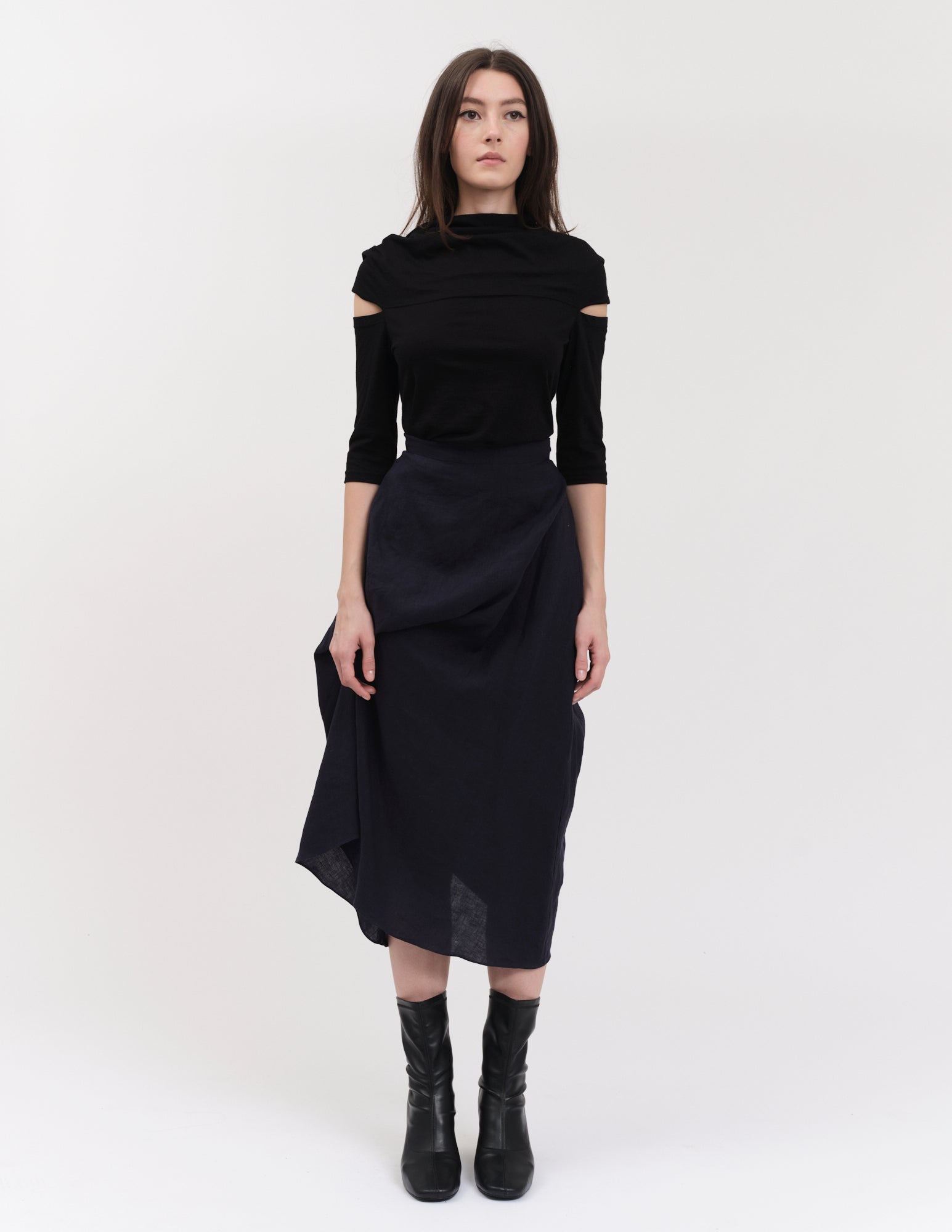 cotton jersey top with quarter length sleeves and a transformative collar that can be worn in many different ways. styled with the aquila skirt.