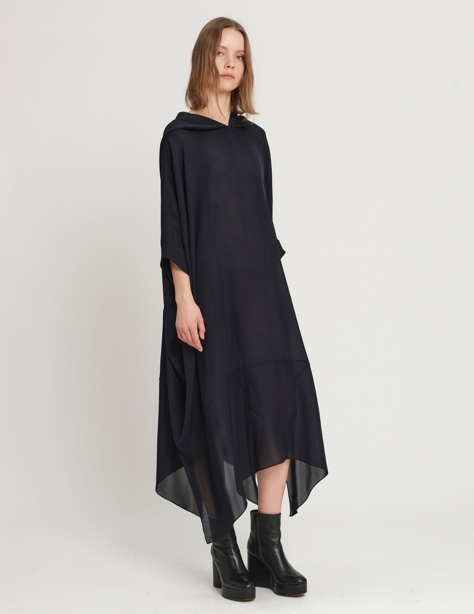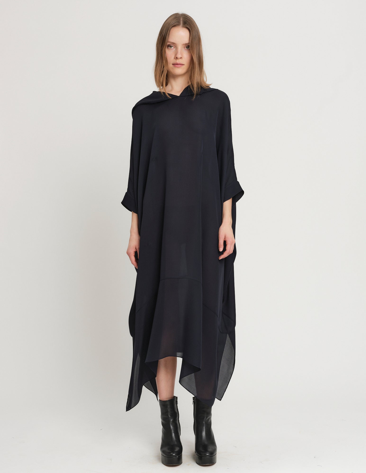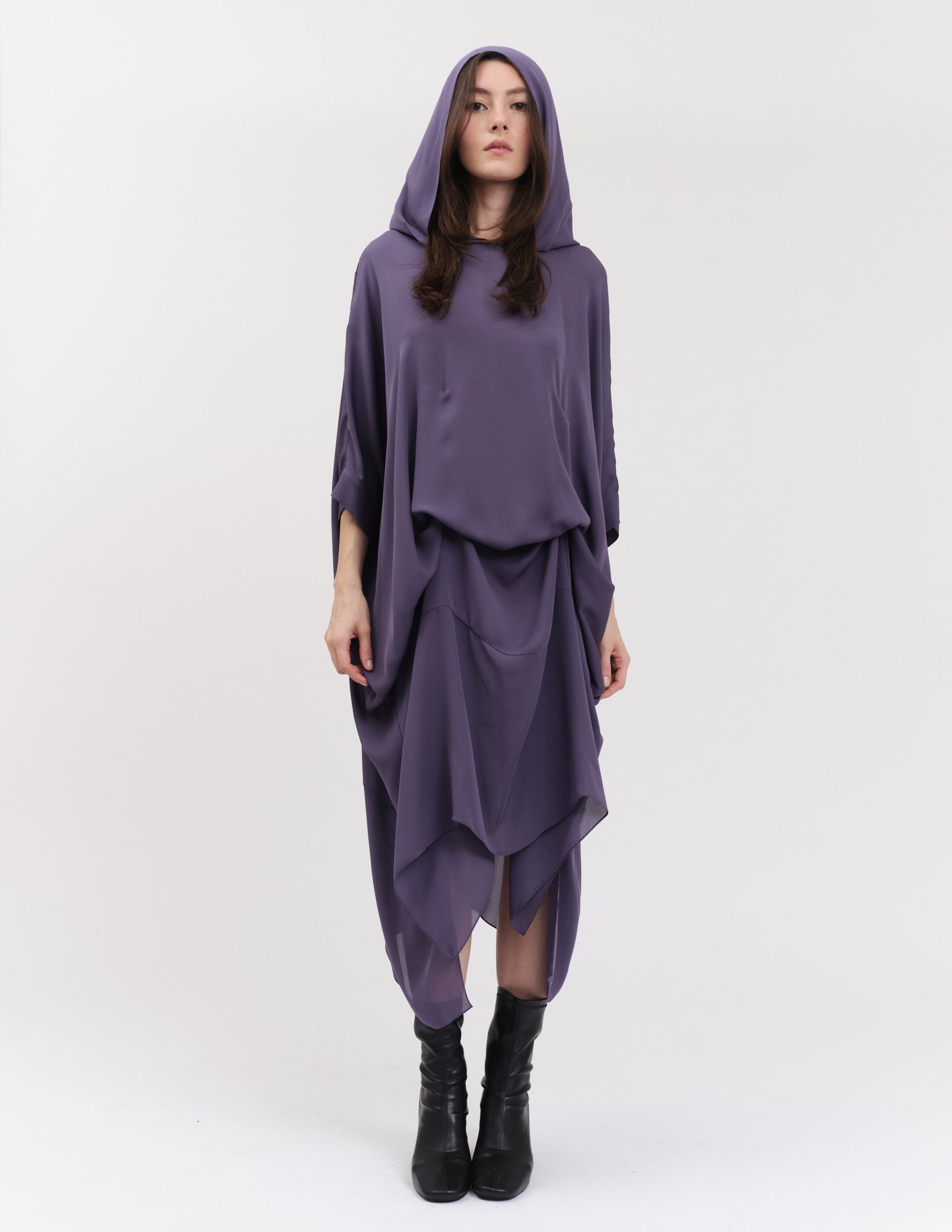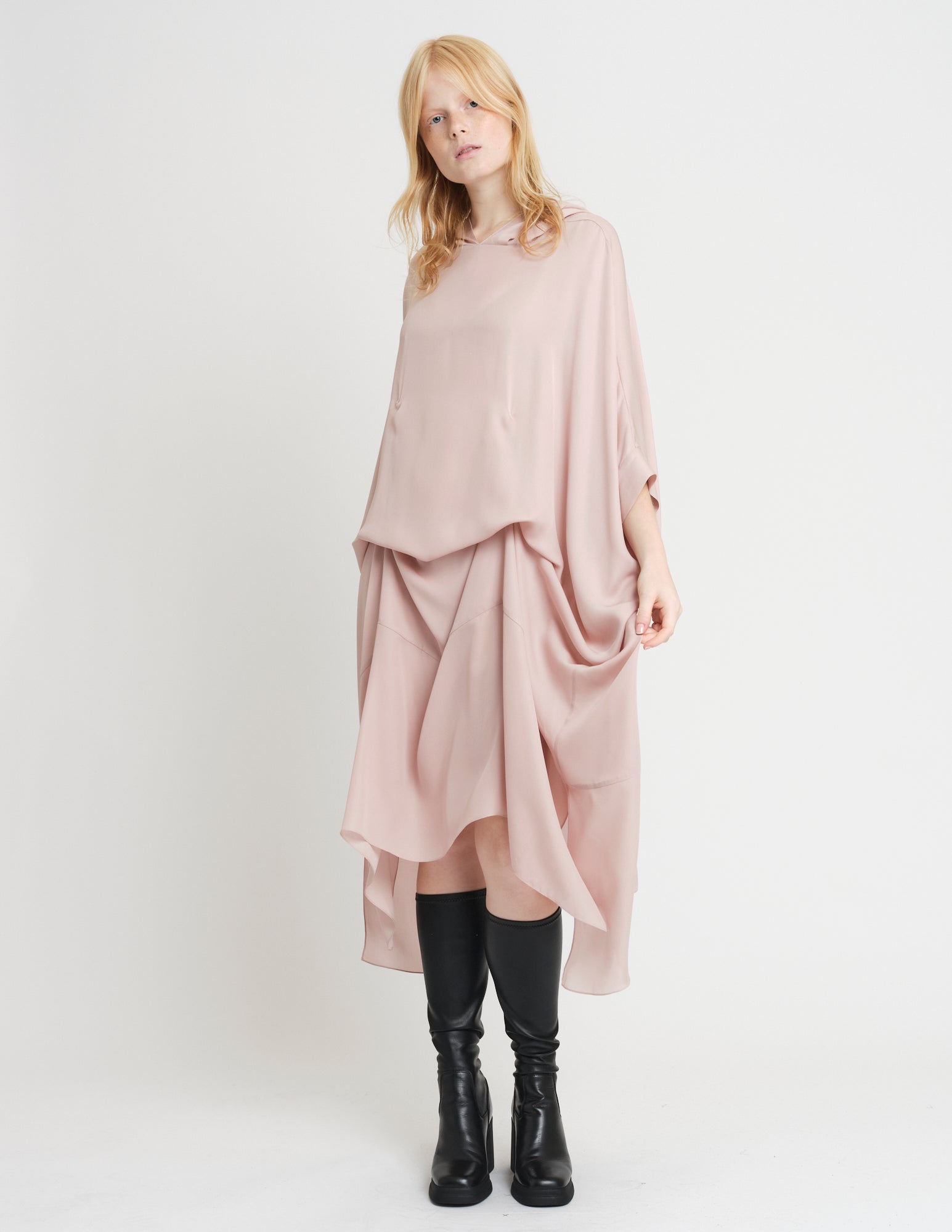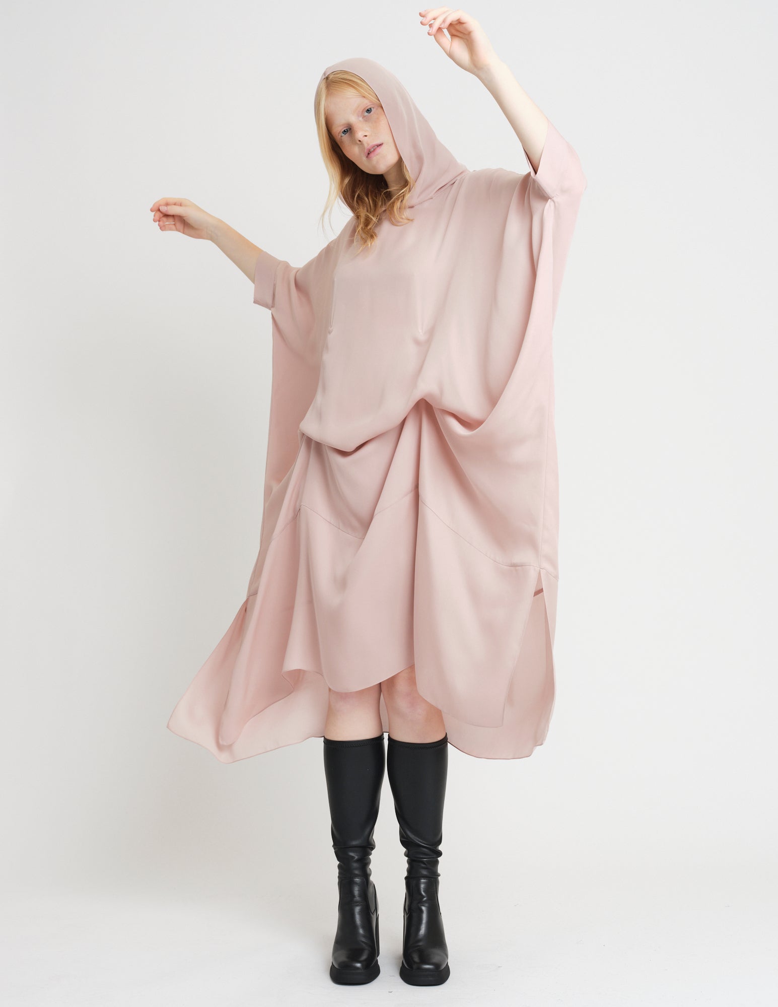 oversized double georgette dress featuring hood and interior ties to create optional drapery. styles on its own or with the daphne crinoline.
