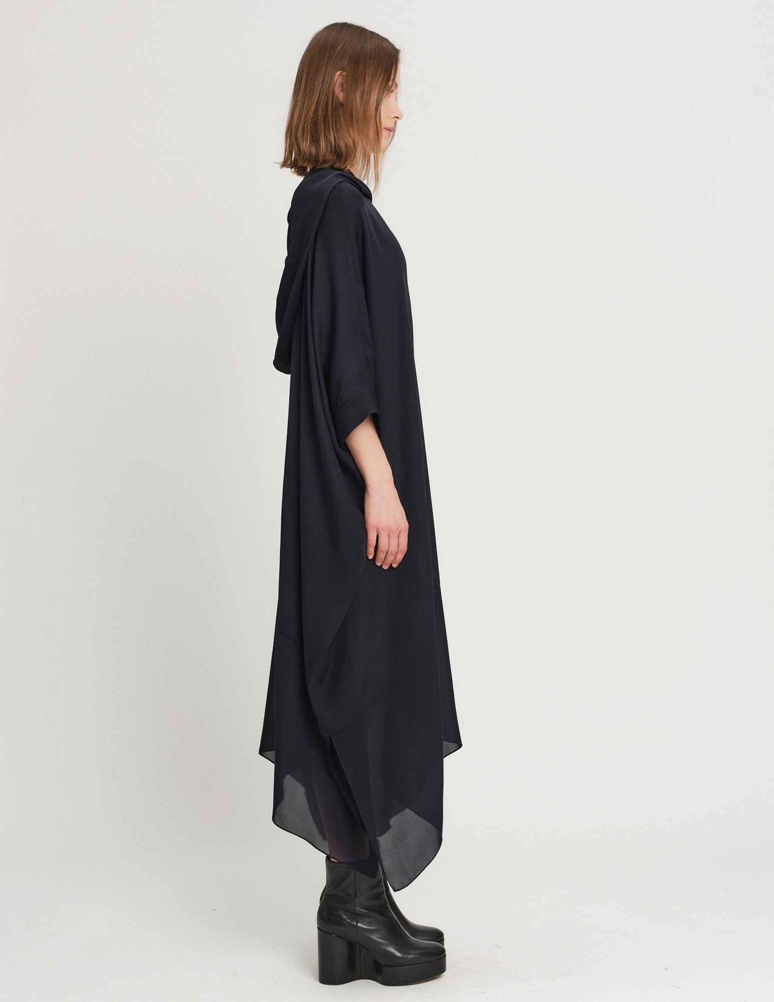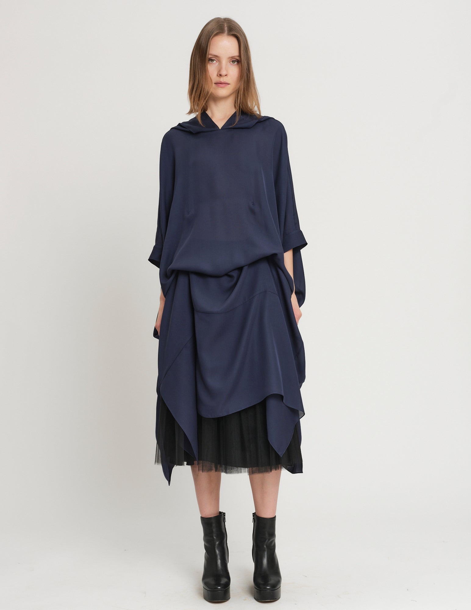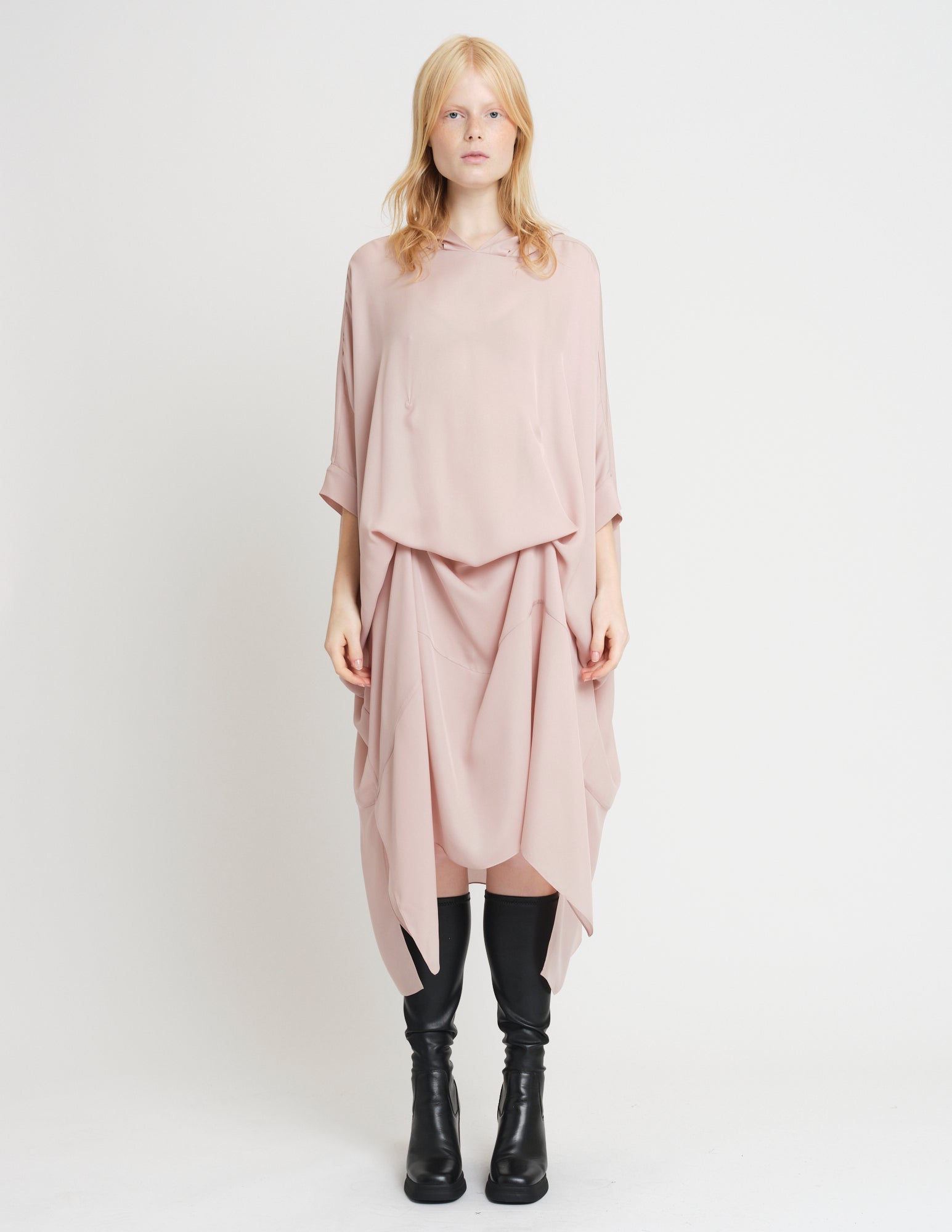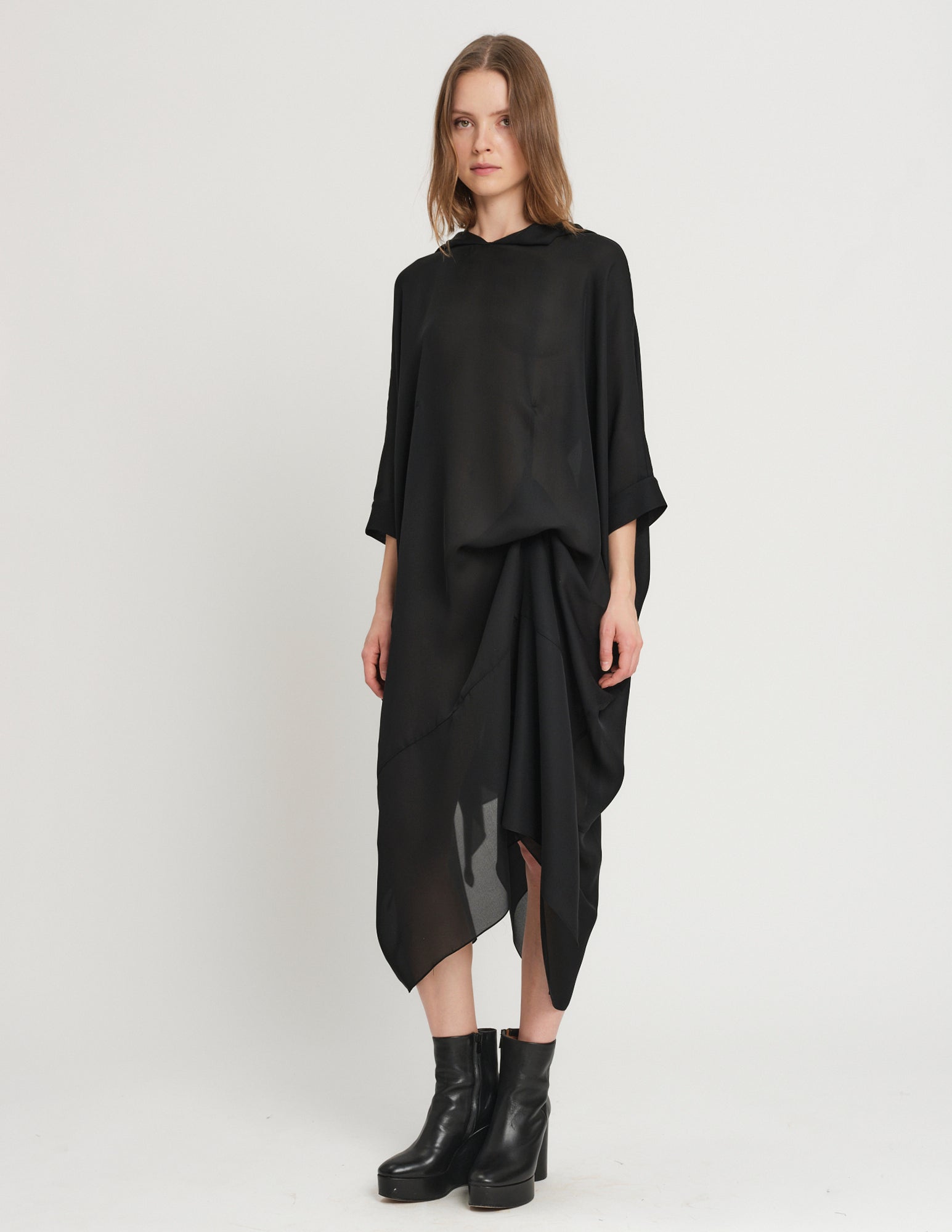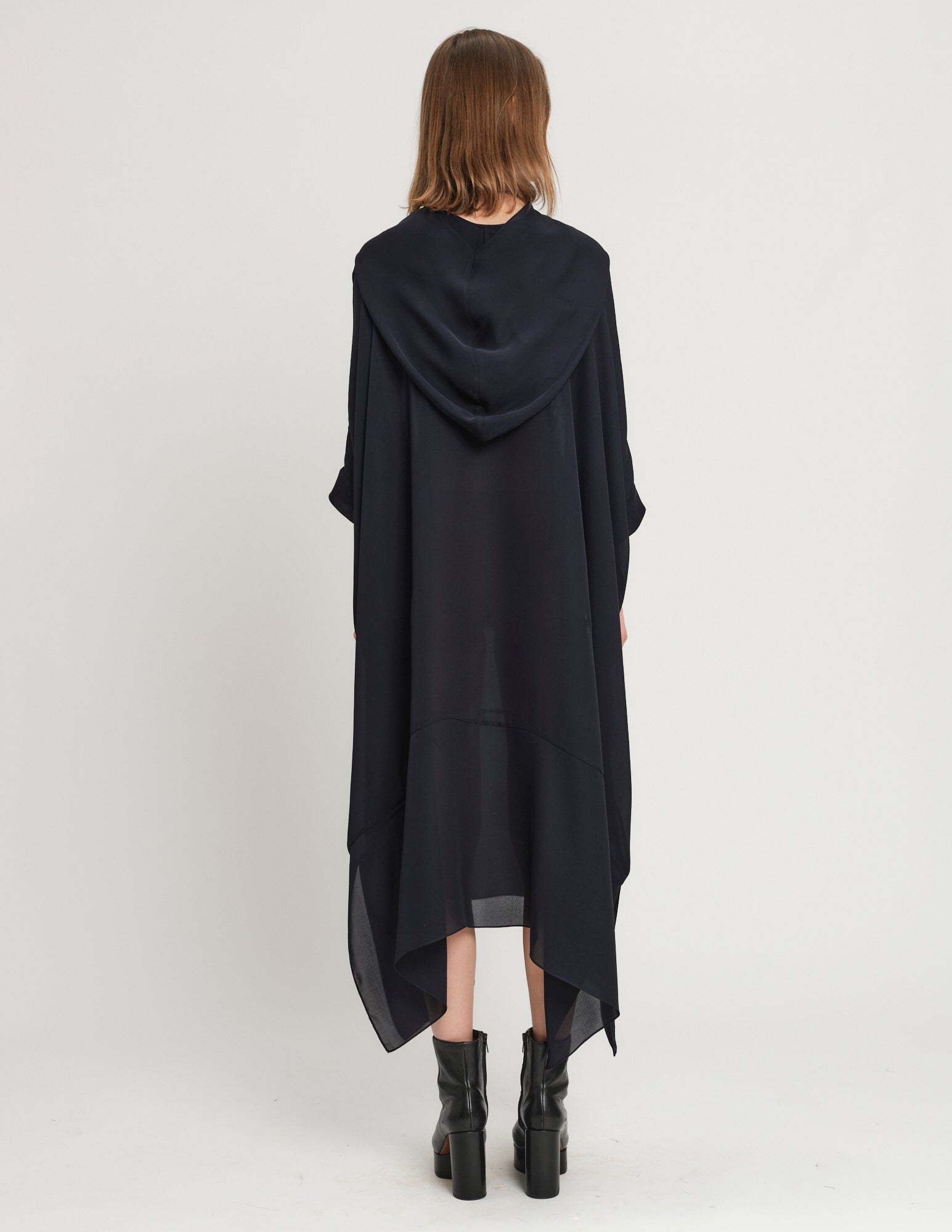 oversized double georgette dress featuring hood and interior ties to create optional drapery. styles on its own or with the daphne crinoline.