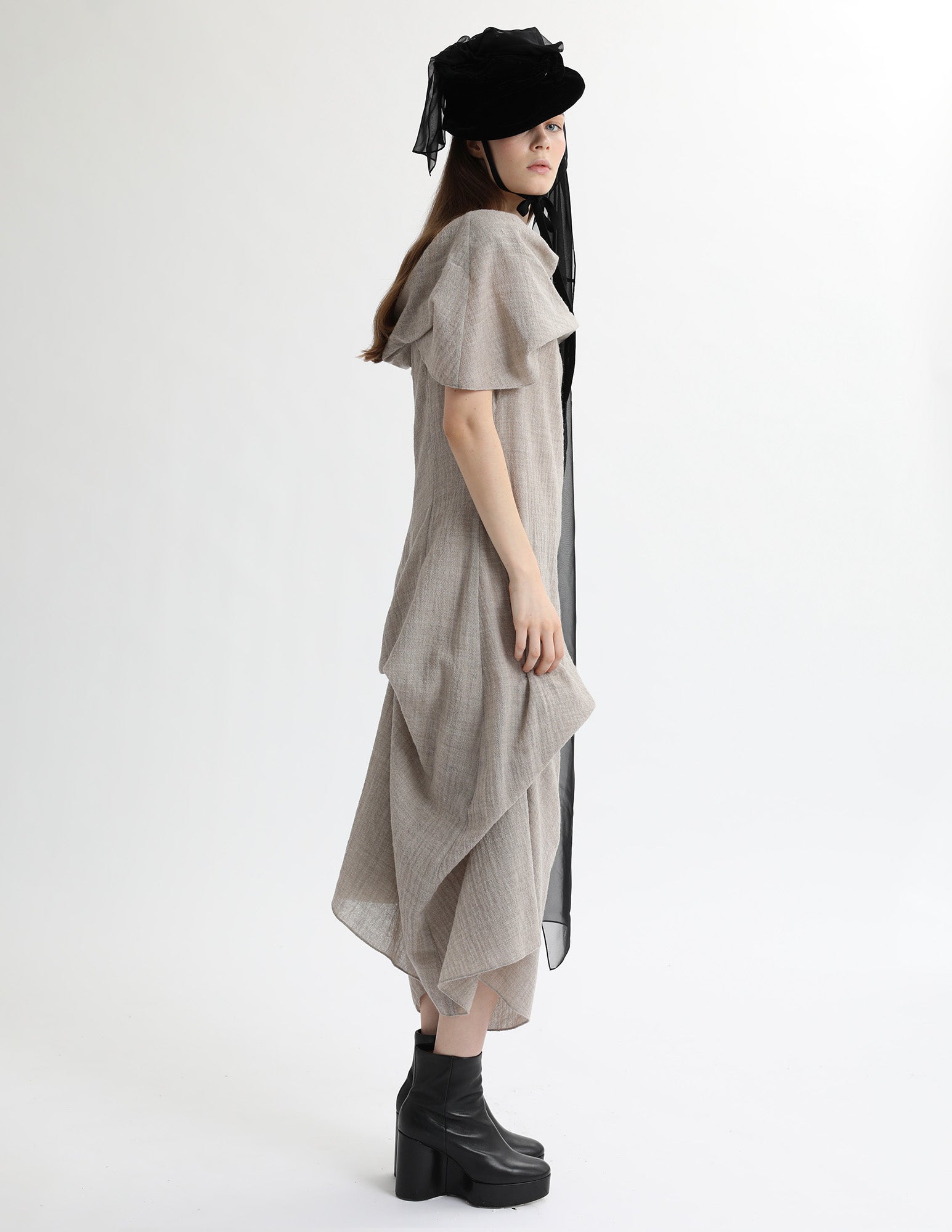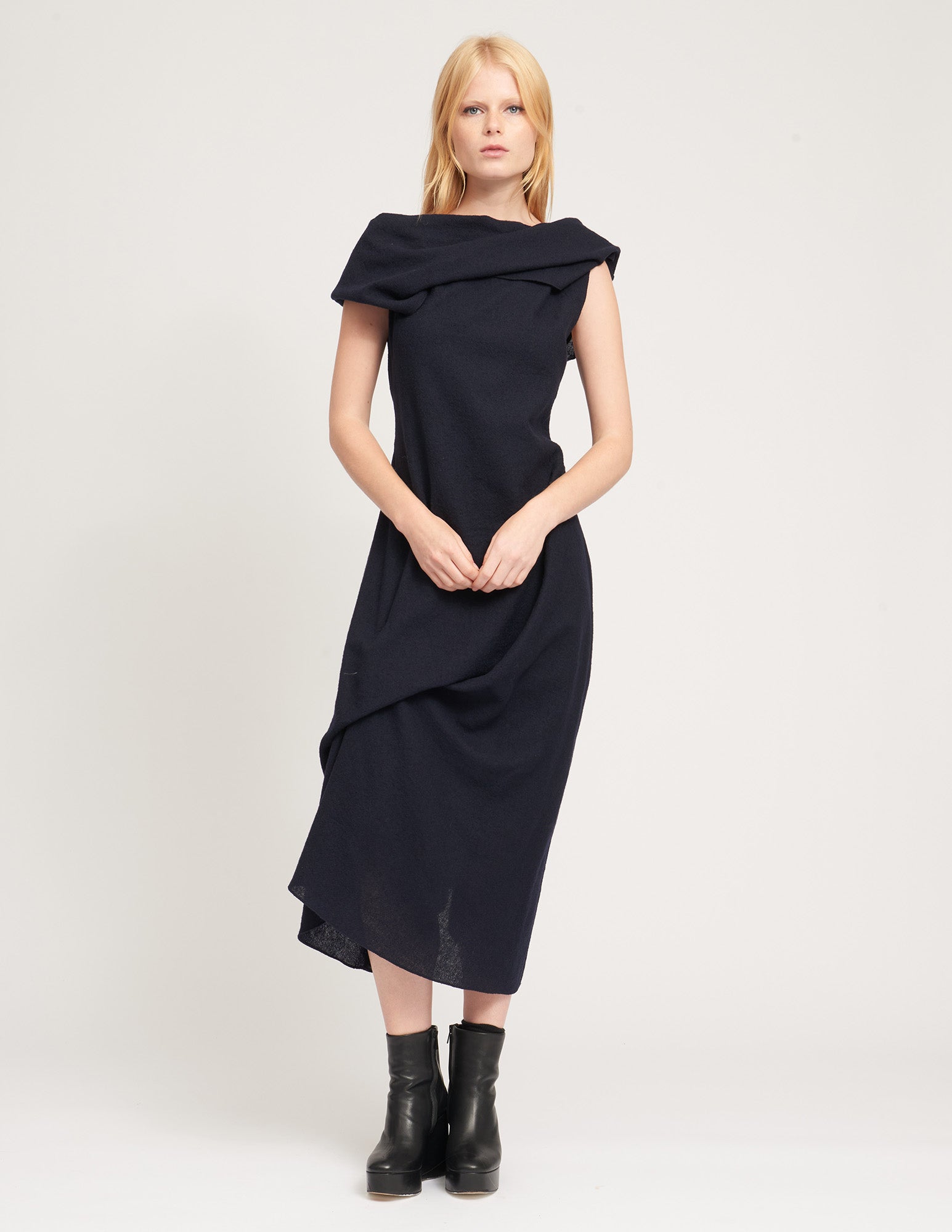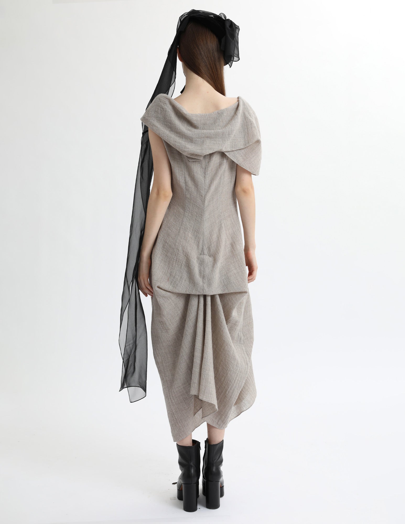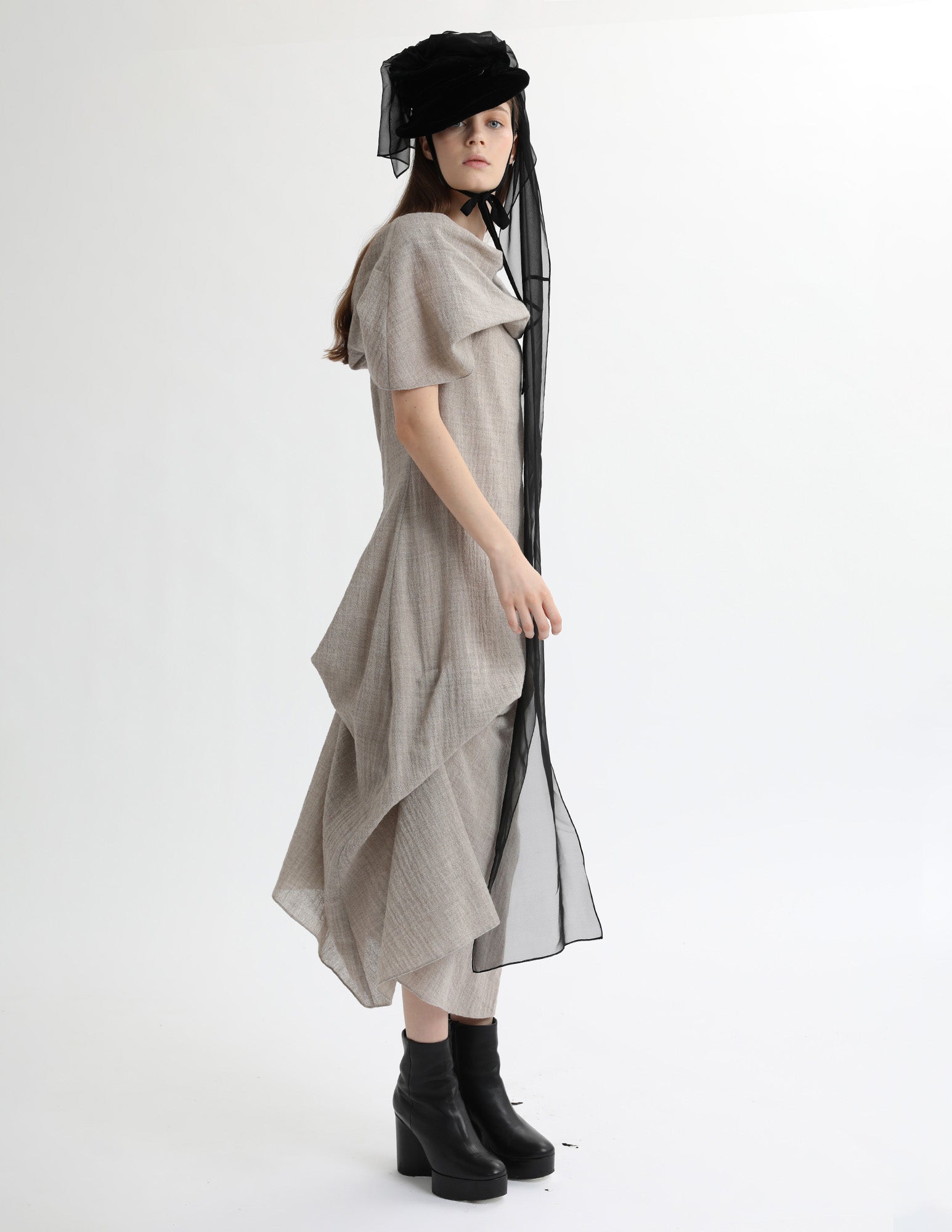 maxi dress with a fitted silhouette, a fixed drape, and an oversized cowl neckline. styled with the maurice hat.