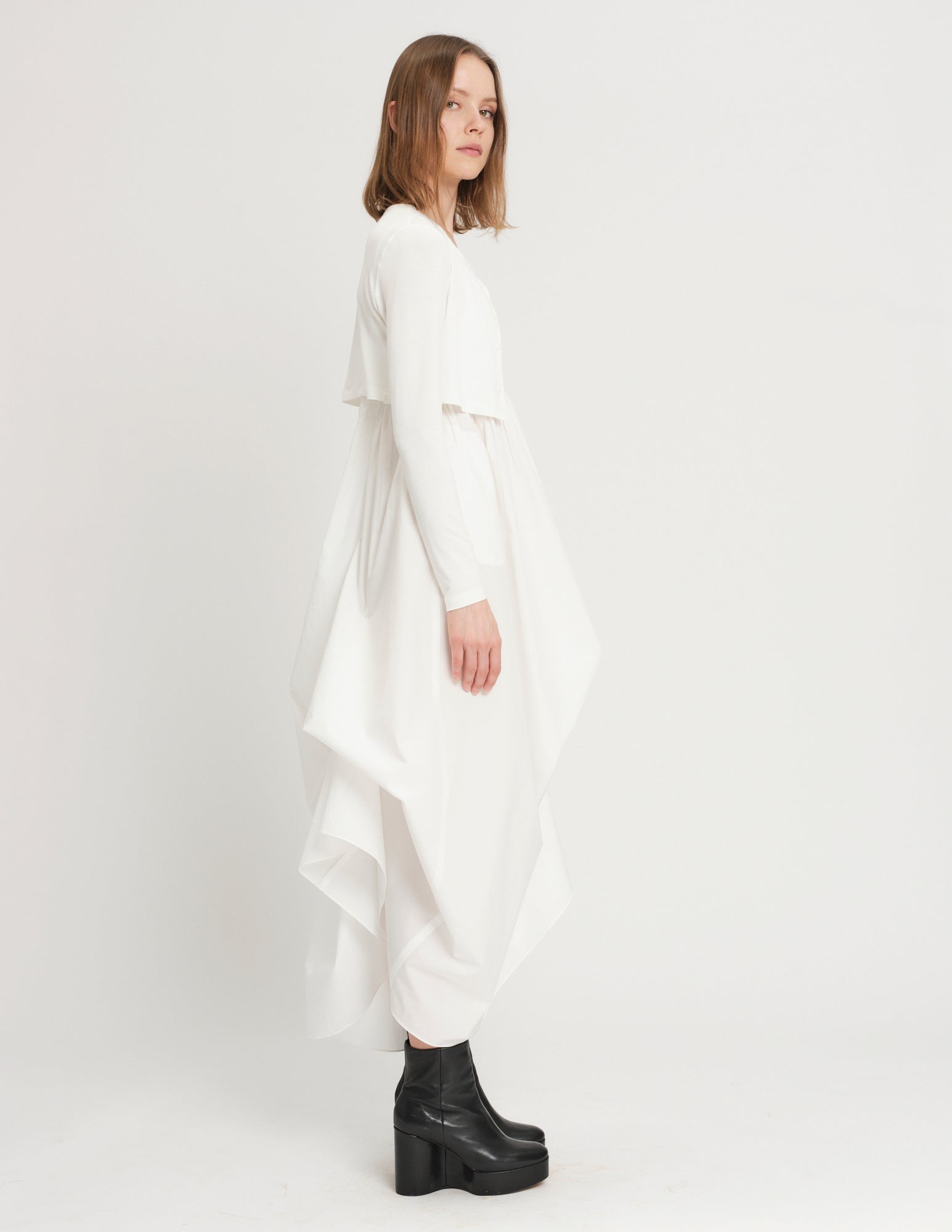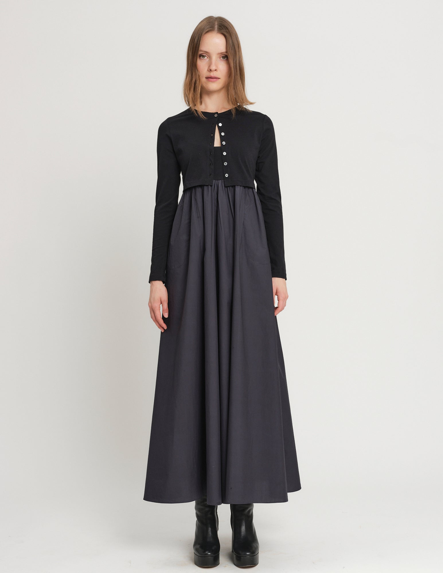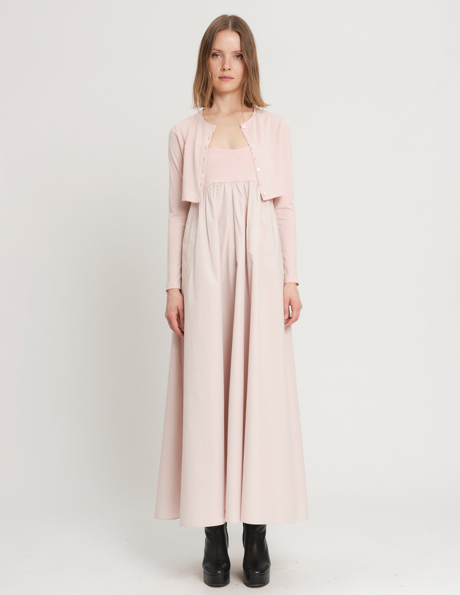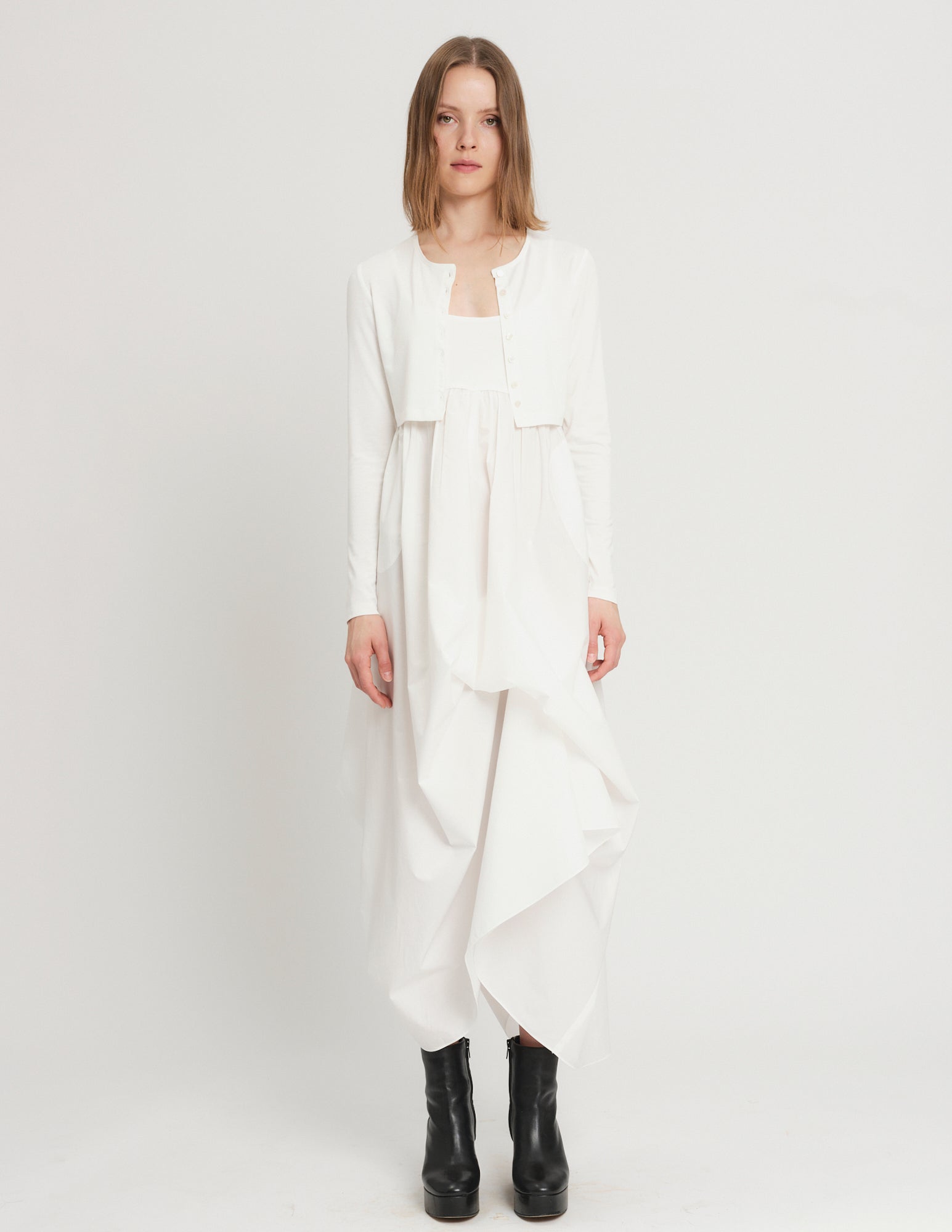 crafted from cotton jersey, the ivy is a fitted cropped cardigan featuring delicate mother of pearl button closures. styled with the hydra dress.