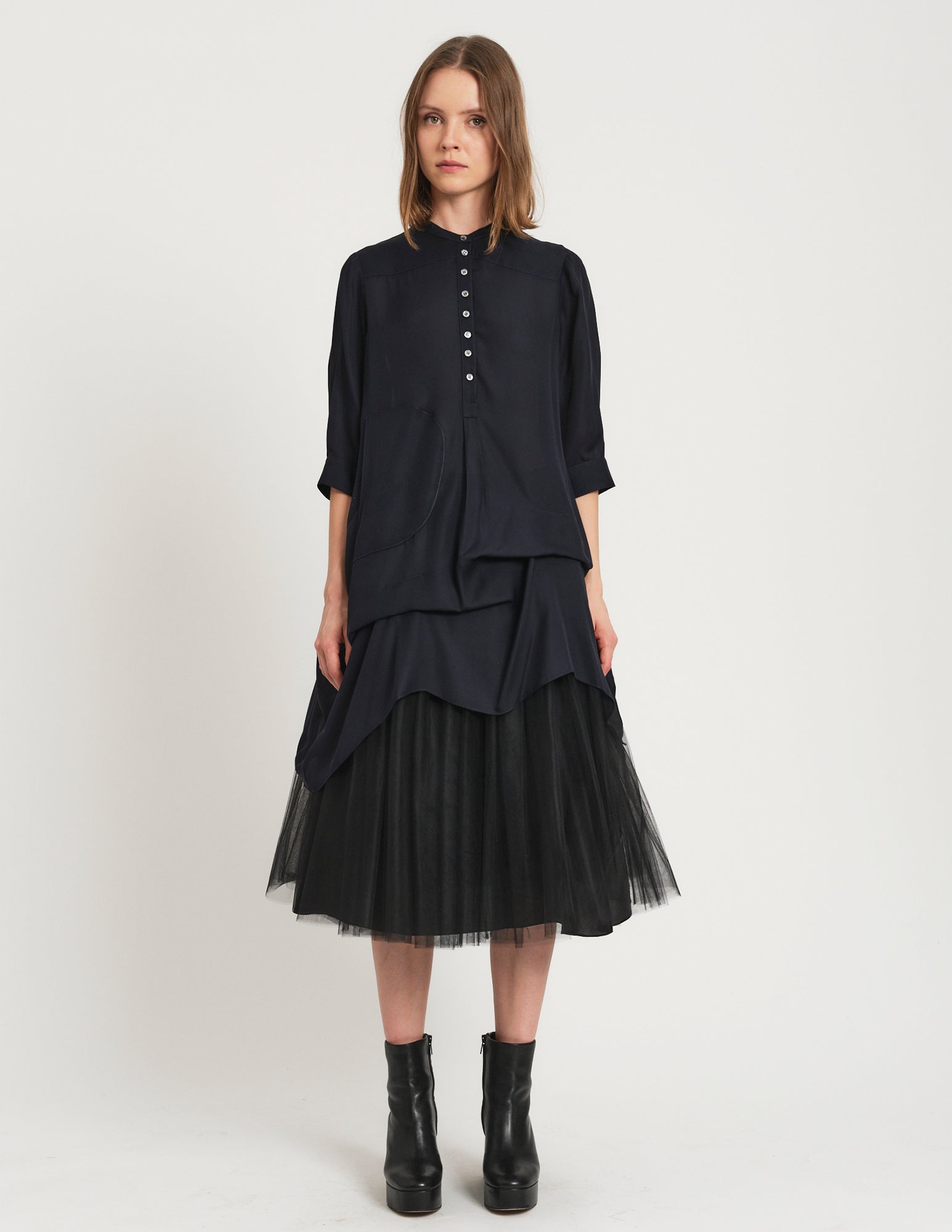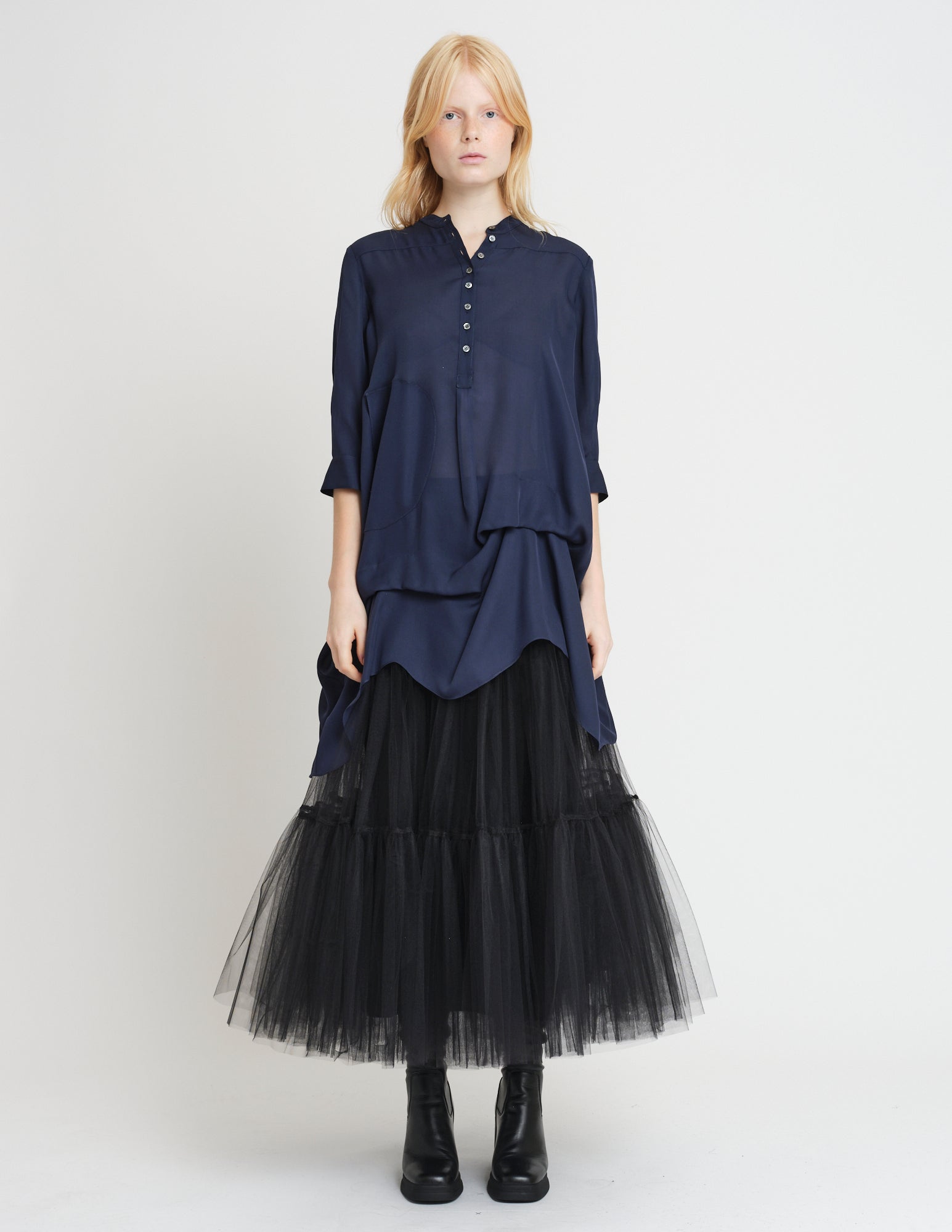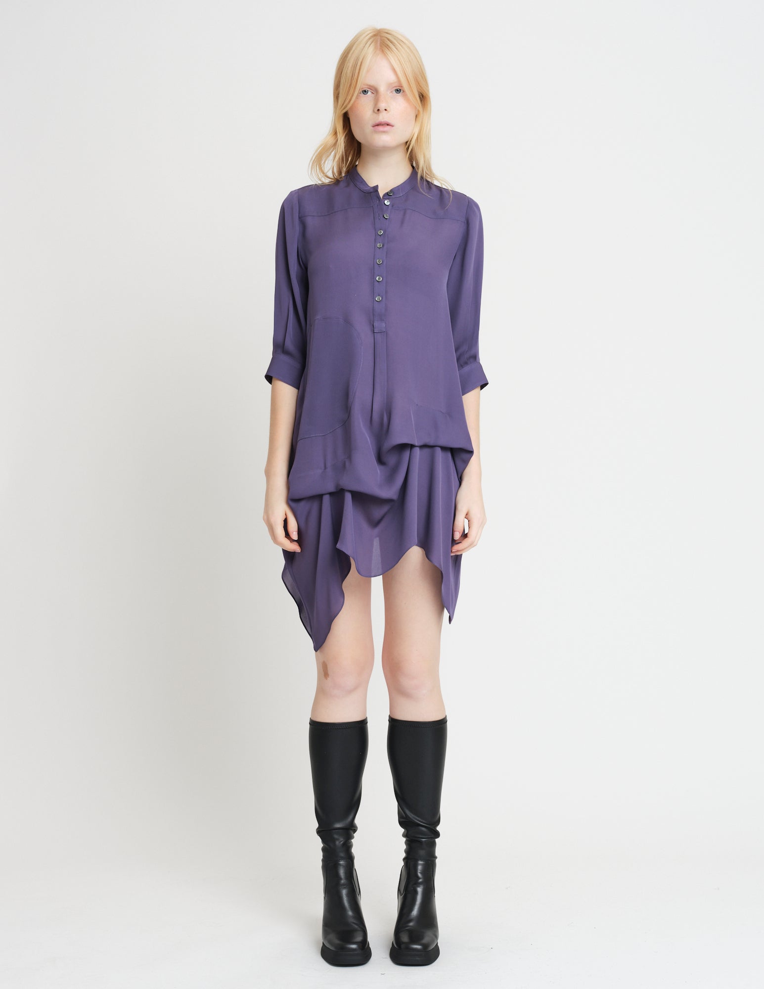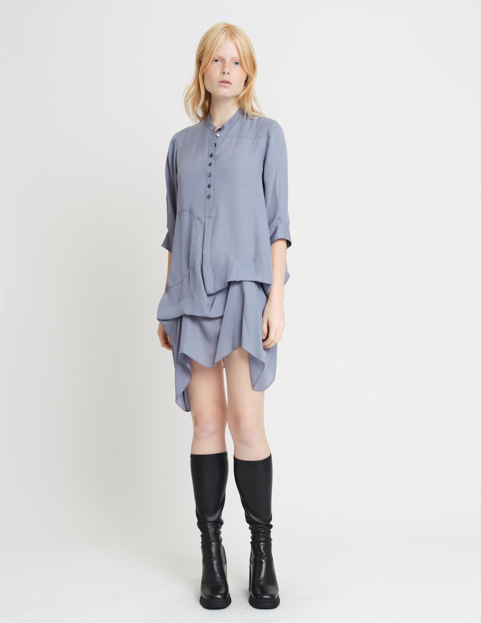 oversized tunic with front button closures and asymmetrical drapes. featuring three-quarter length sleeves, crew neckline, and button cuffs.