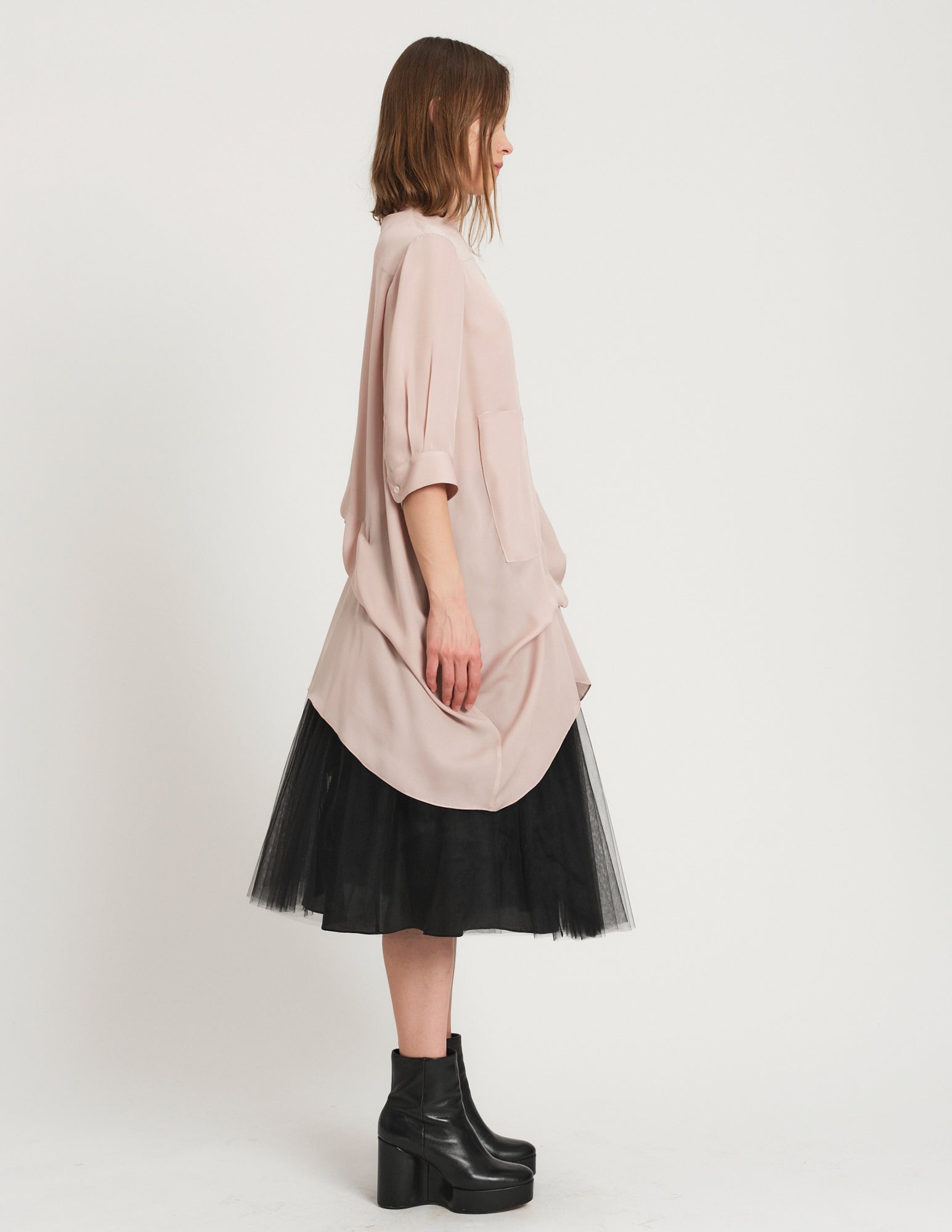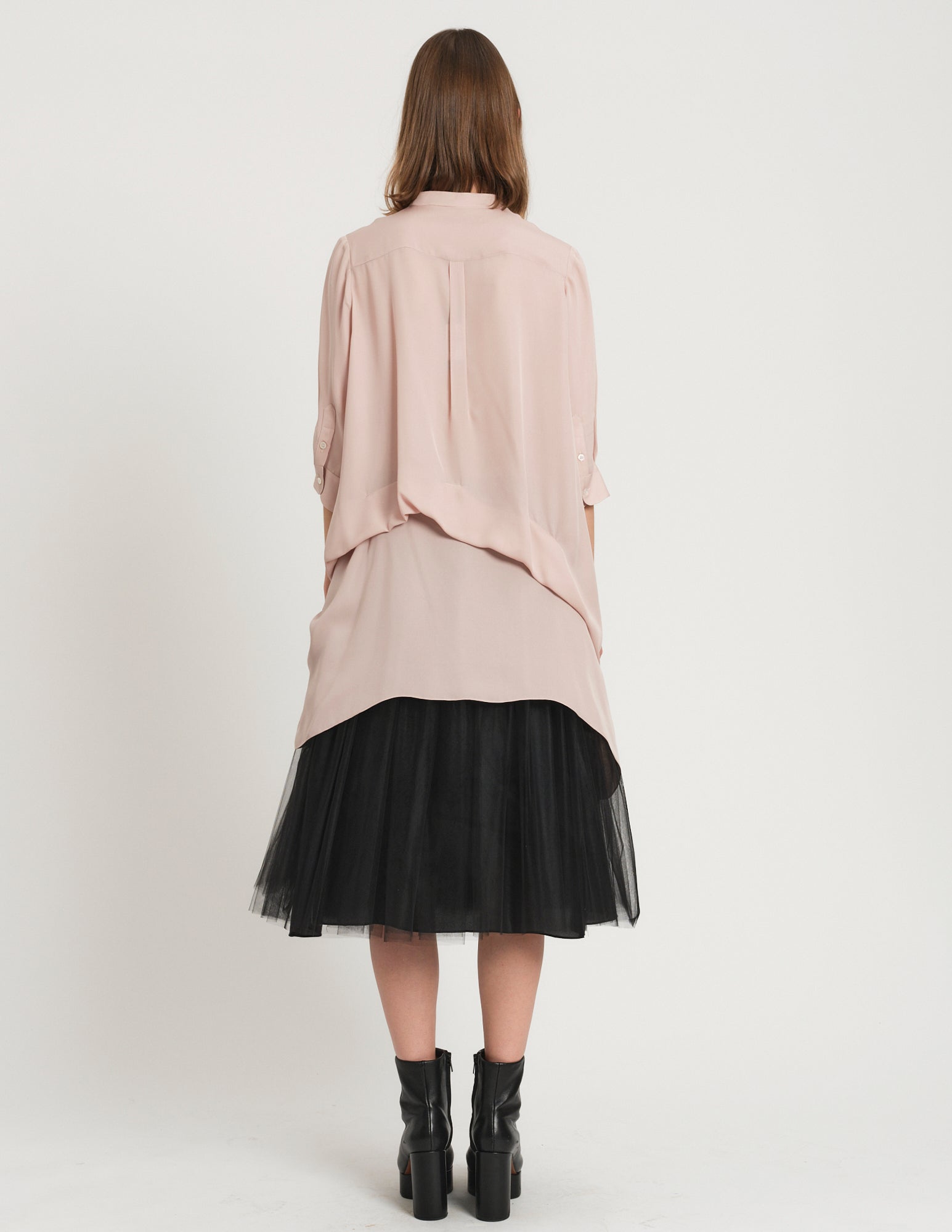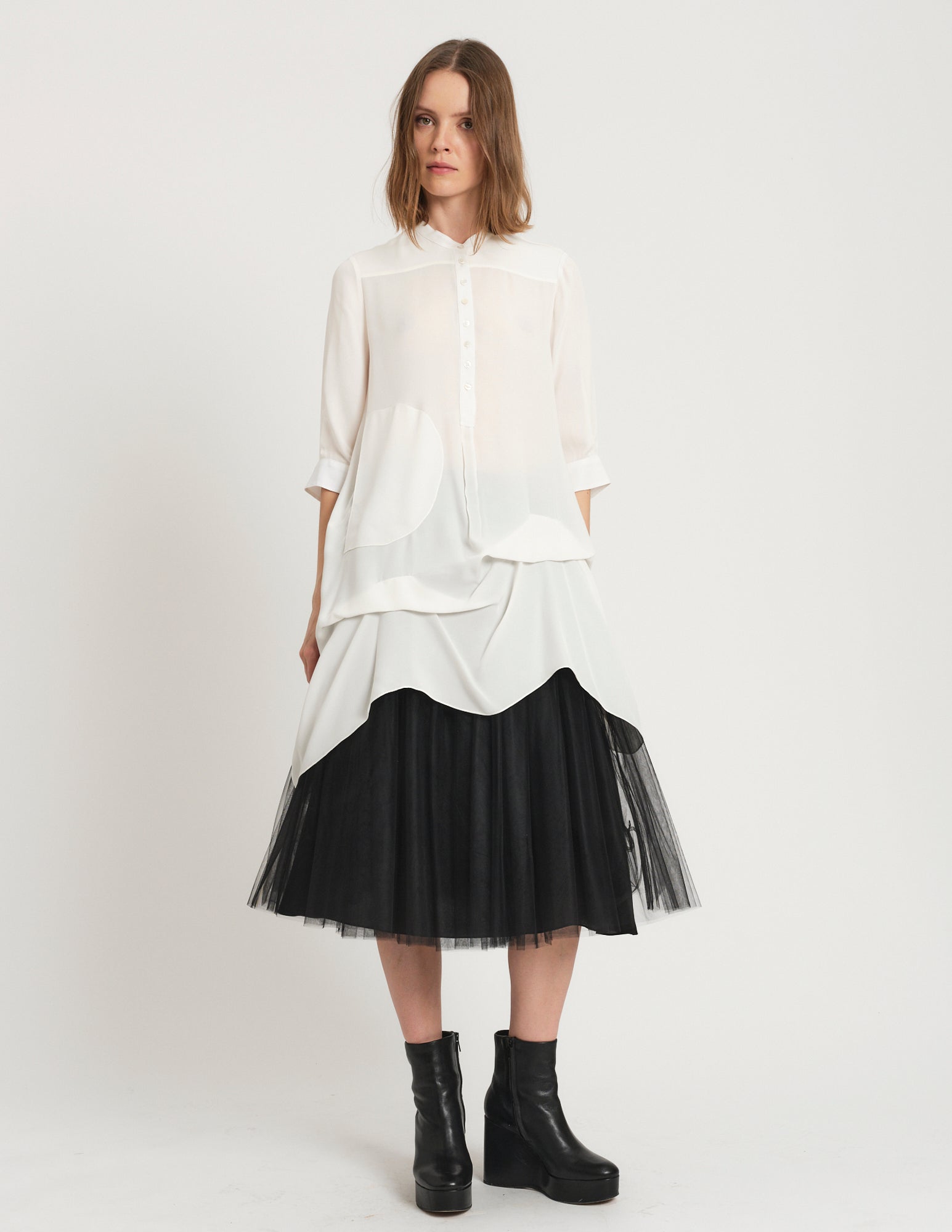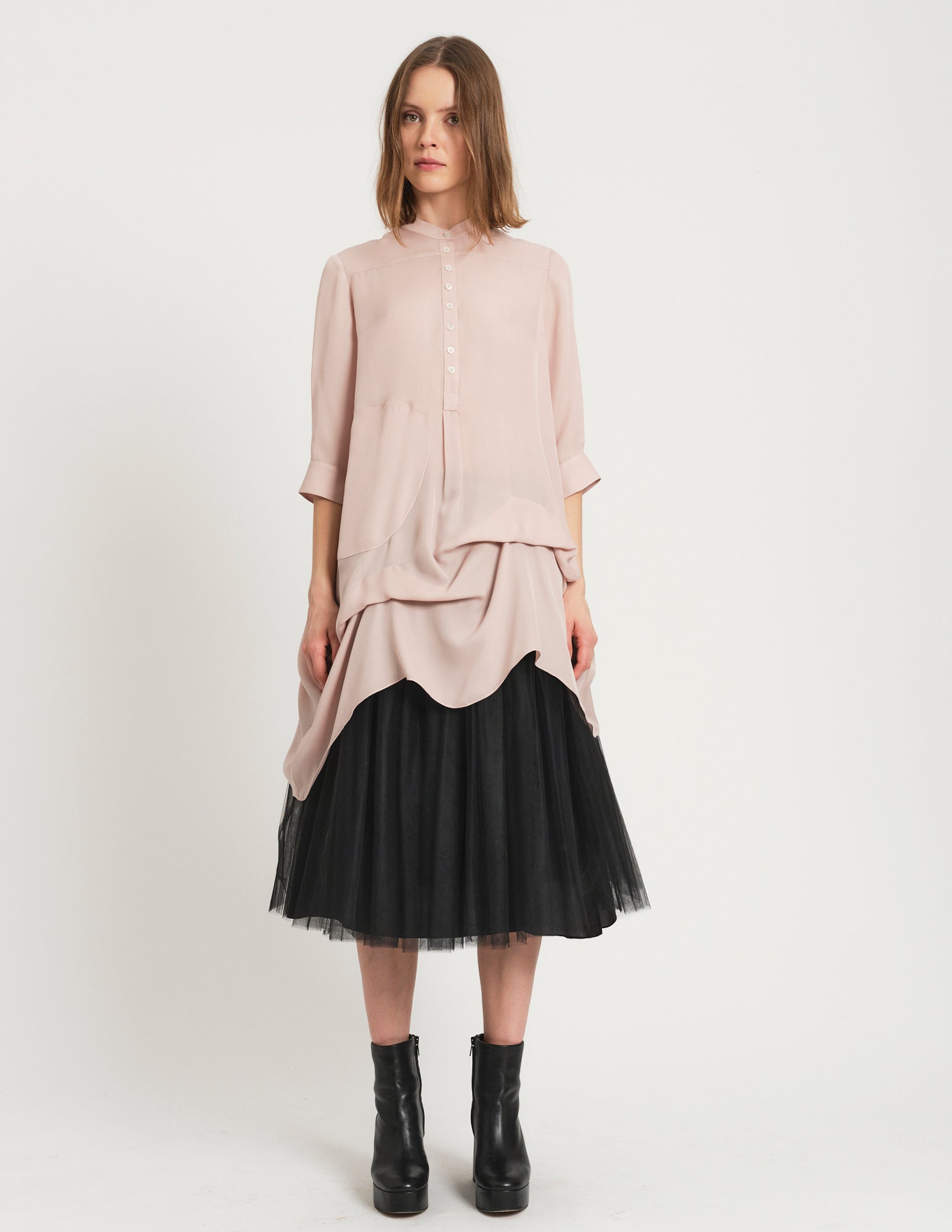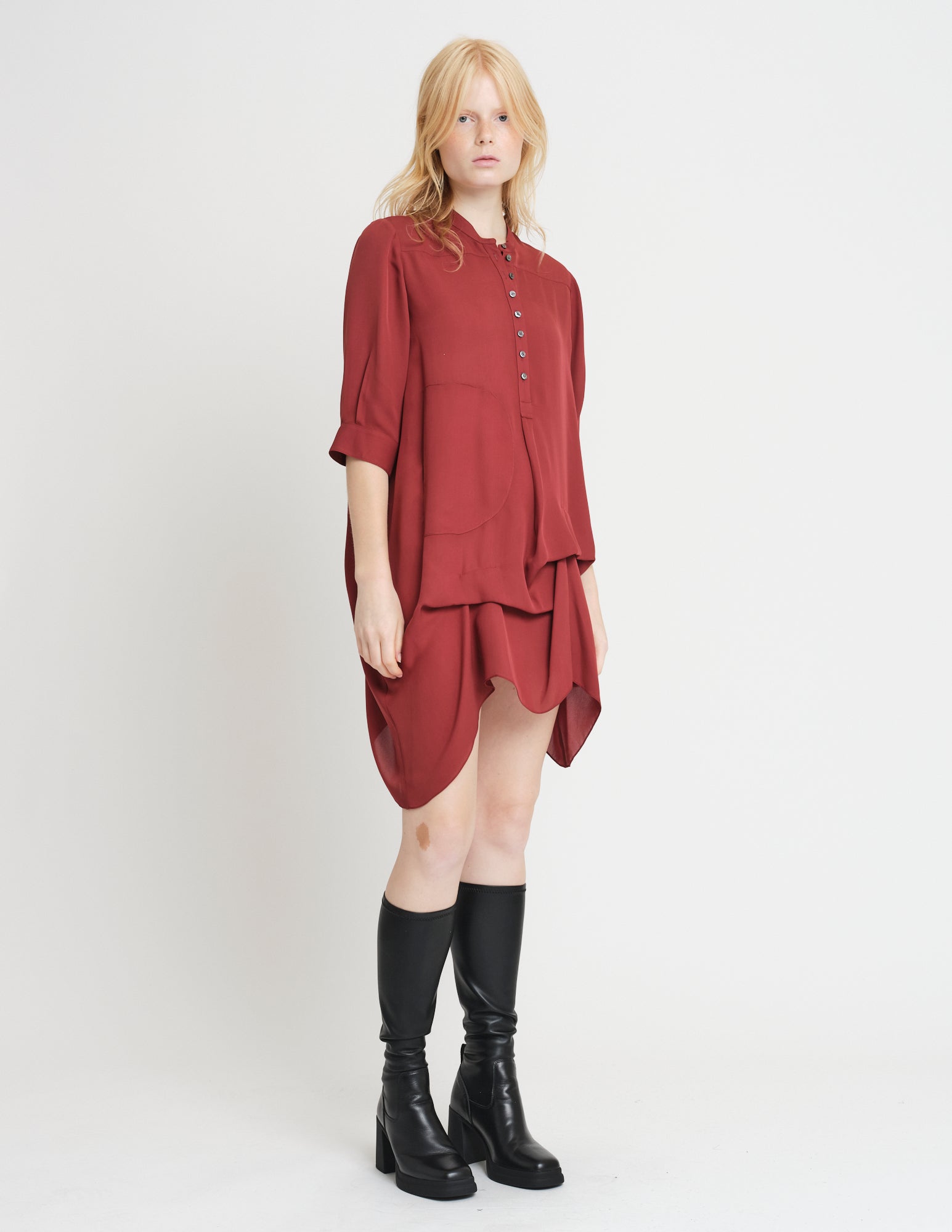 oversized tunic with front button closures and asymmetrical drapes. featuring three-quarter length sleeves, crew neckline, and button cuffs.