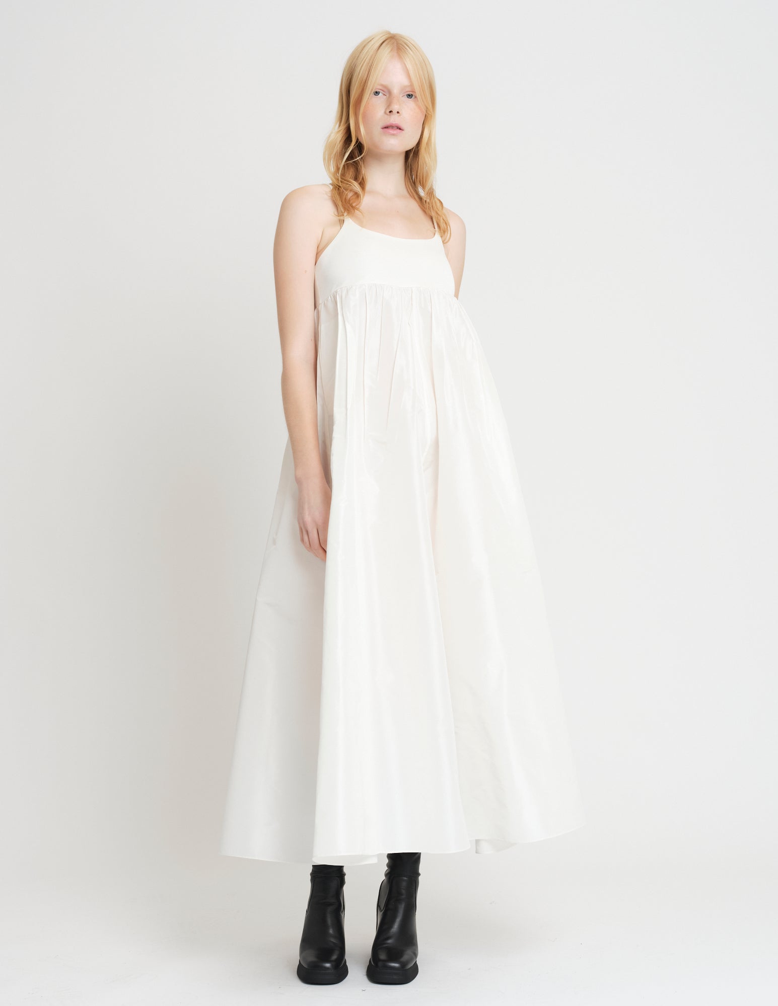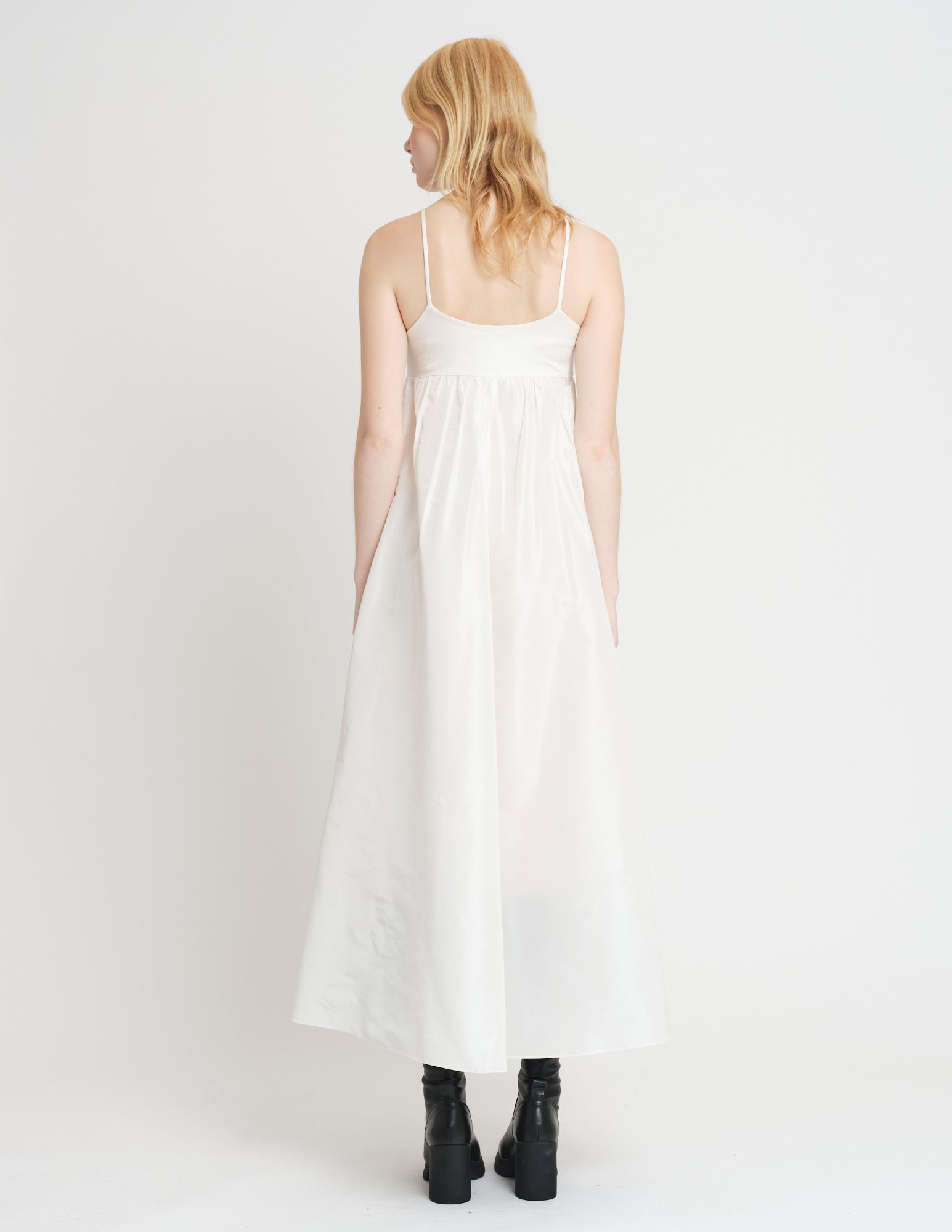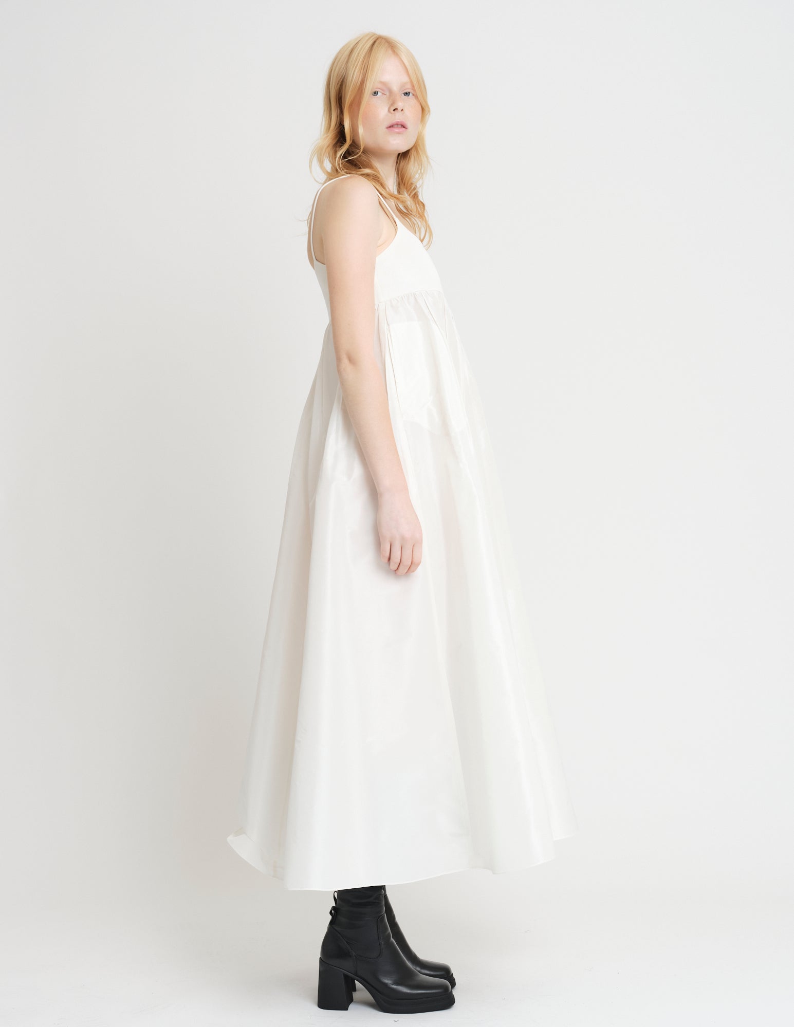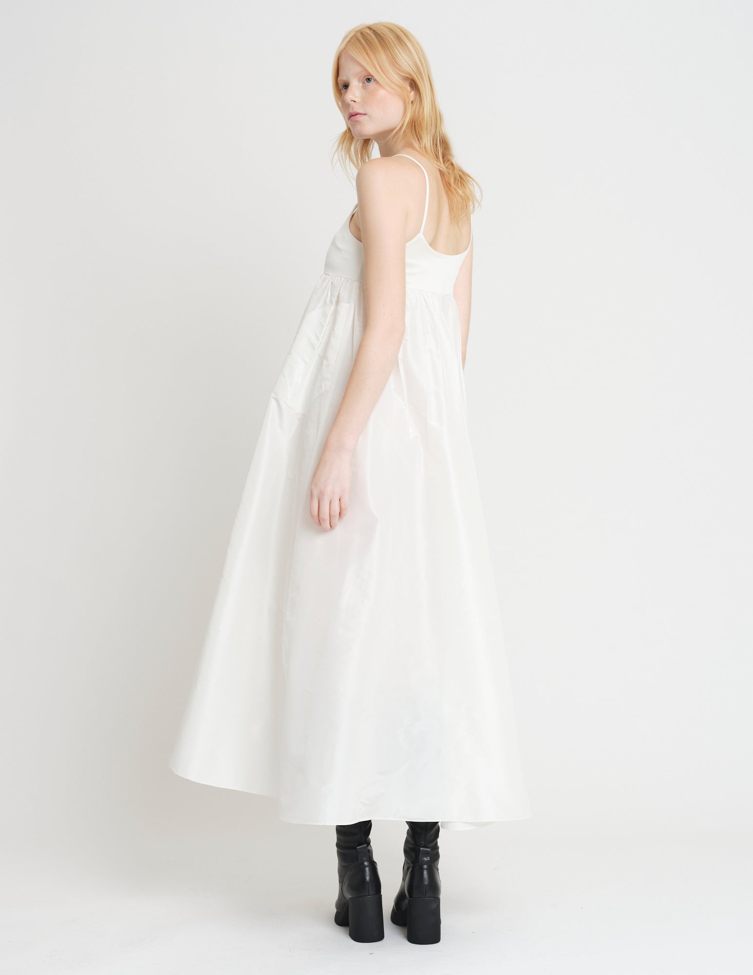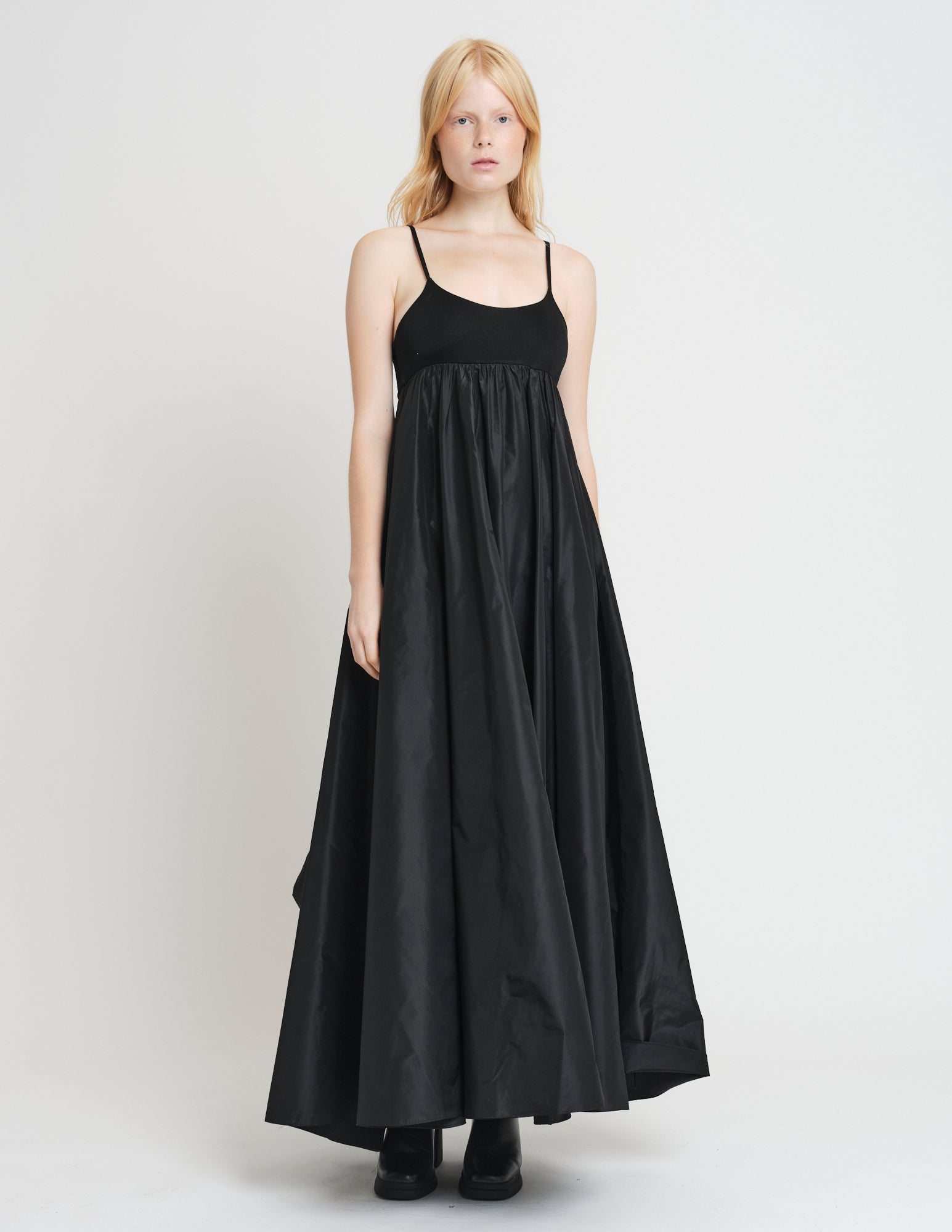 empire waisted maxi dress featuring jersey bodice with spaghetti straps and taffeta skirt with pockets and interior ties for optional drapes.