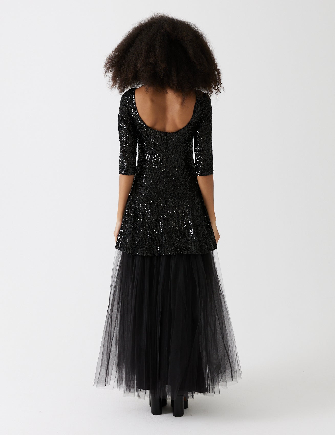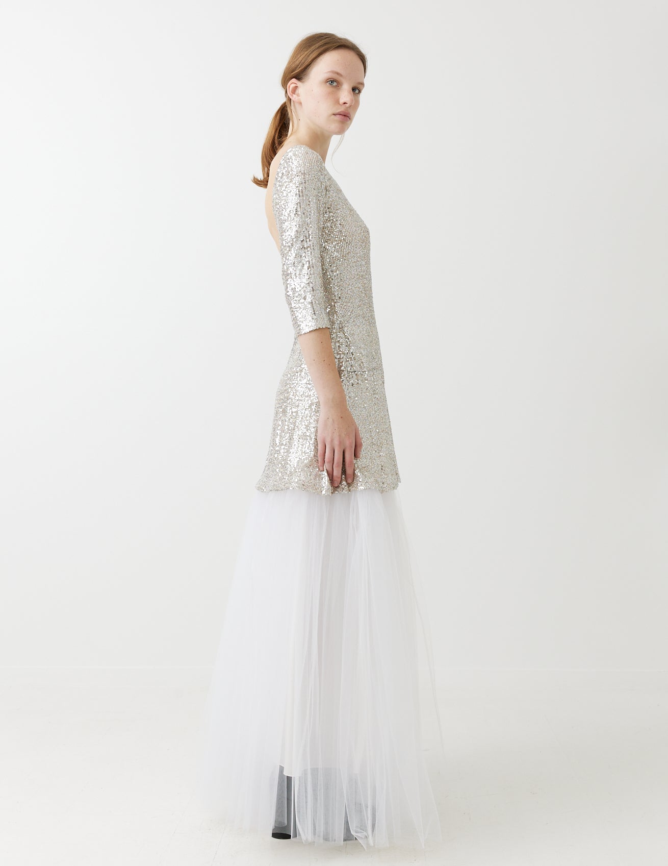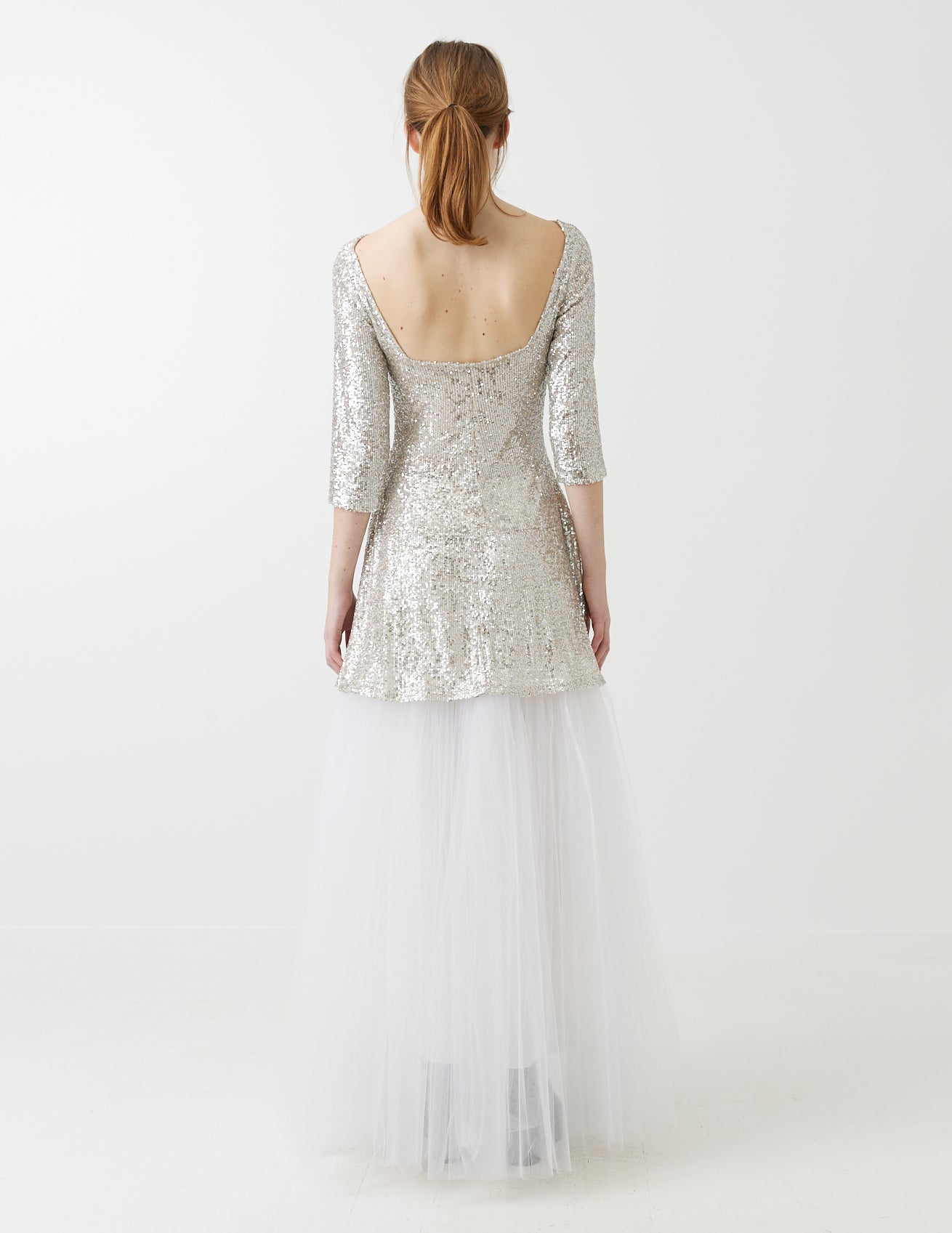 mini sequin gown with 3/4 sleeves, boat neckline, and open back. styled with the ellis crinoline.
