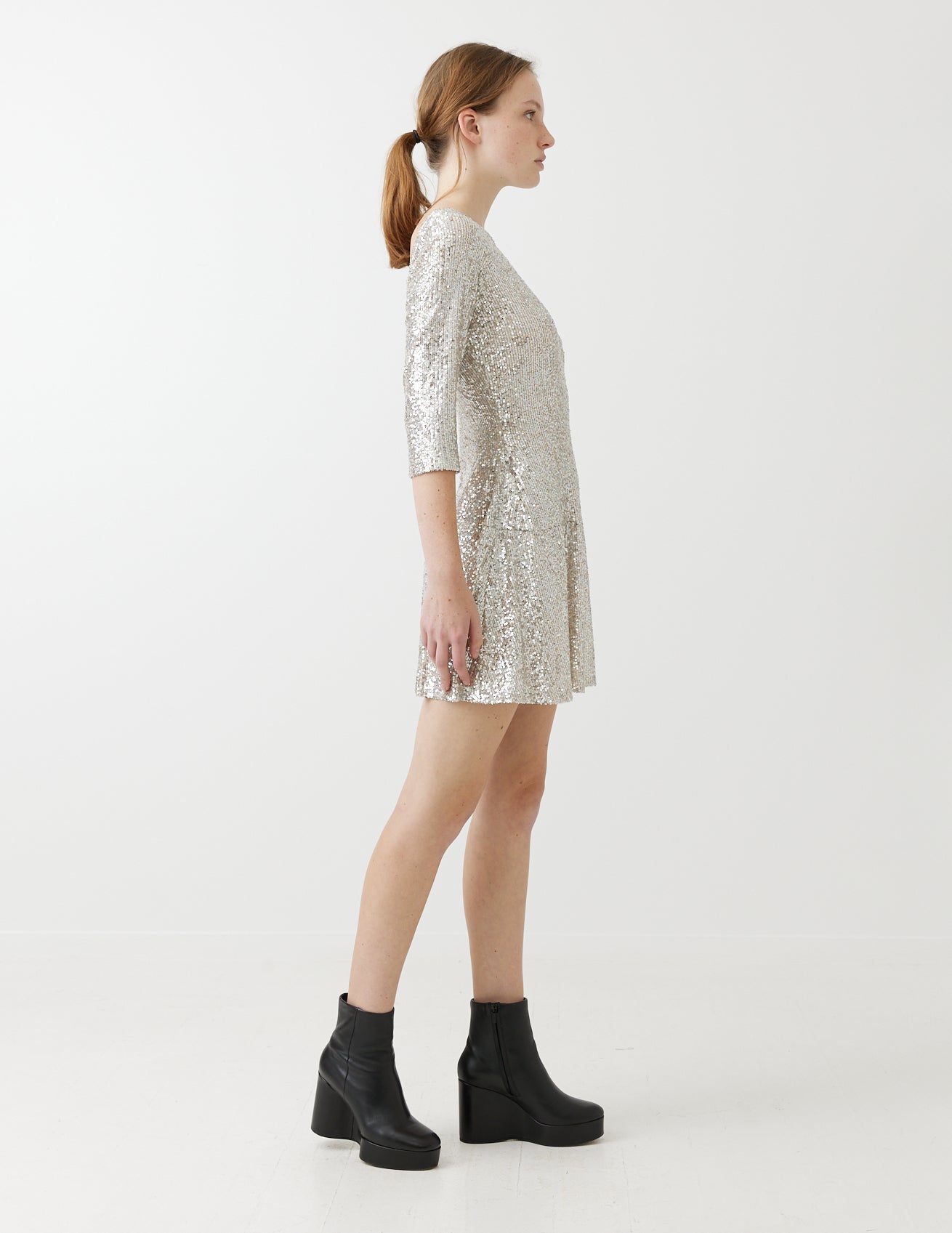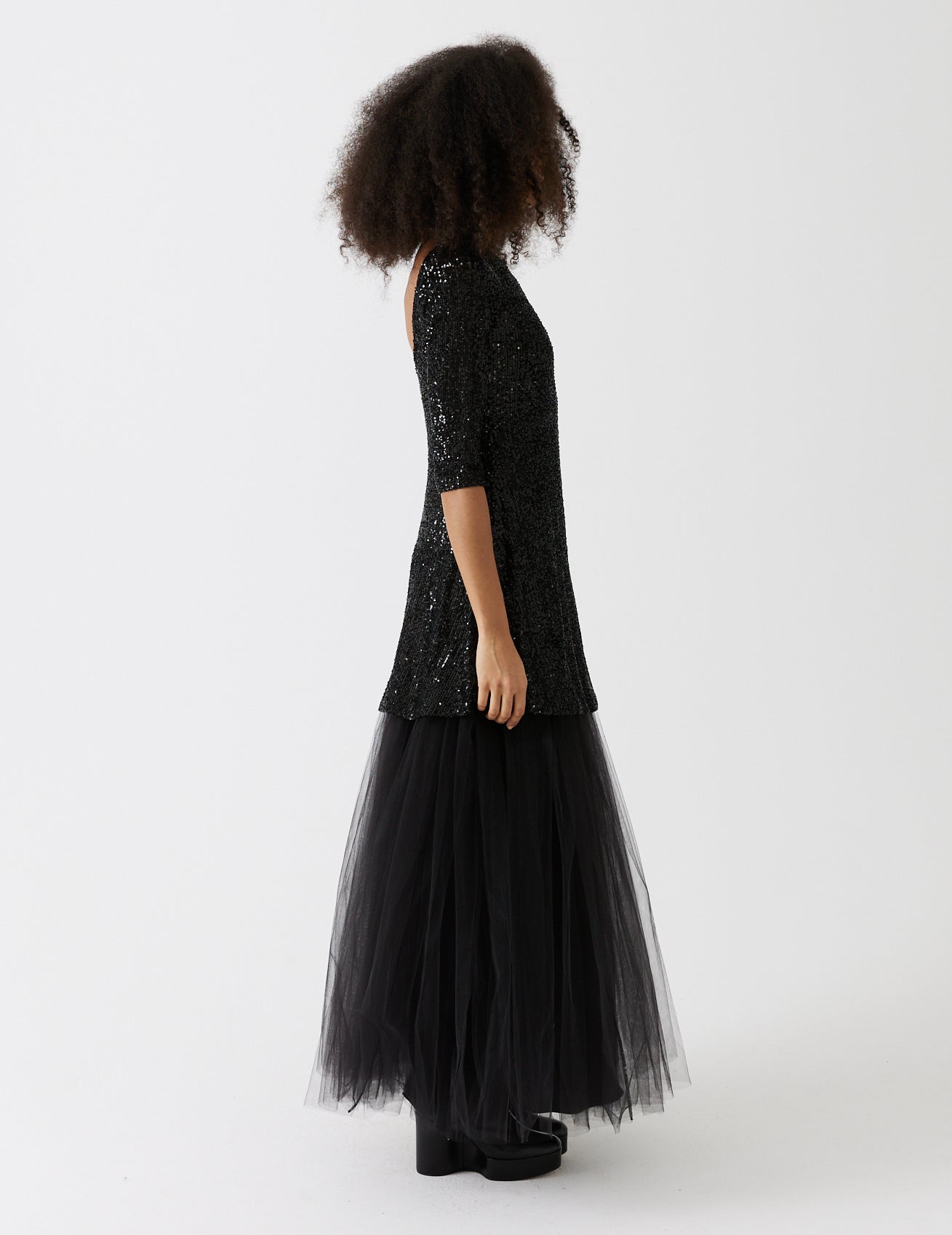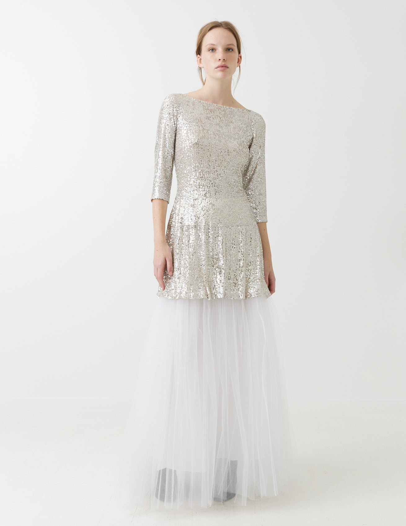 mini sequin gown with 3/4 sleeves, boat neckline, and open back. styled with the ellis crinoline.
