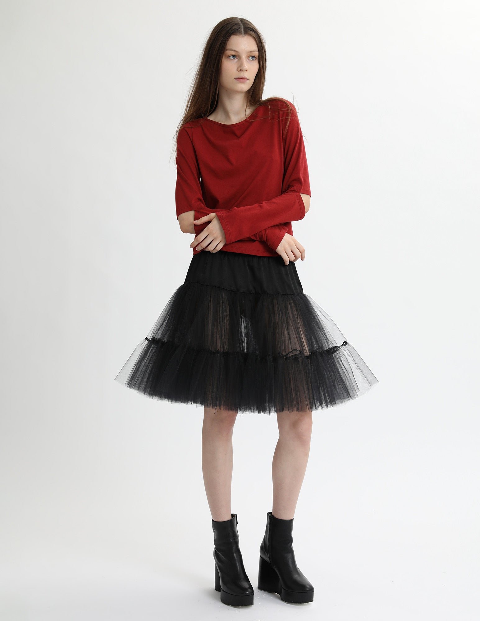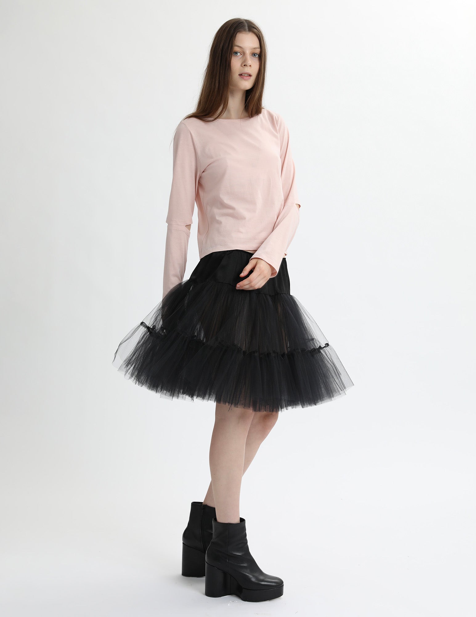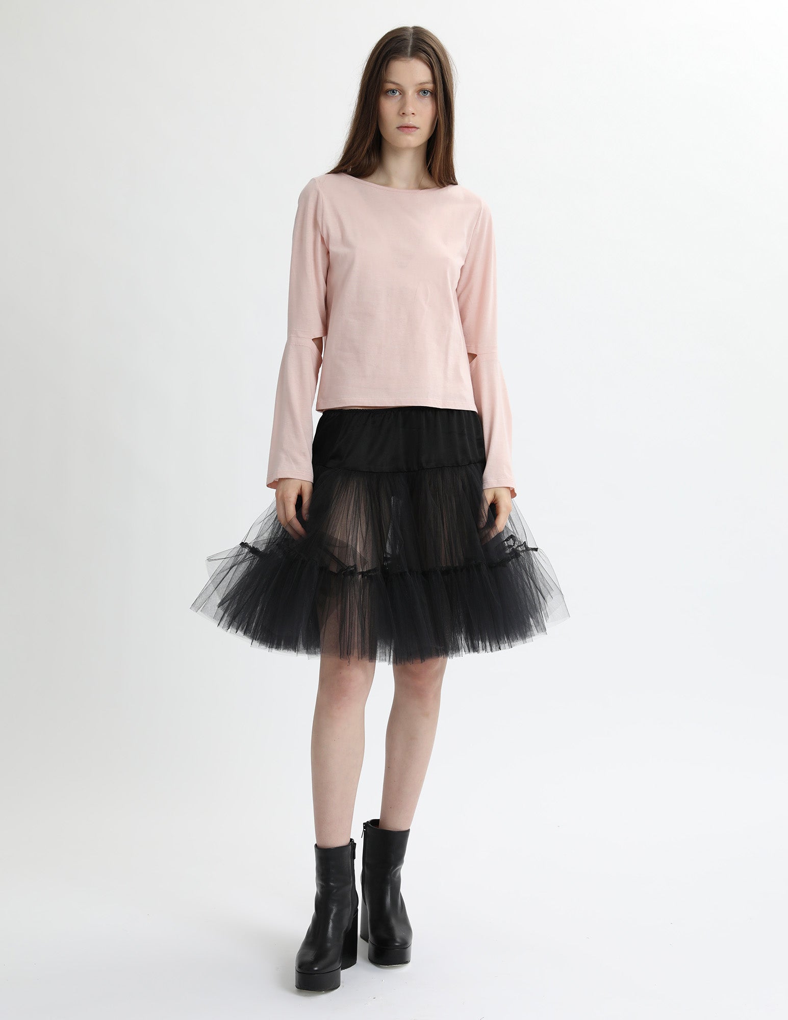 cotton jersey long sleeve t-shirt with an open neckline and an elbow slit detail. styled with the bard crinoline.