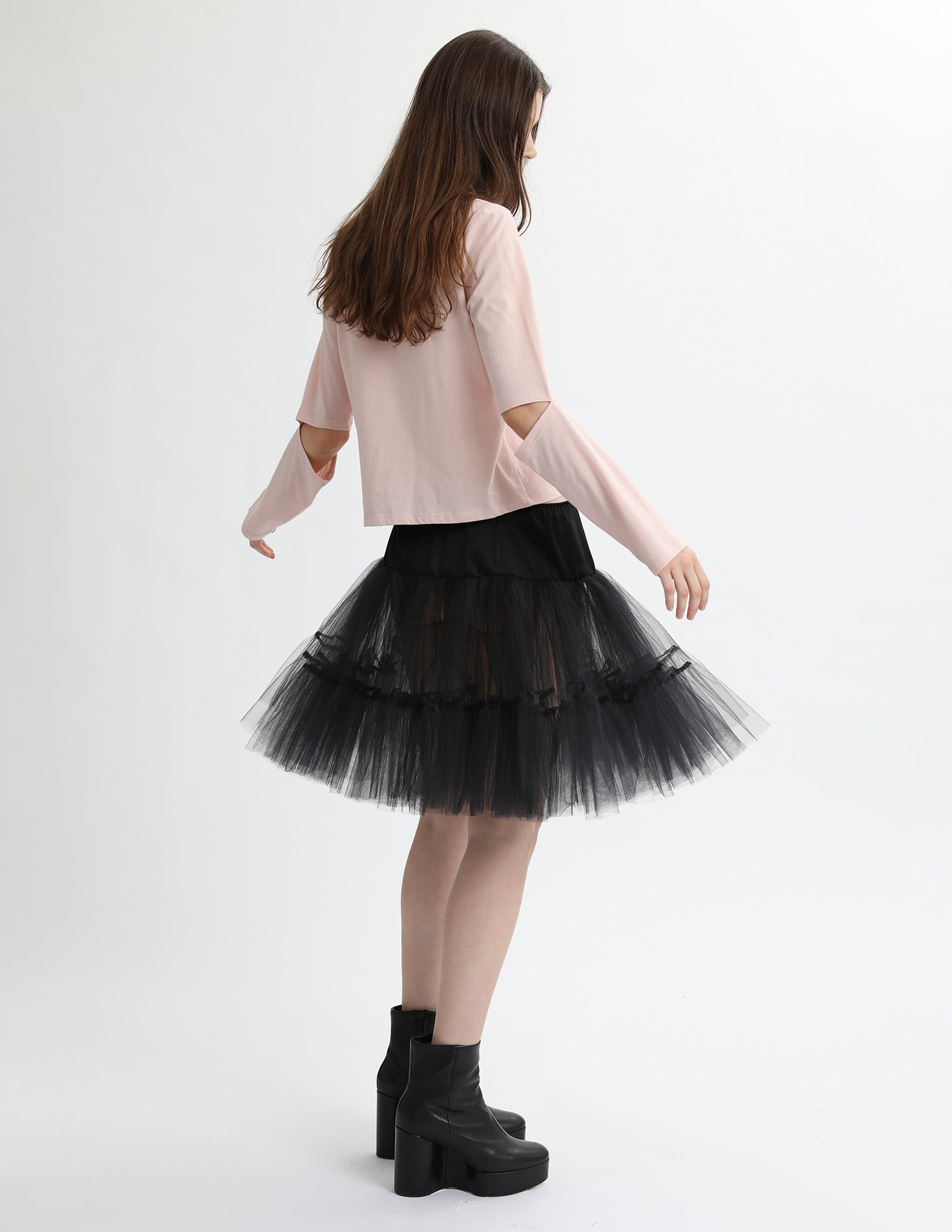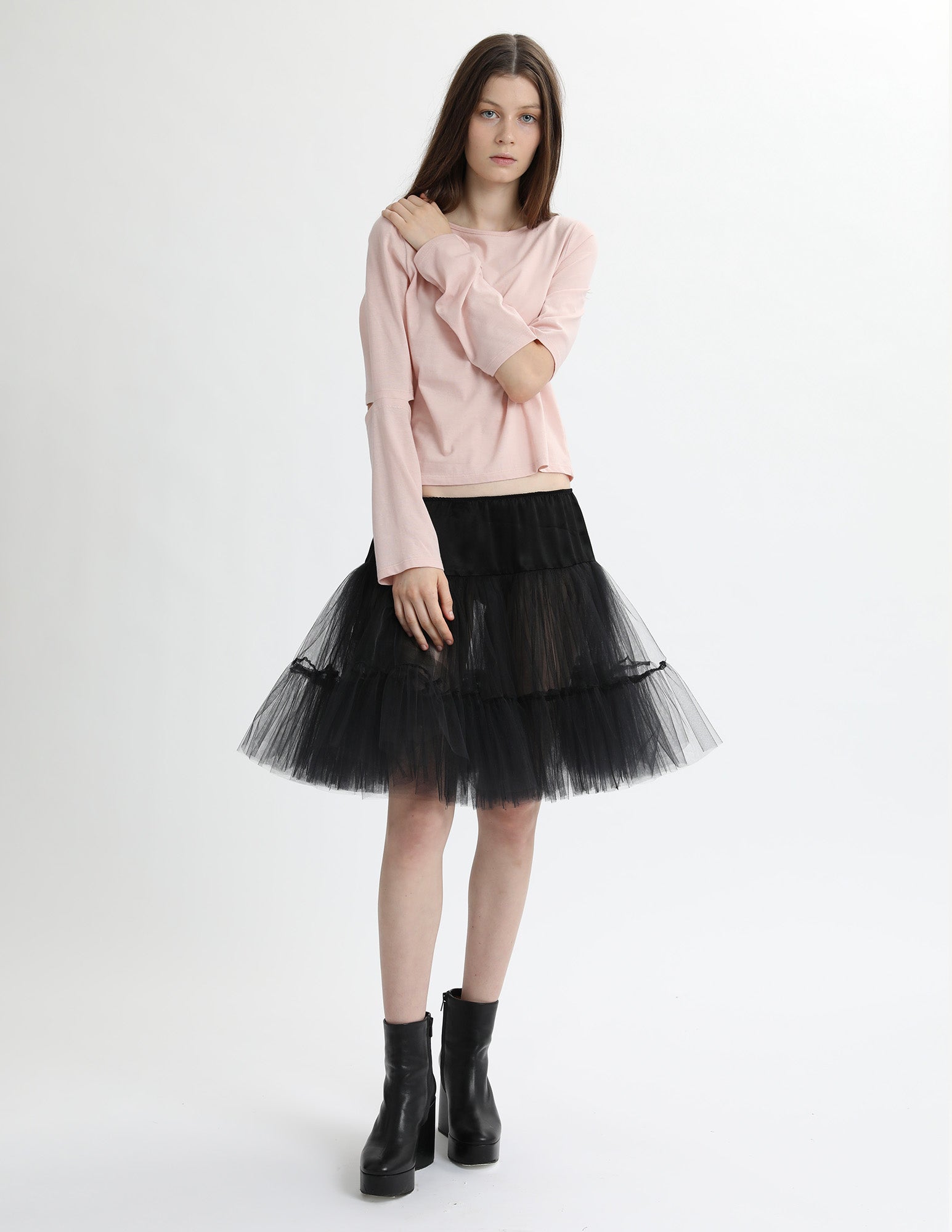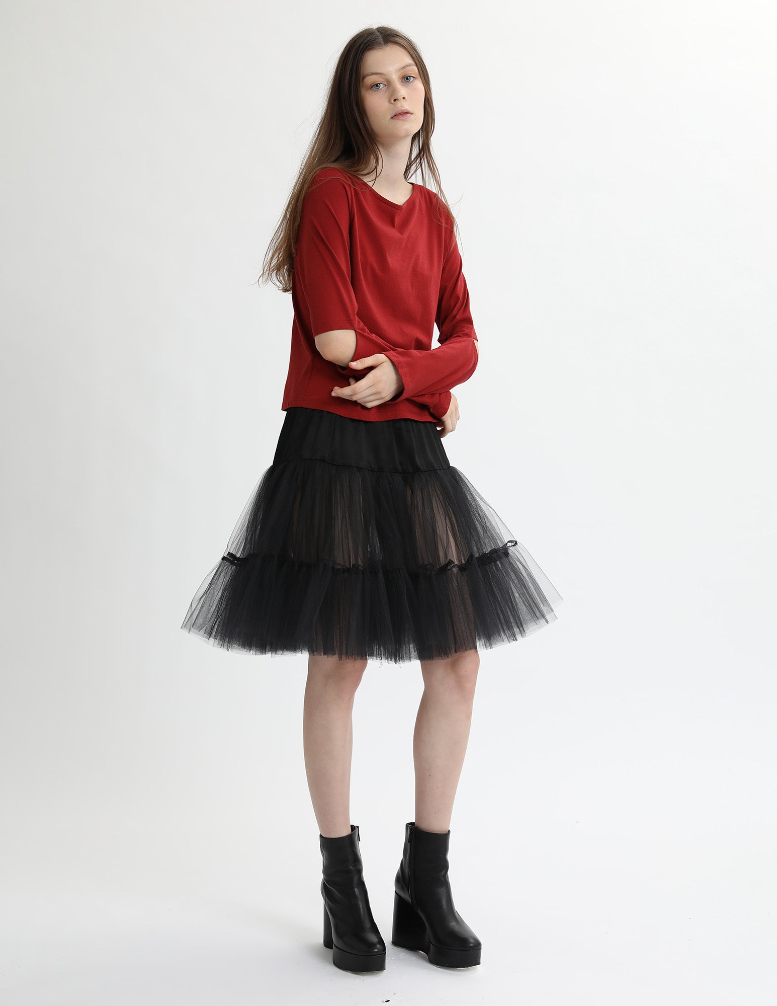cotton jersey long sleeve t-shirt with an open neckline and an elbow slit detail. styled with the bard crinoline.