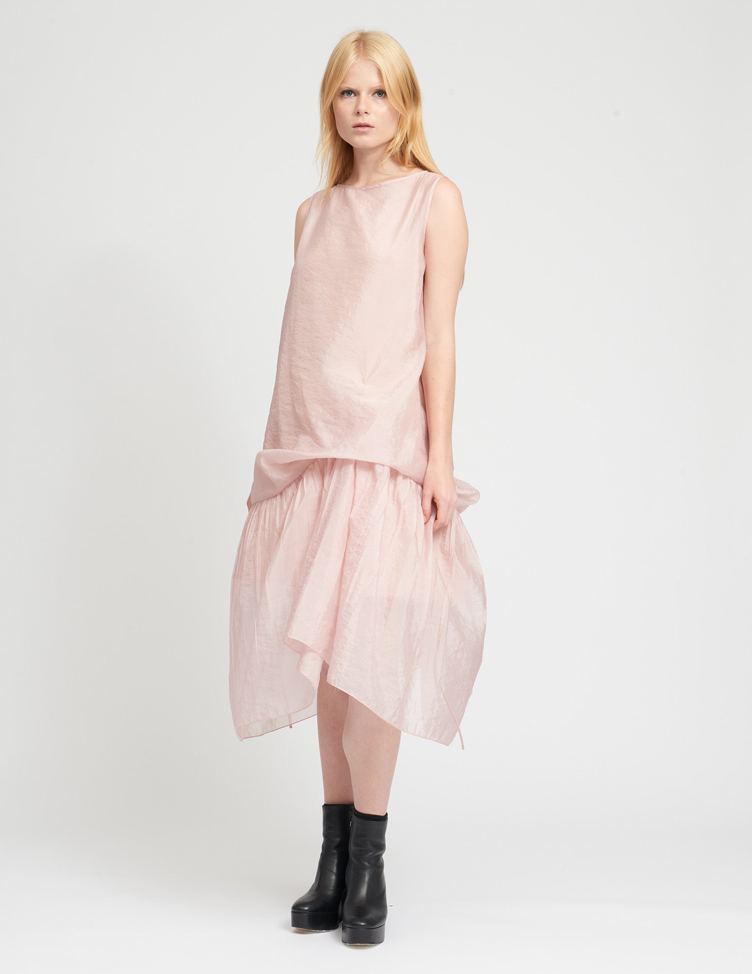 maxi a-line dress with an open neckline, ruffle panel, and interior ties to create drapery. comes with a slip and styled with the st. moritz crinoline.