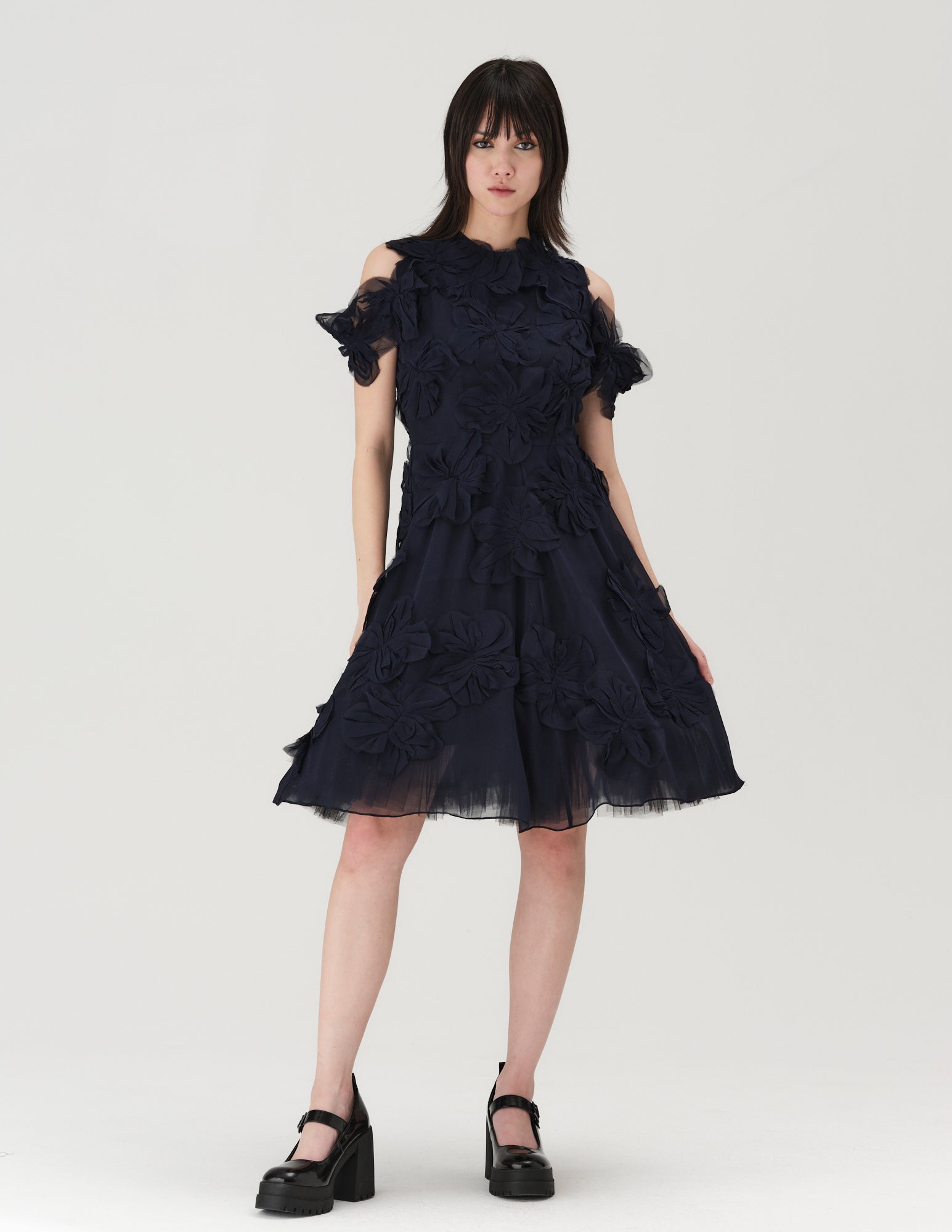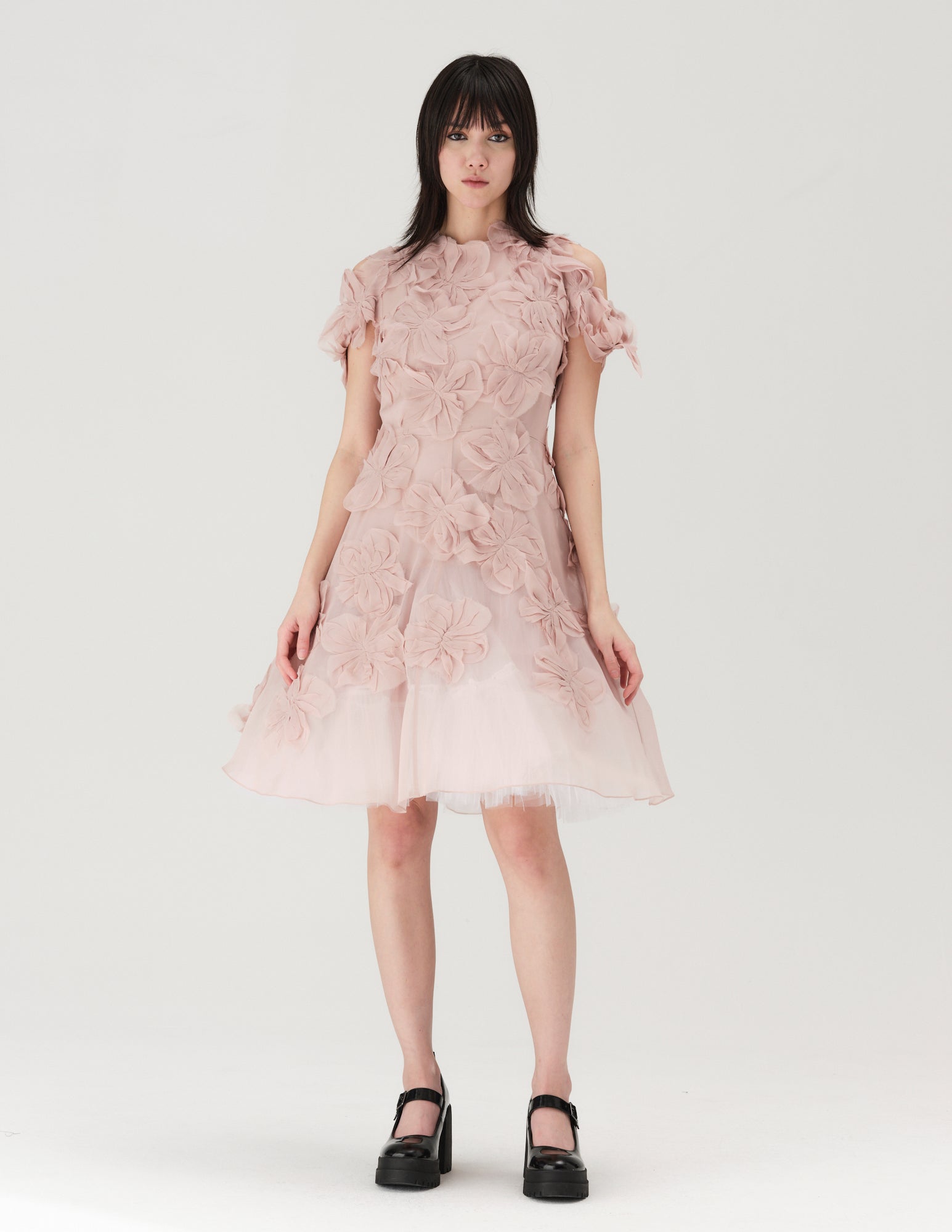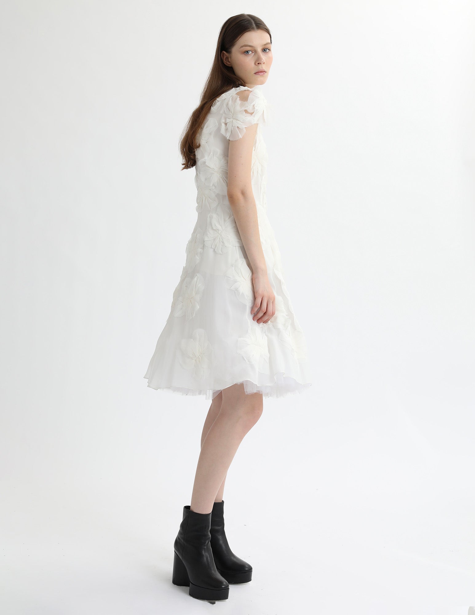 short chiffon gown with interior crinoline featuring delicate floral appliqués placed all over the gown and delicate floral sleeve details.