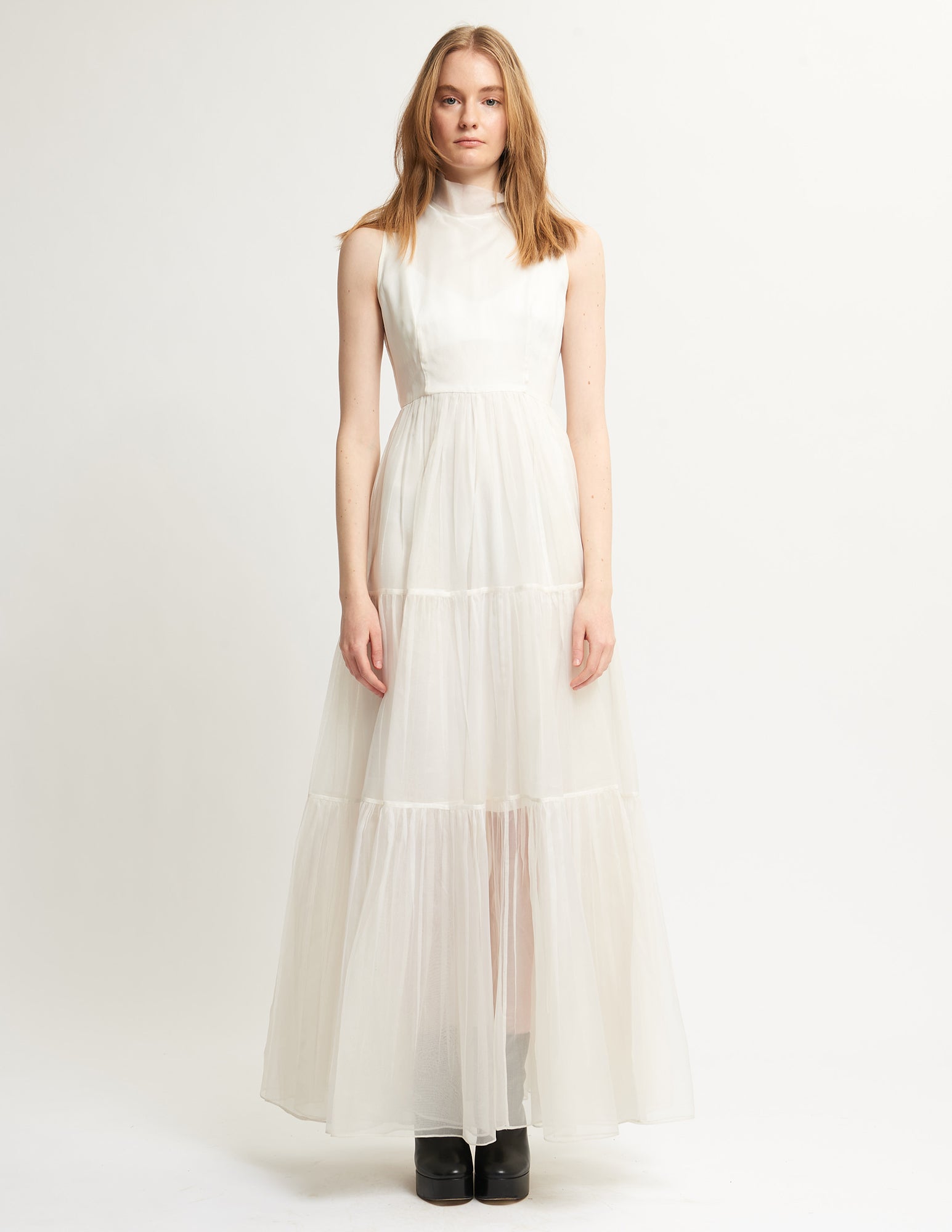 floor length organza gown featuring a fitted bodice and tiered skirt with optional interior ties to create drapery. lined.
