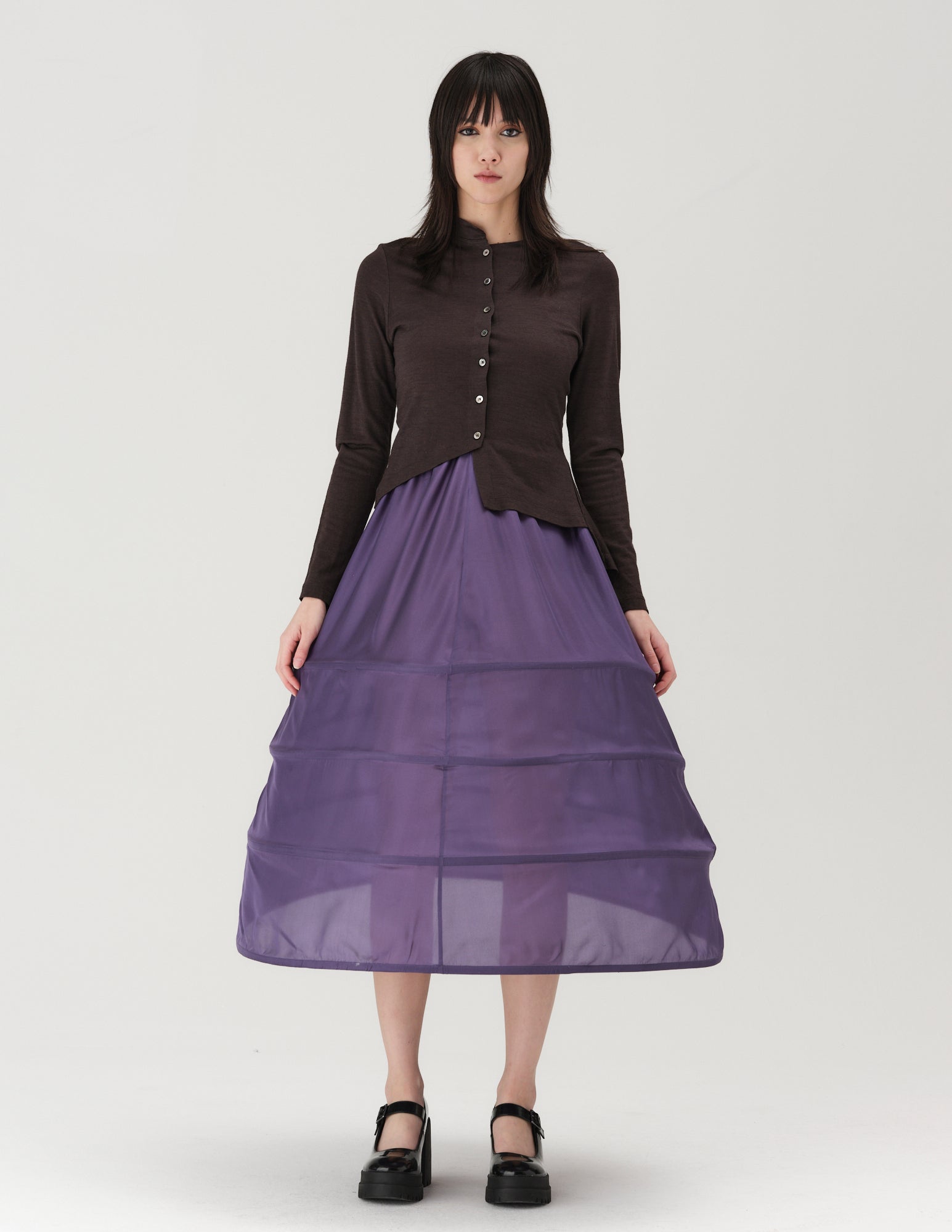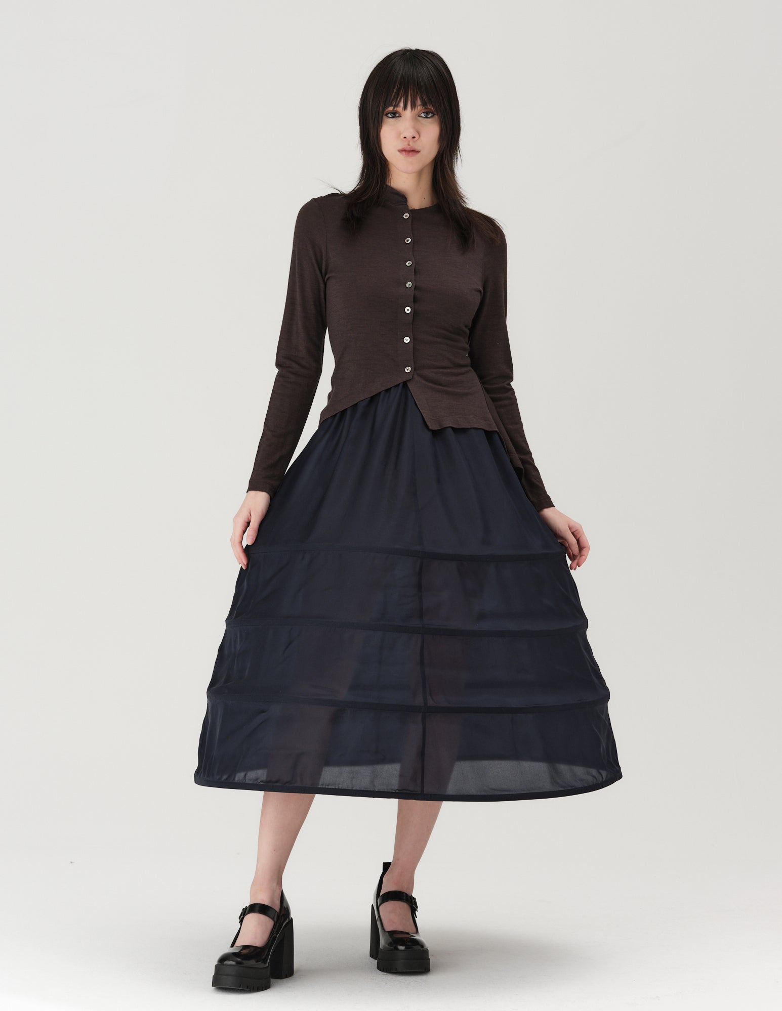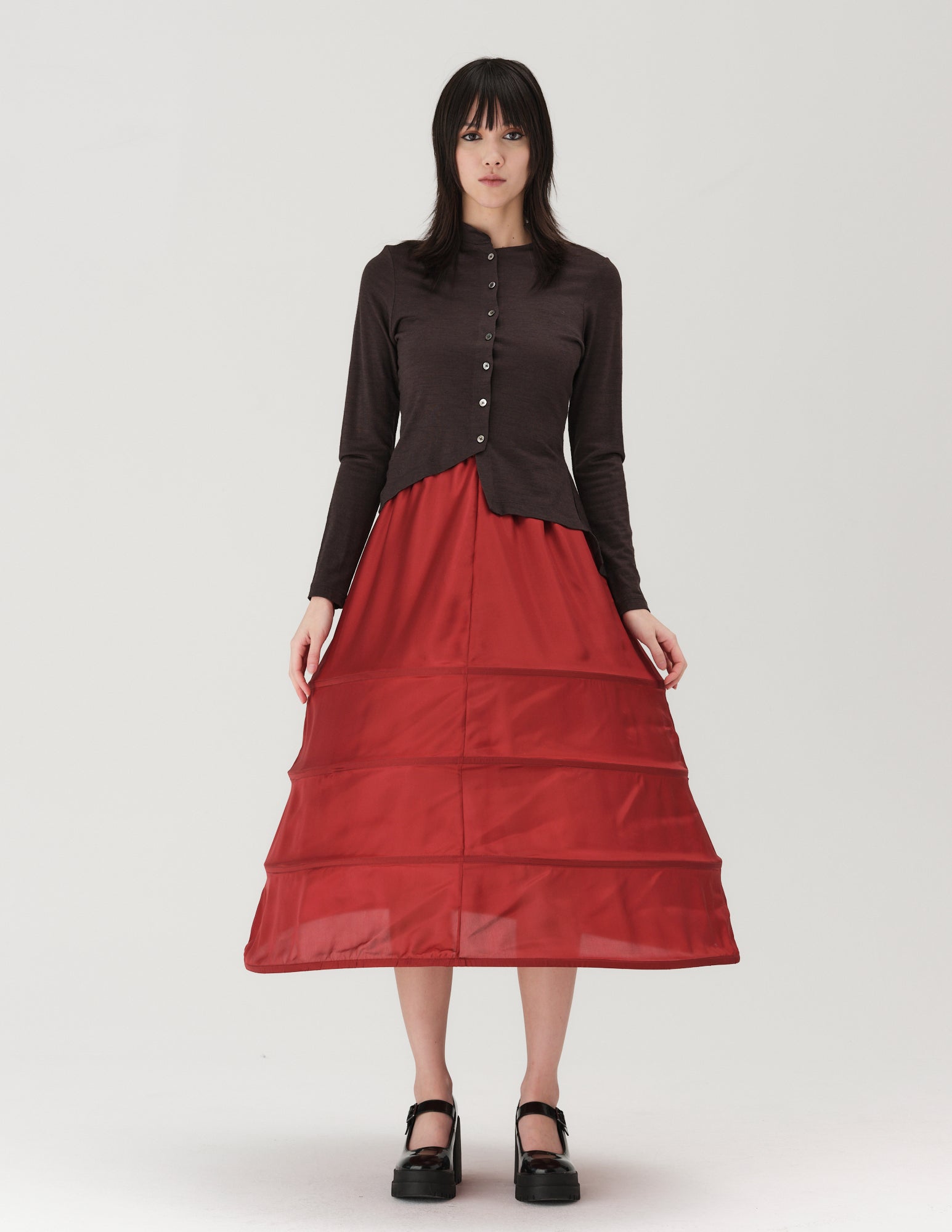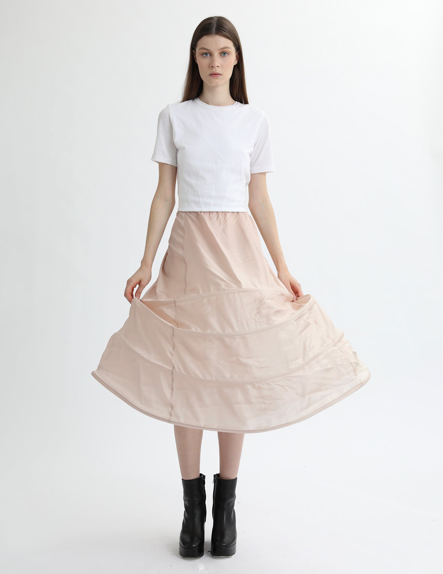this contemporary take on a keystone in historical fashion is reimagined in silk habotai. the audrey hoop skirt features 3 tiers and an elasticated waist. styled with the freesia t-shirt and alisher cardigan.