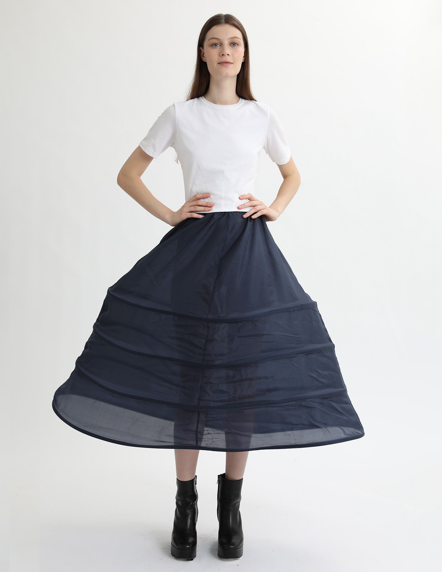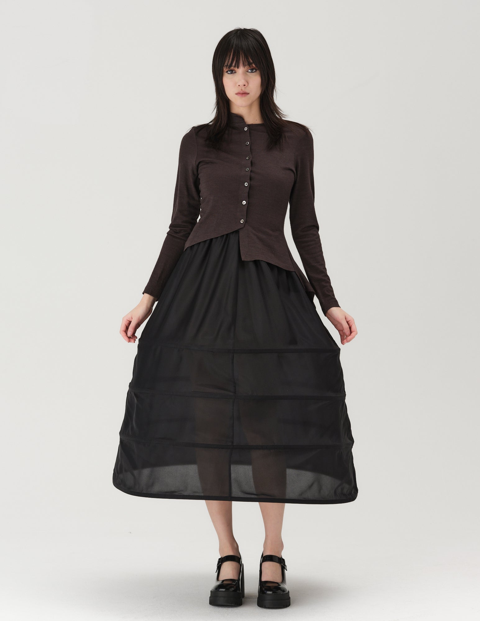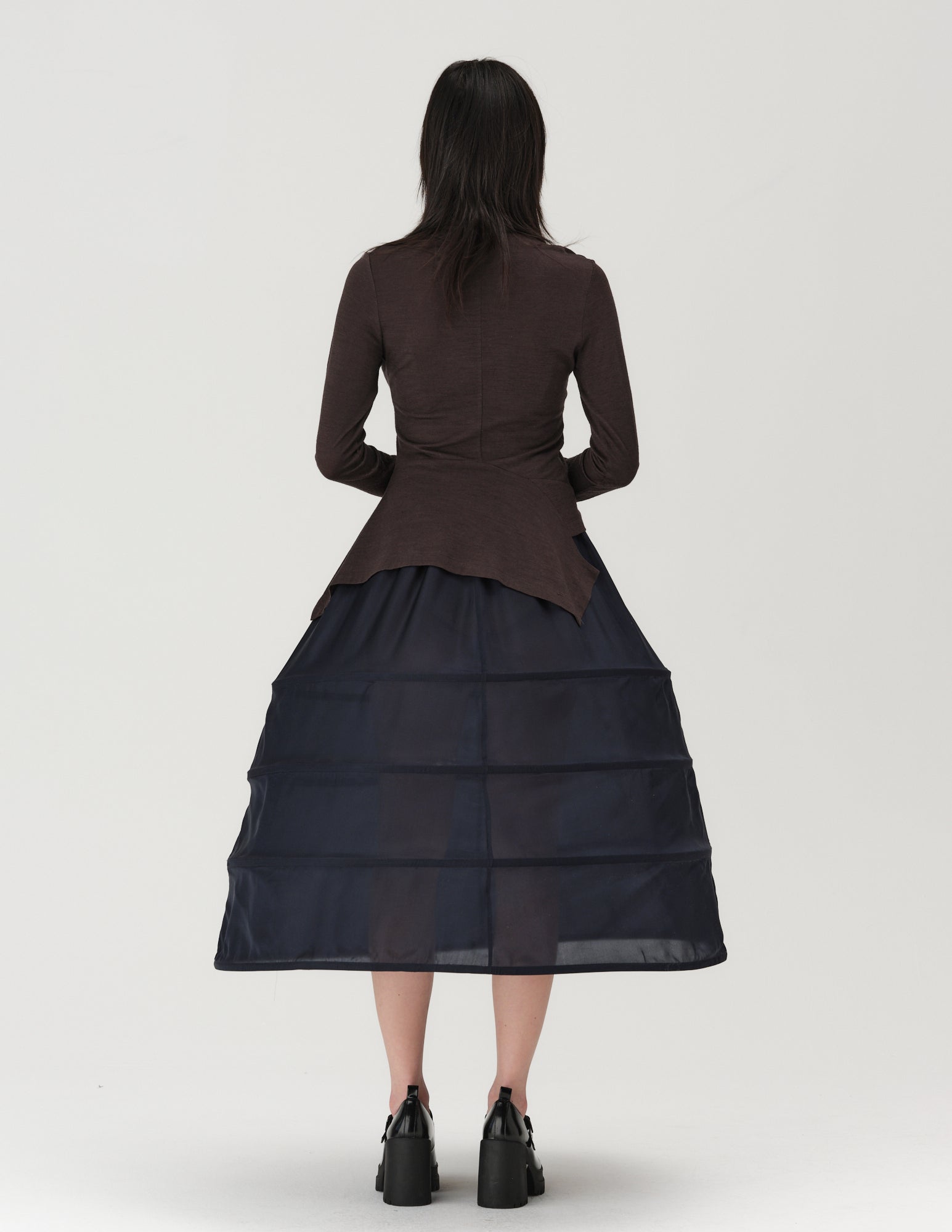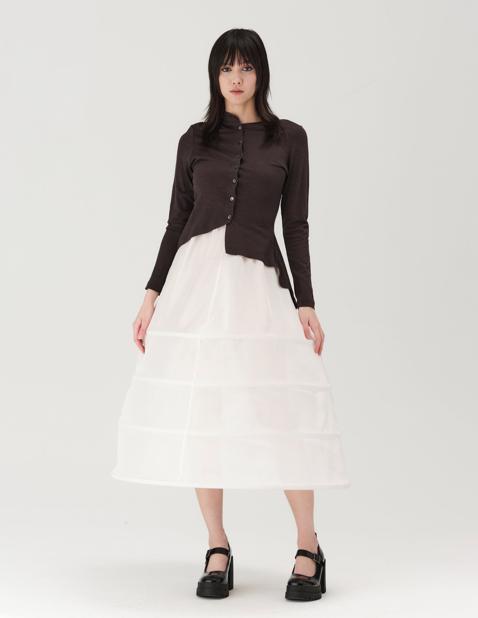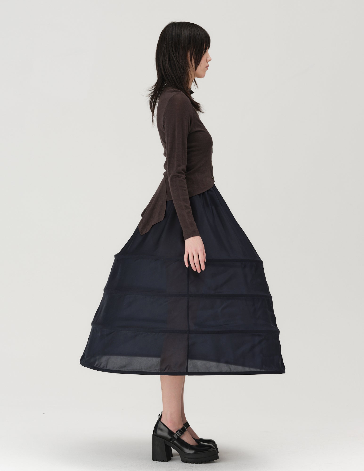 this contemporary take on a keystone in historical fashion is reimagined in silk habotai. the audrey hoop skirt features 3 tiers and an elasticated waist. styled with the freesia t-shirt and alisher cardigan.