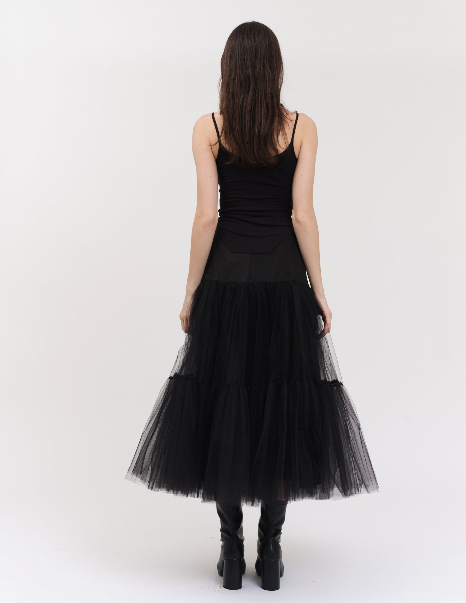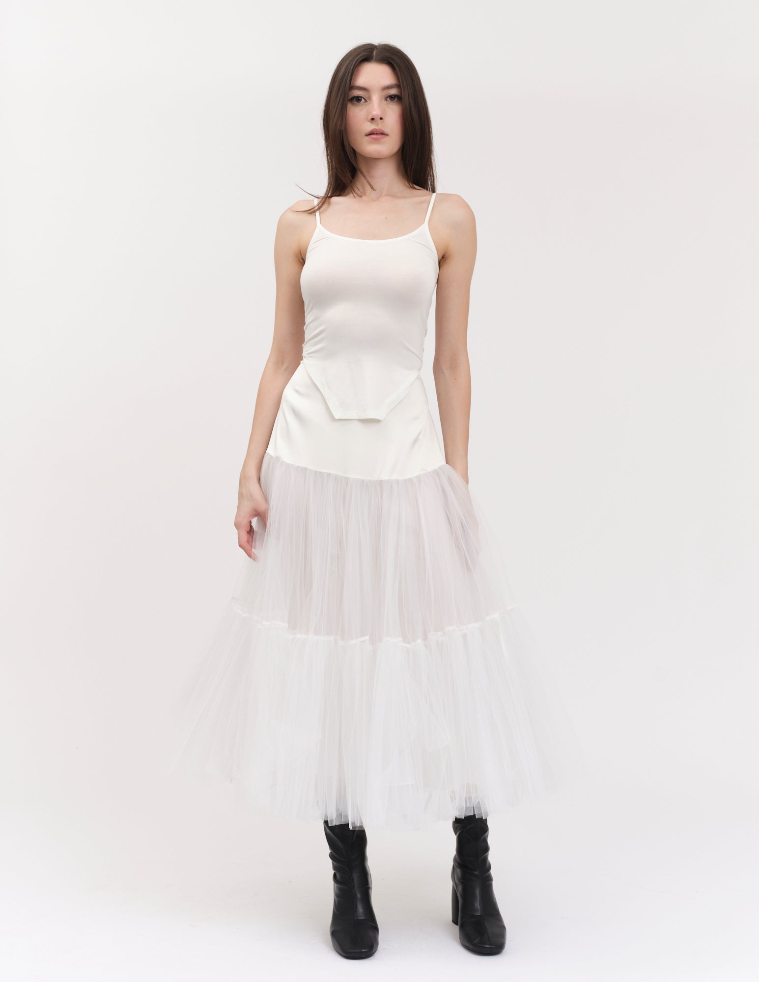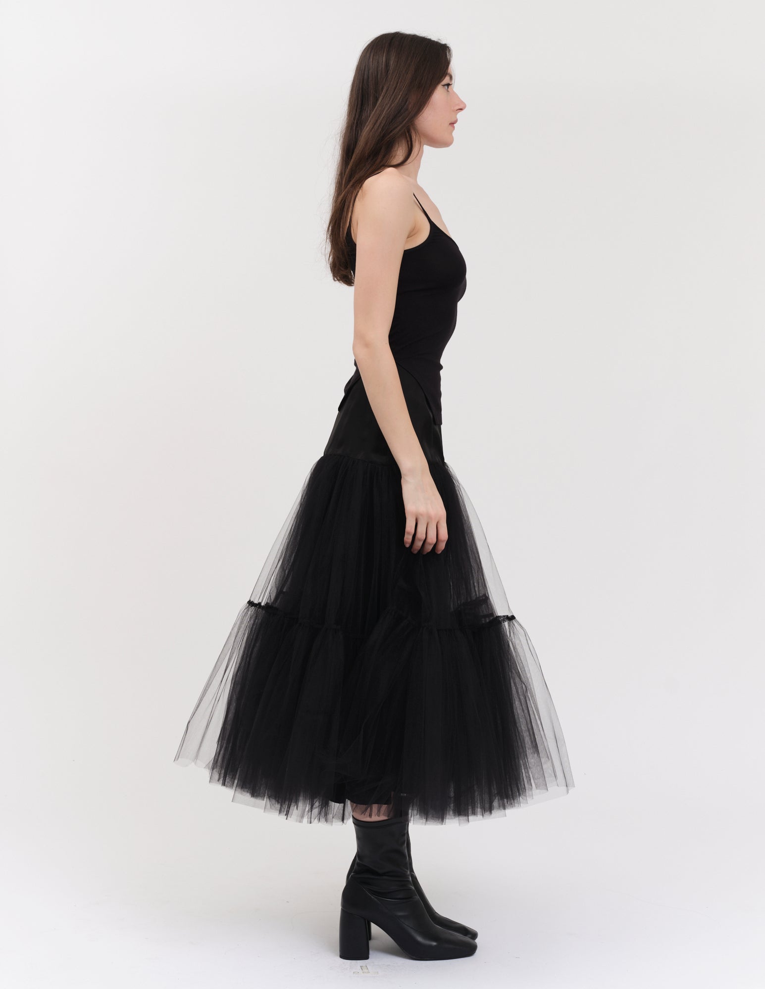the tiered design of the aura crinoline is a morgane le fay classic that gives an elegantly timeless look. layers of tulle cascade from below a wide yoke.