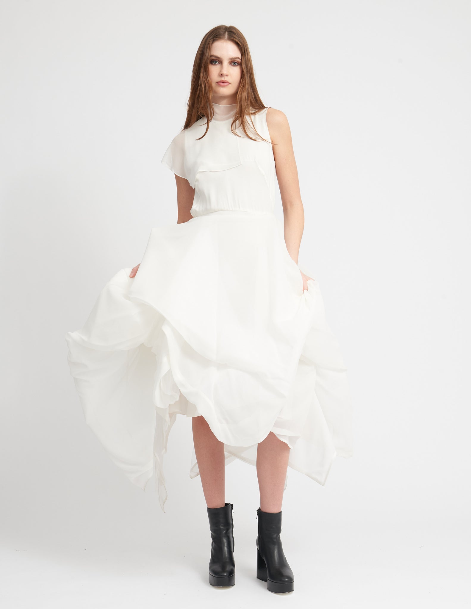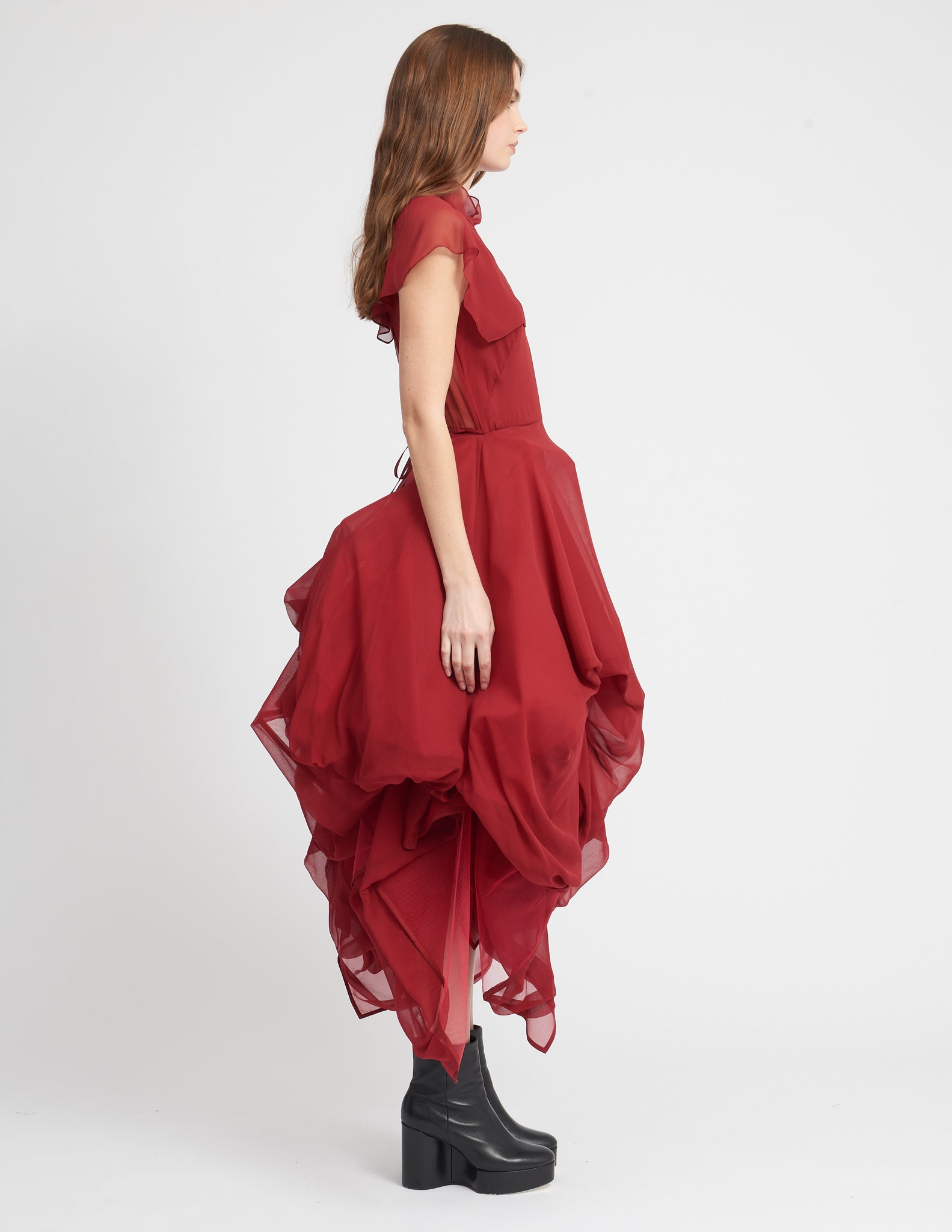 fitted bodice gown featuring a high neck, draped collar and extravagant chiffon and heavy tulle skirt. back bodice is unlined.