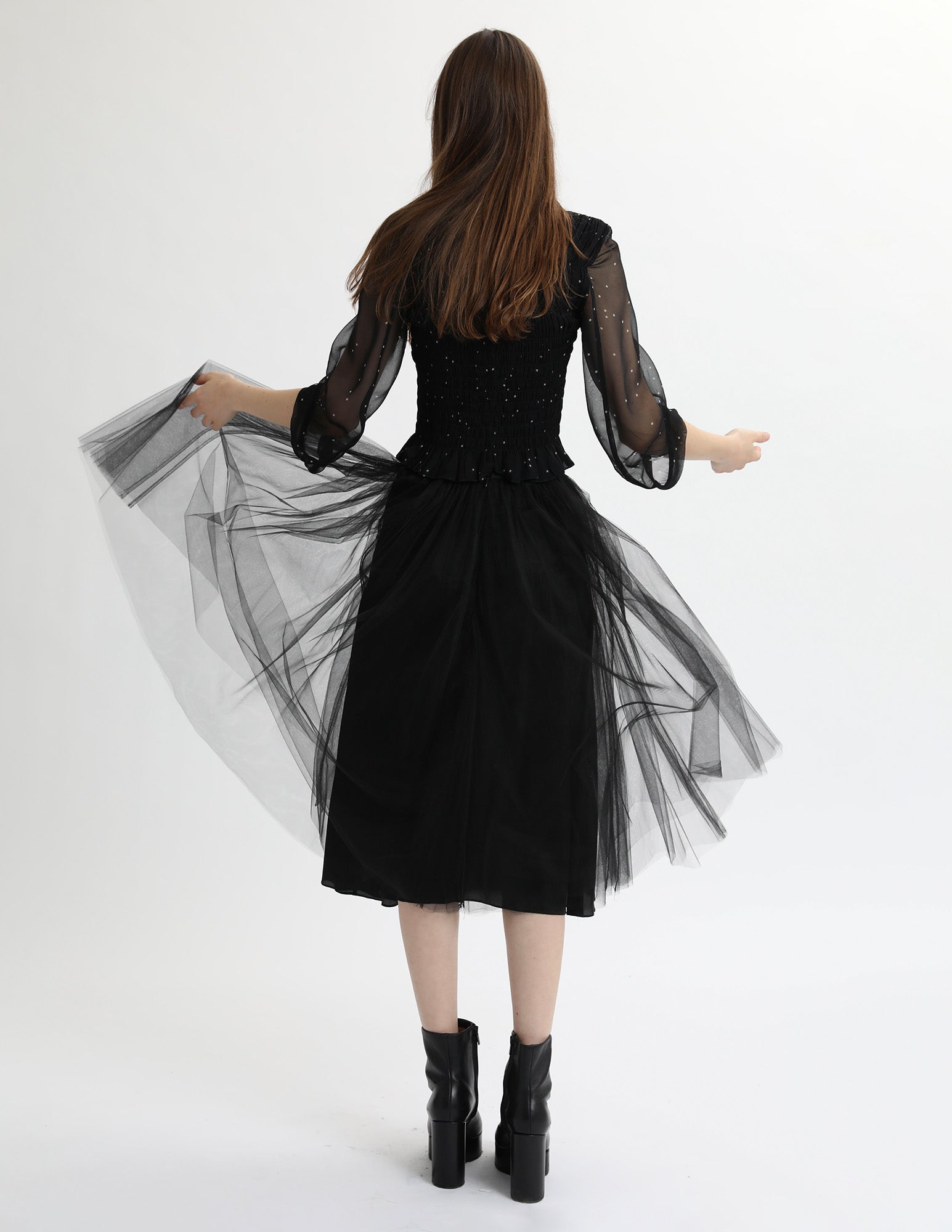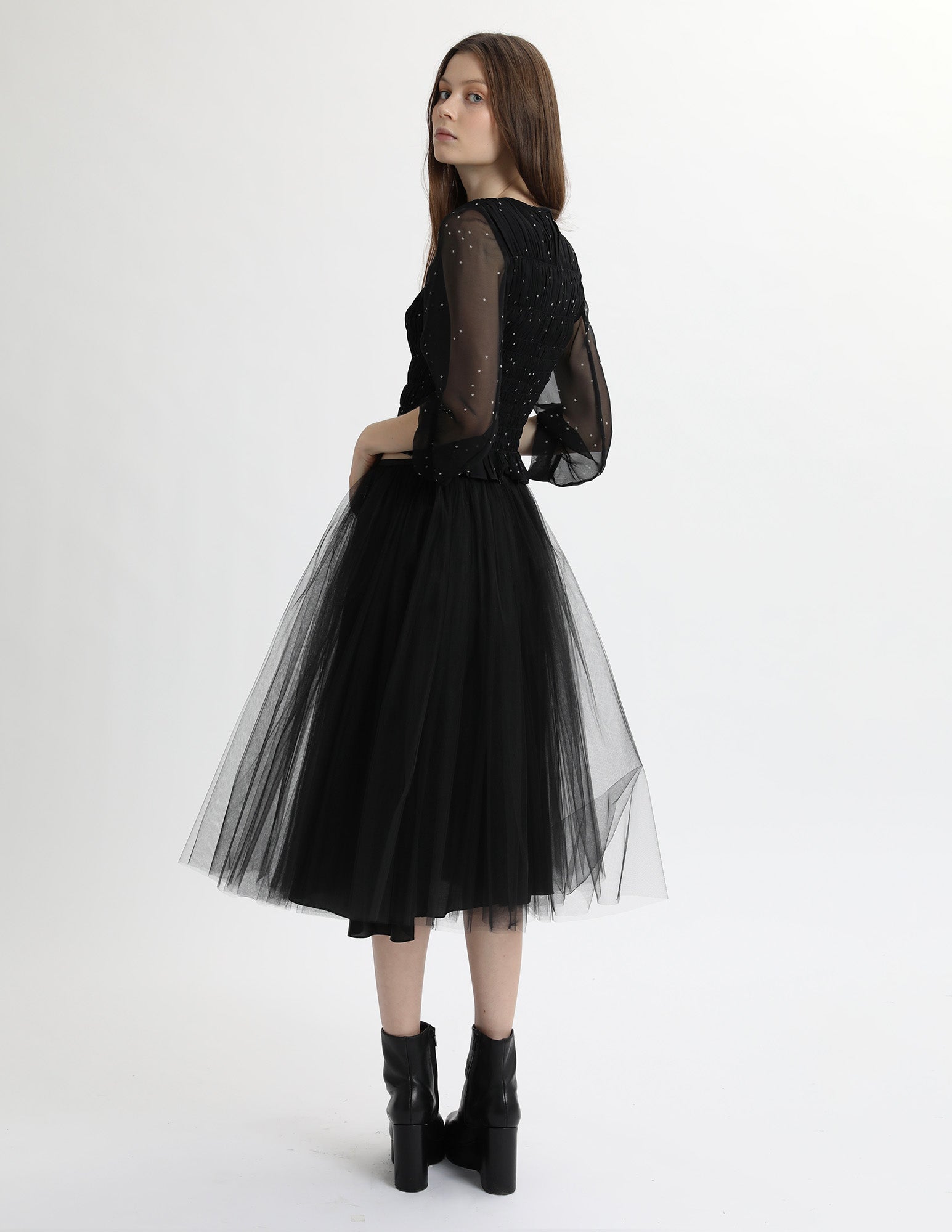 our signature star print in a fitted blouse with ruching and 3/4 length sleeves. styled with the daphne crinoline.