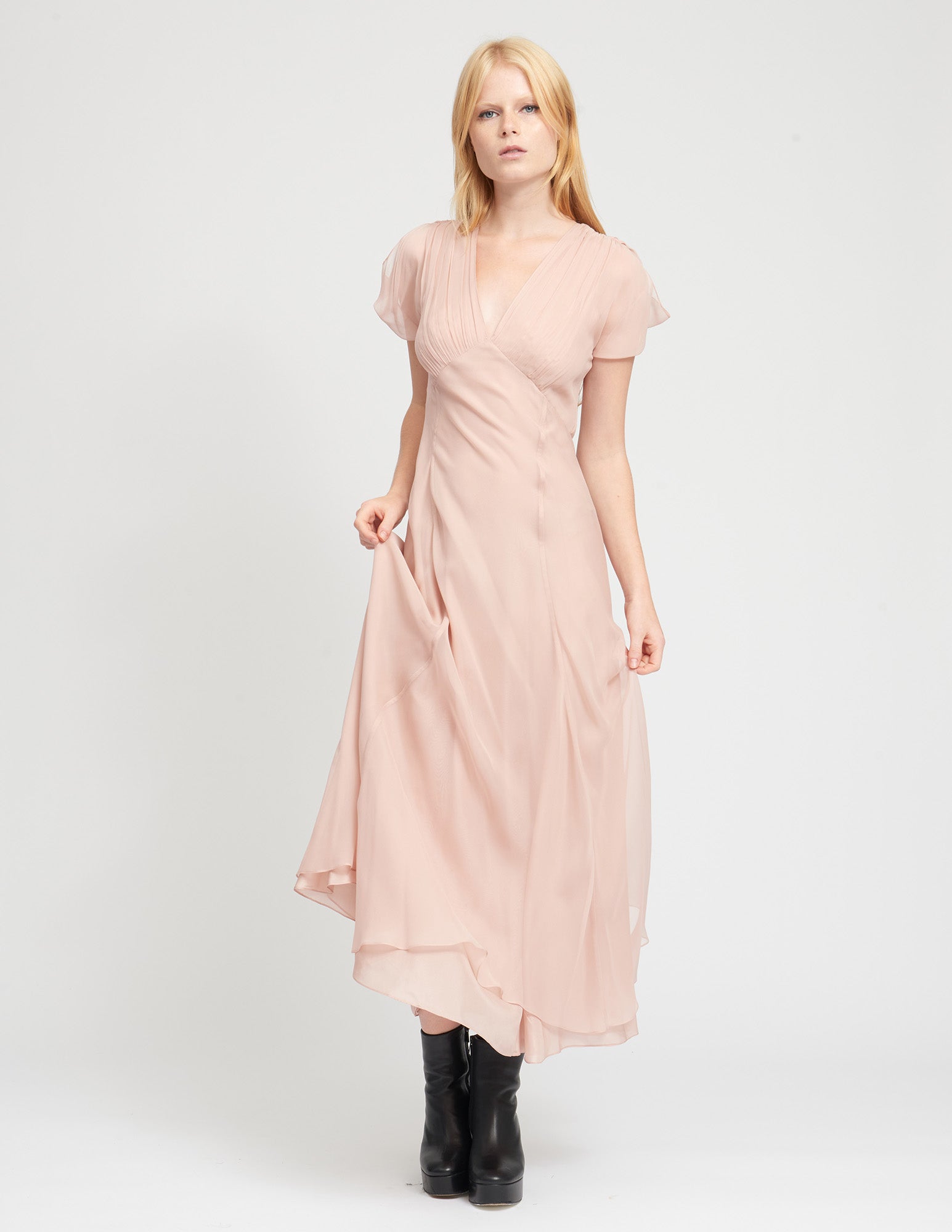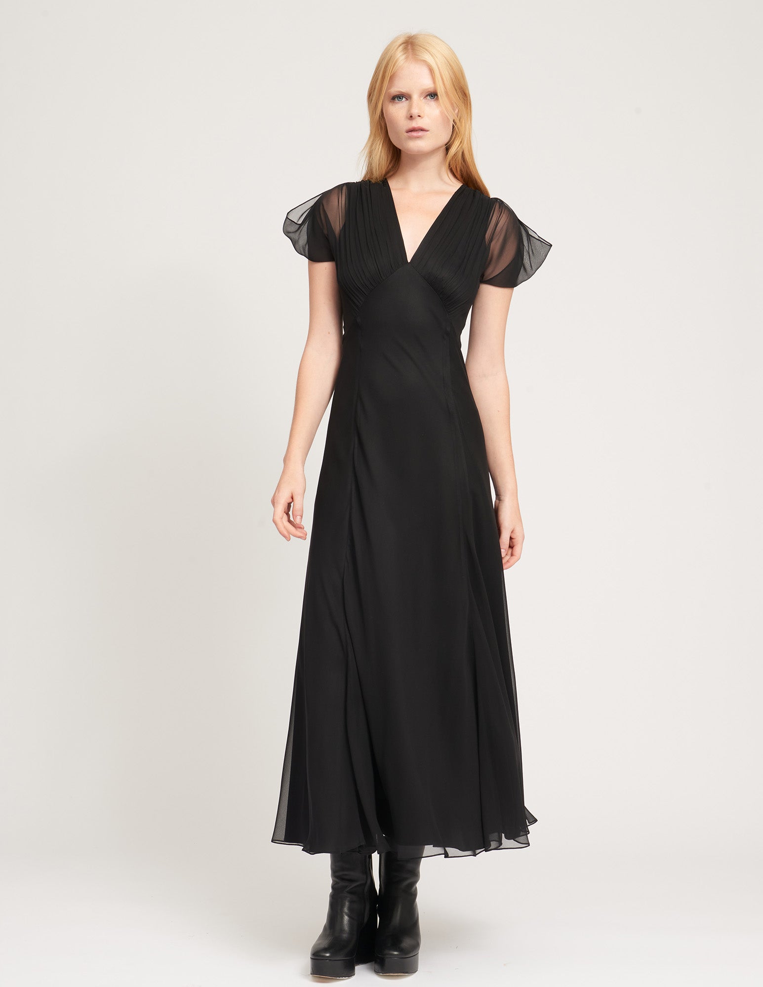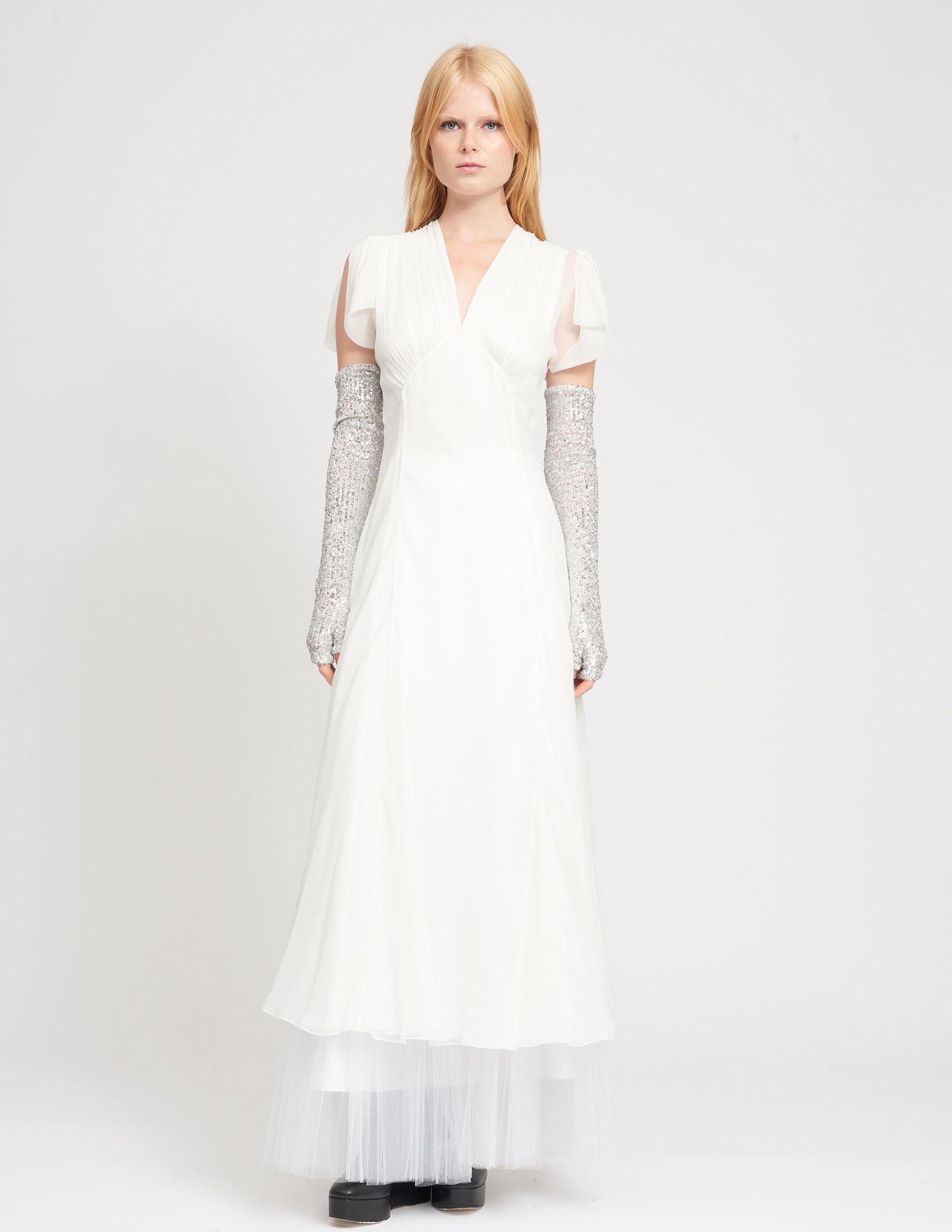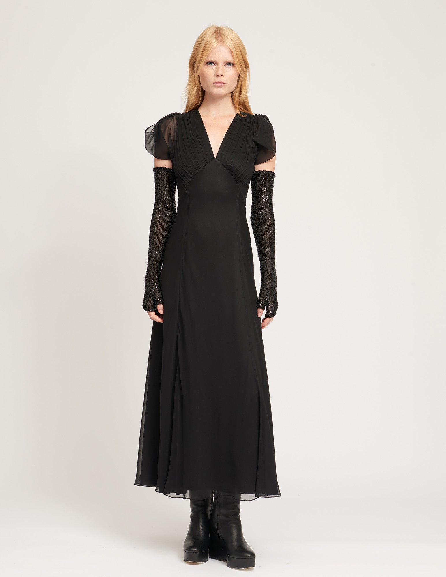 v-neckline midi dress with delicate ruching detailing, romantic draped sleeves, and an open back keyhole detail. styled with the opera sequin gloves.