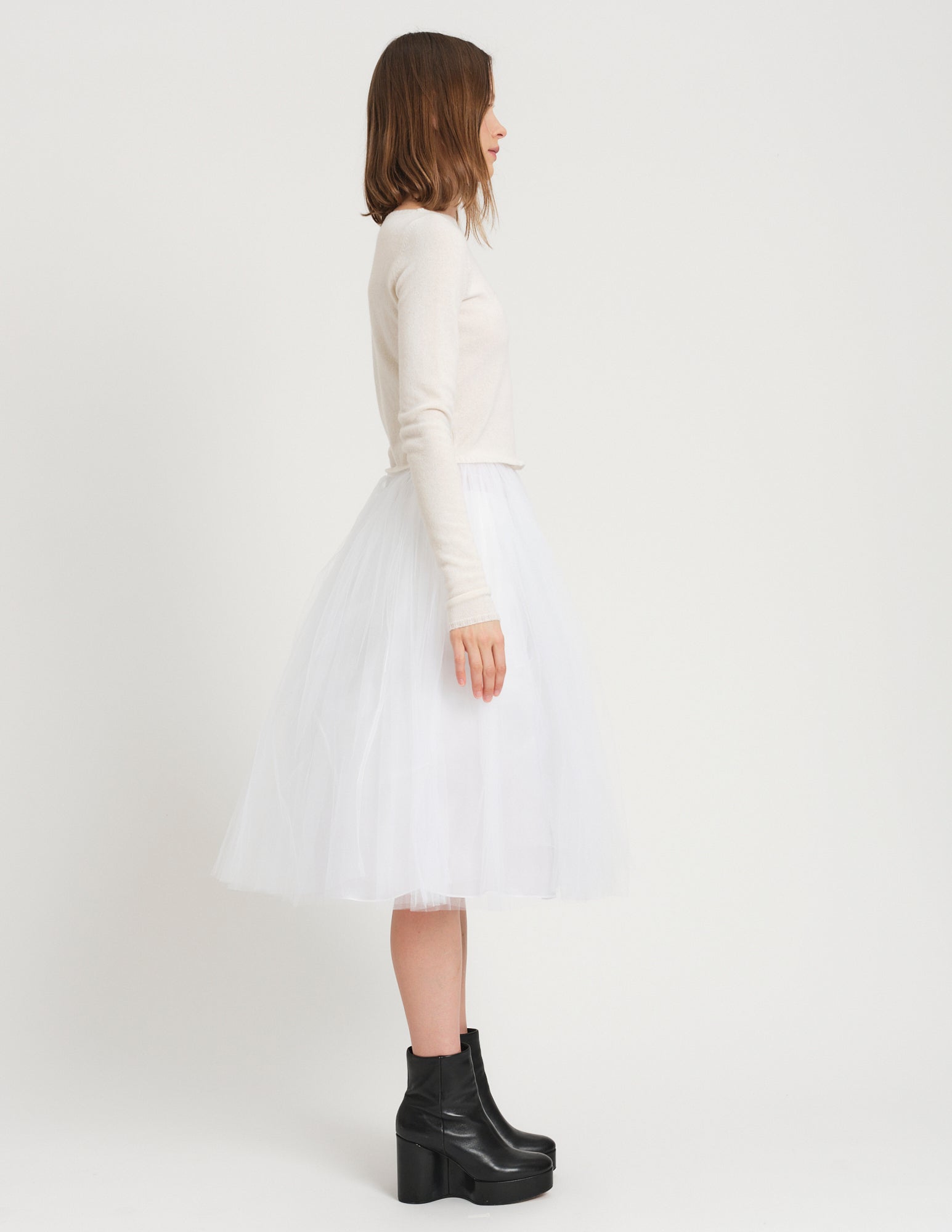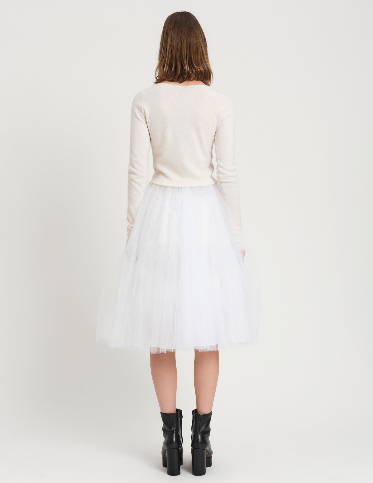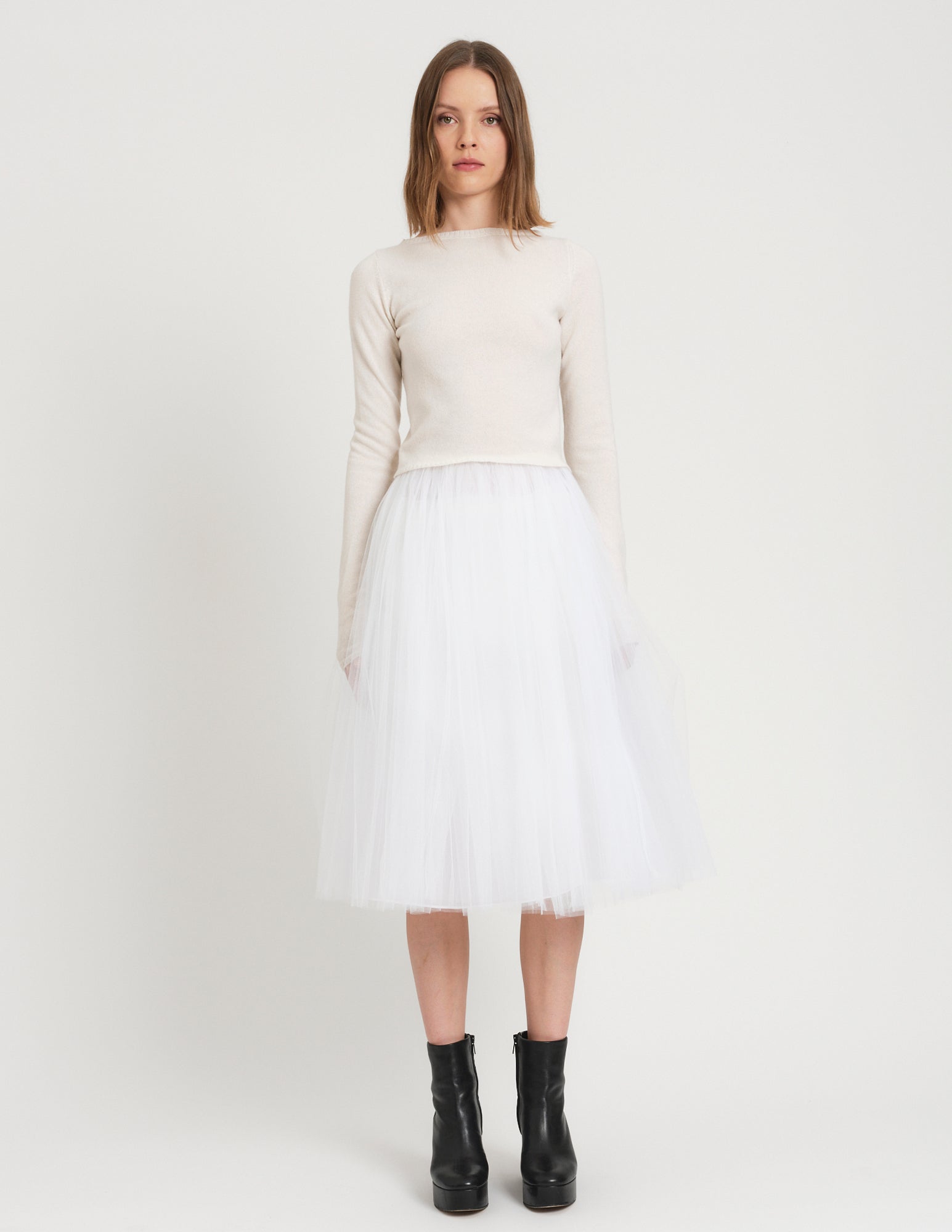 embodying the elegance of a ballerina, the daphne crinoline is designed to move gracefully with you. features a thin waistband and 4 layers of tulle cascading from waist. styled with the tokyo sweater.