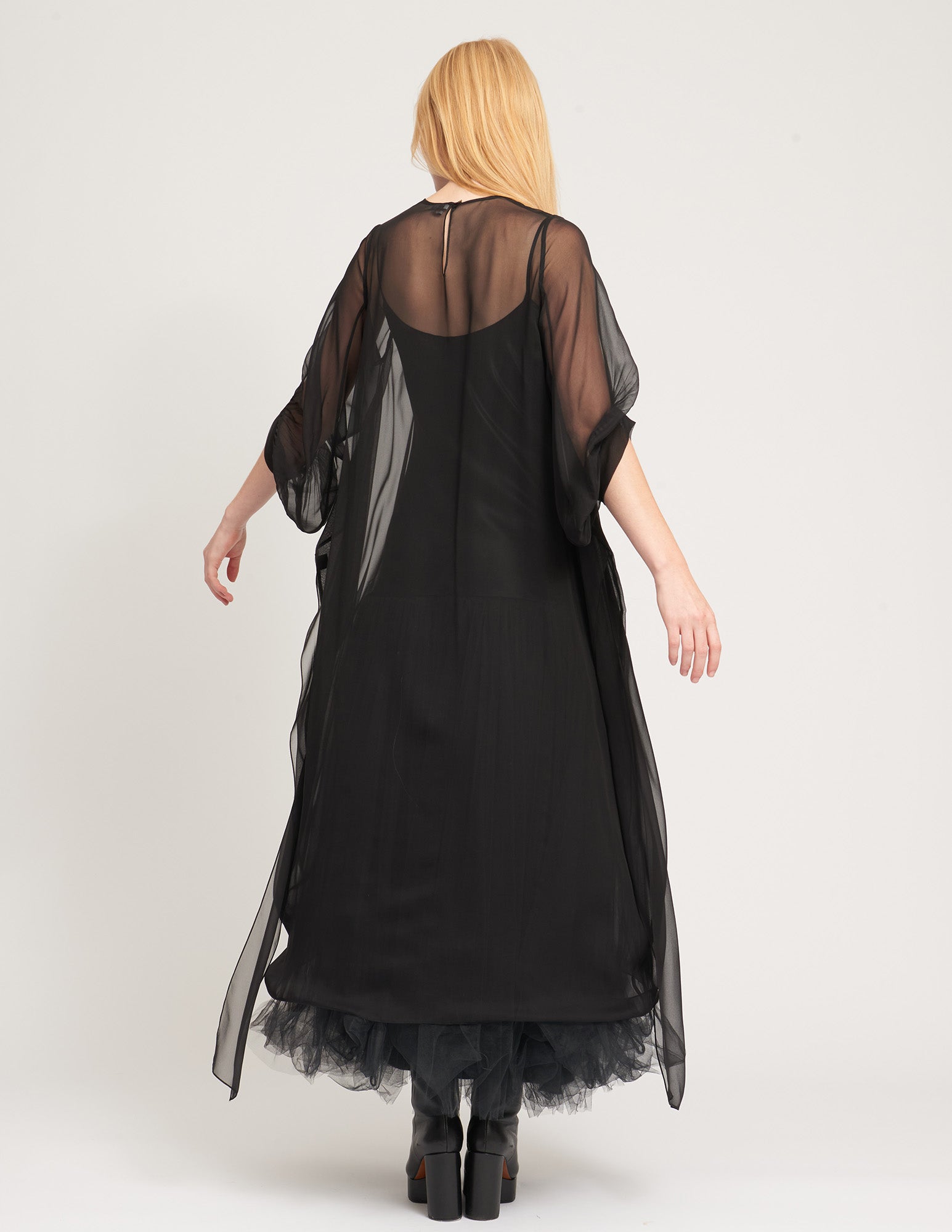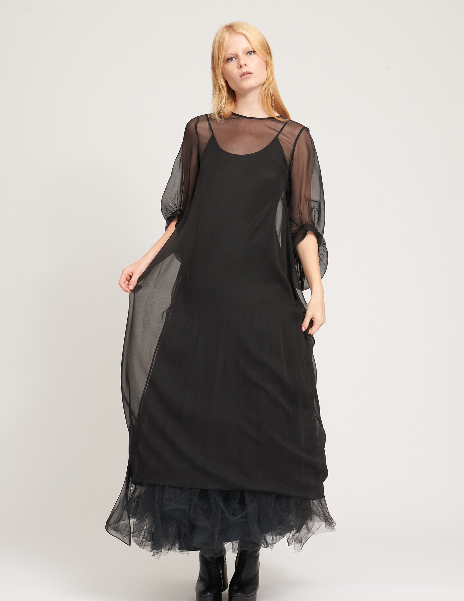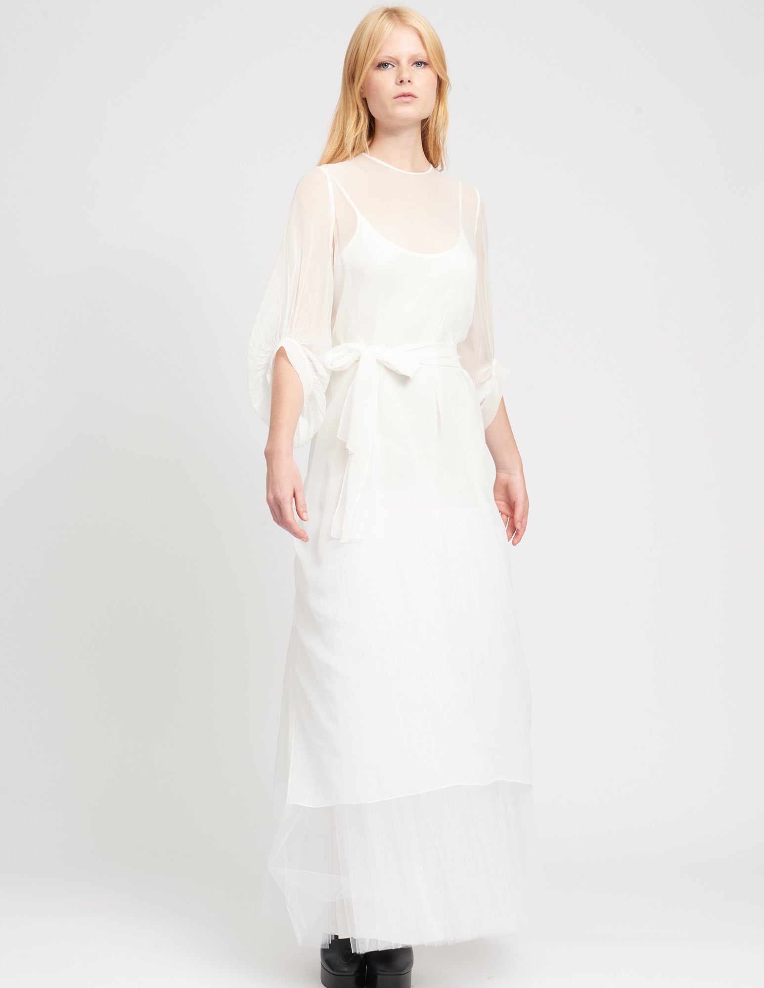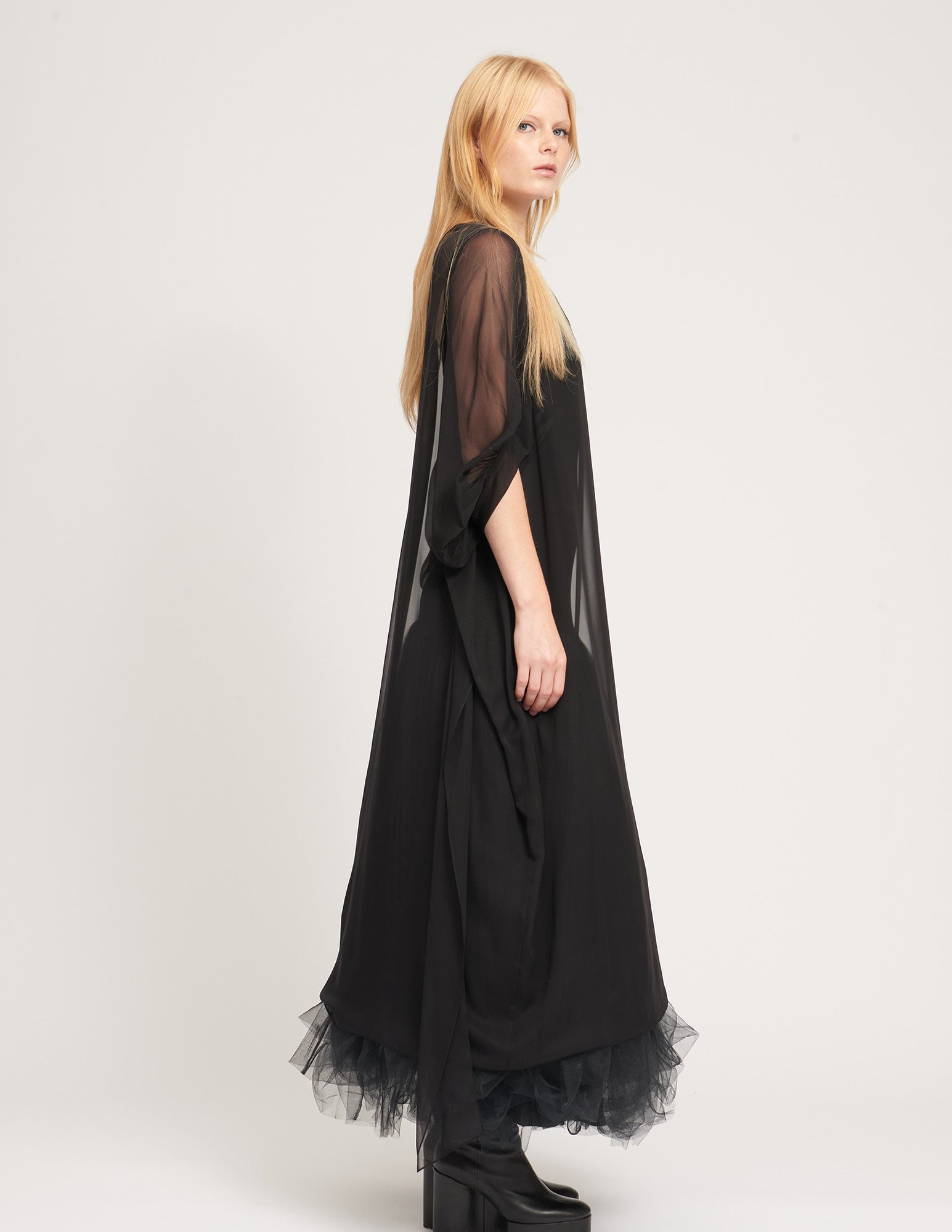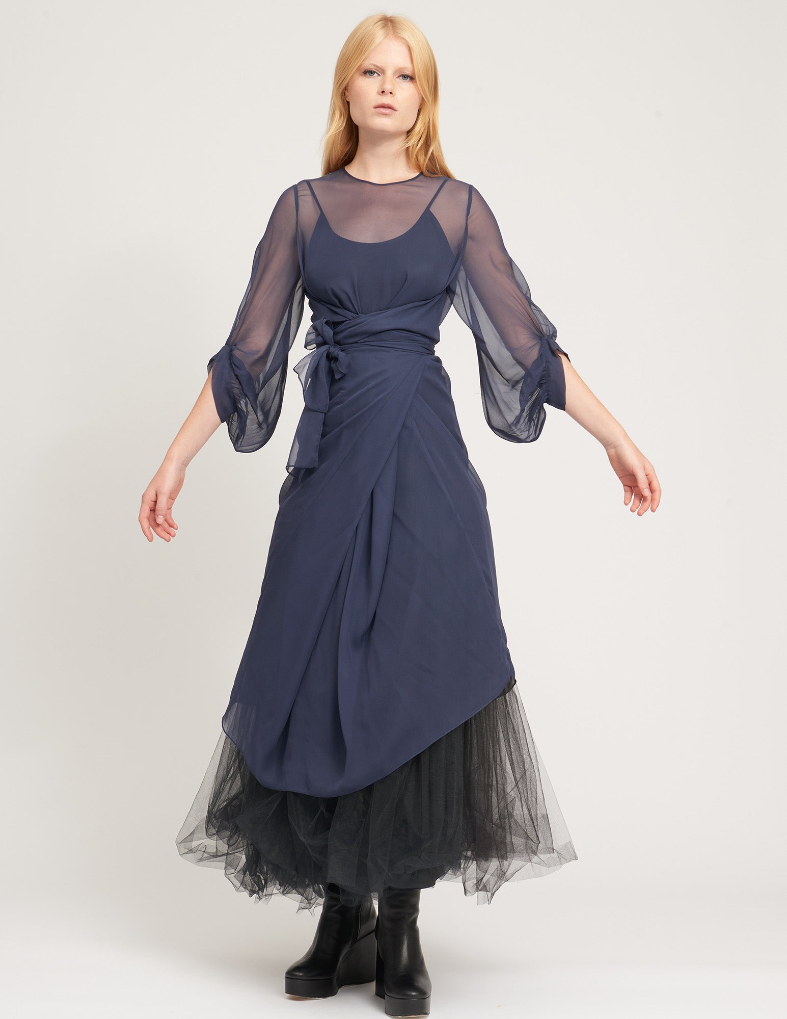 loose chiffon dress featuring a high neckline, half length voluminous sleeves, and two panels that can be tied, wrapped, or used to create a shorter silhouette. styled with the ellis crinoline.