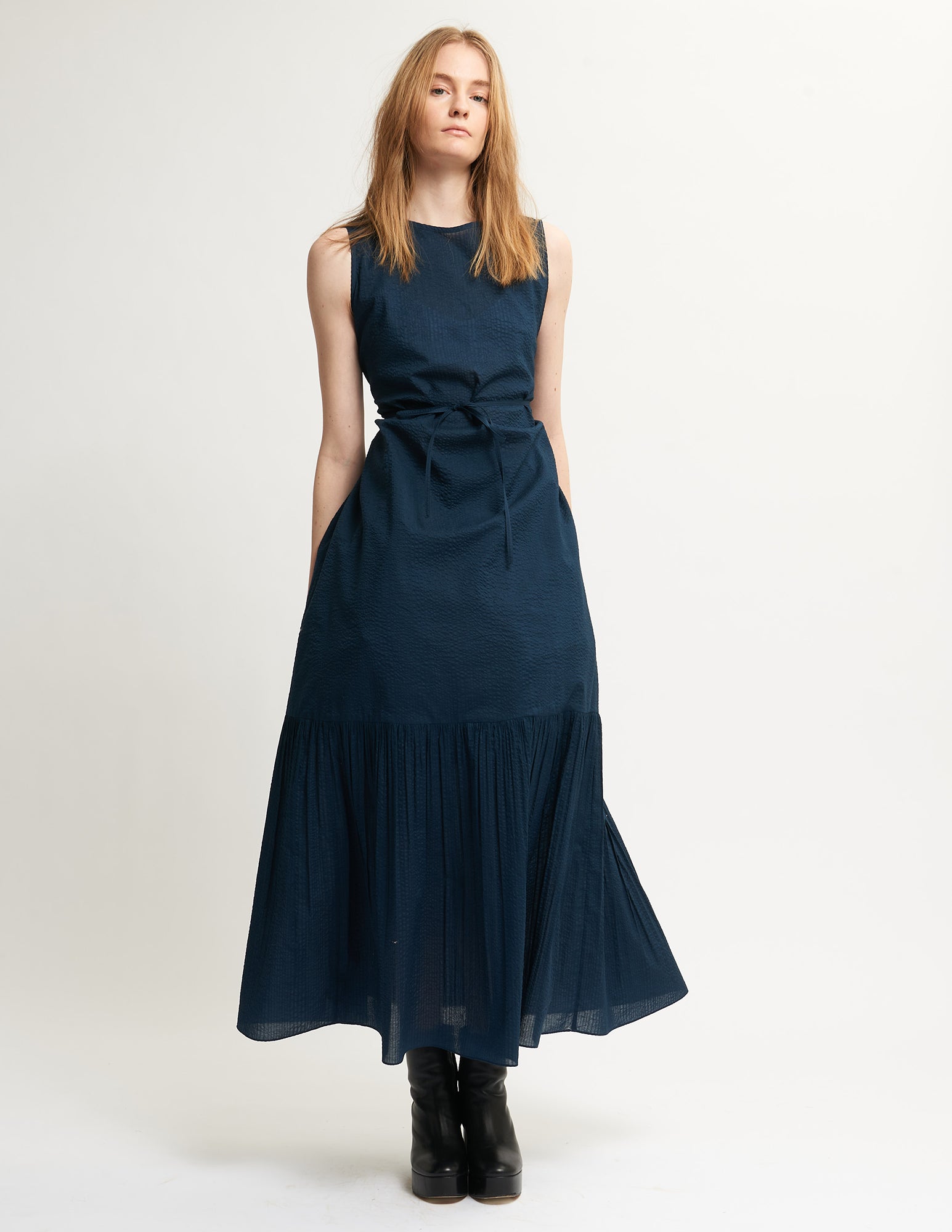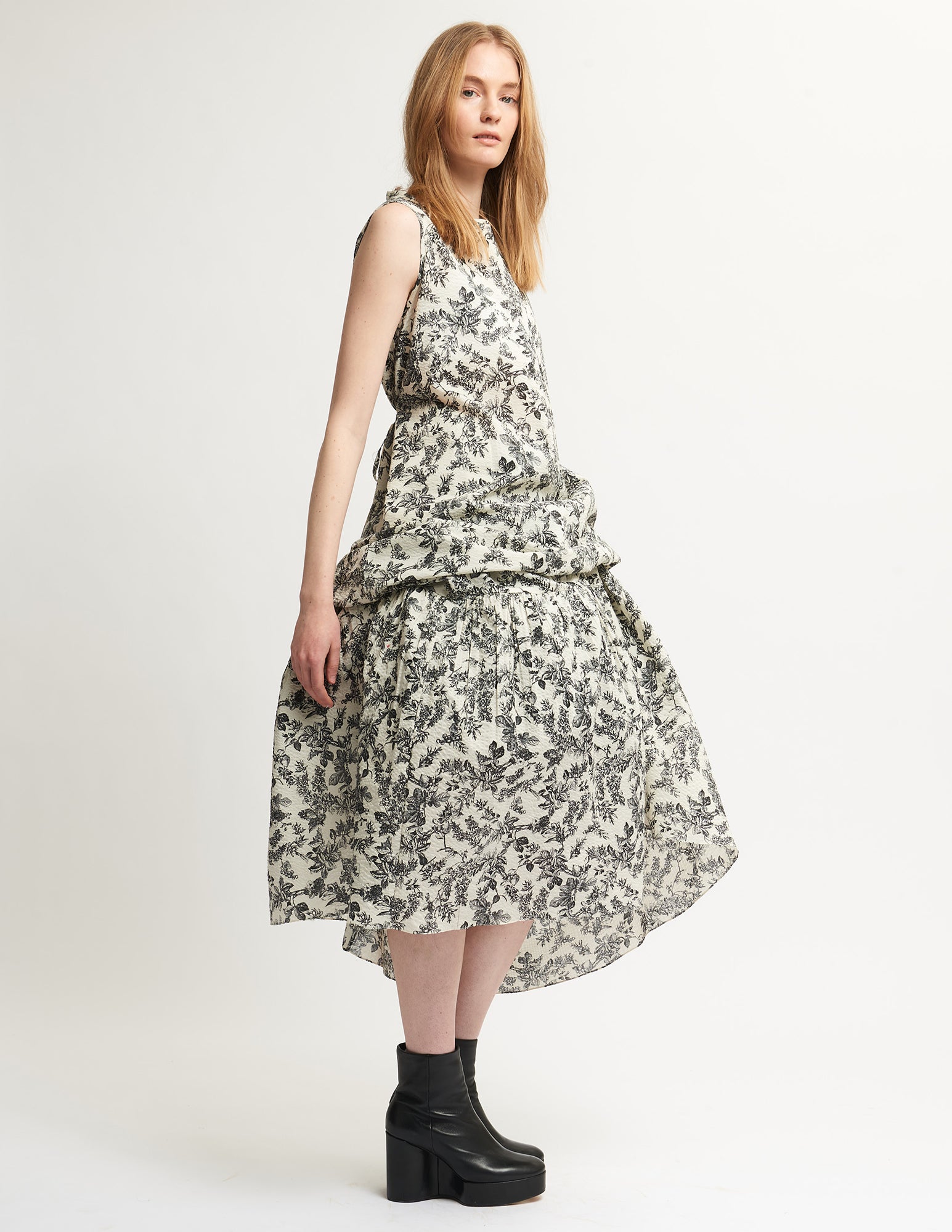 maxi a-line dress with an open neckline, ruffle panel, and interior ties to create drapery. styled with the st. mortiz crinoline.