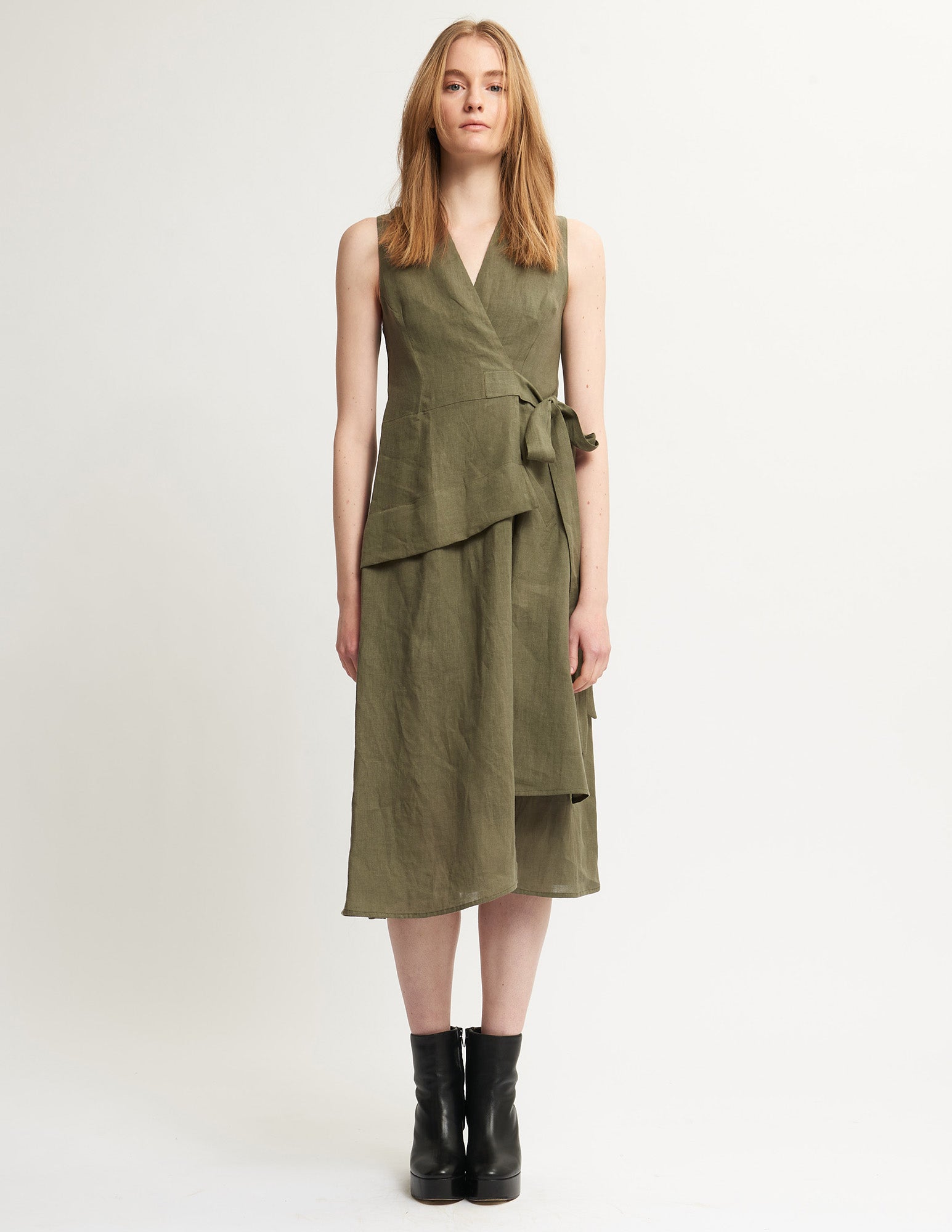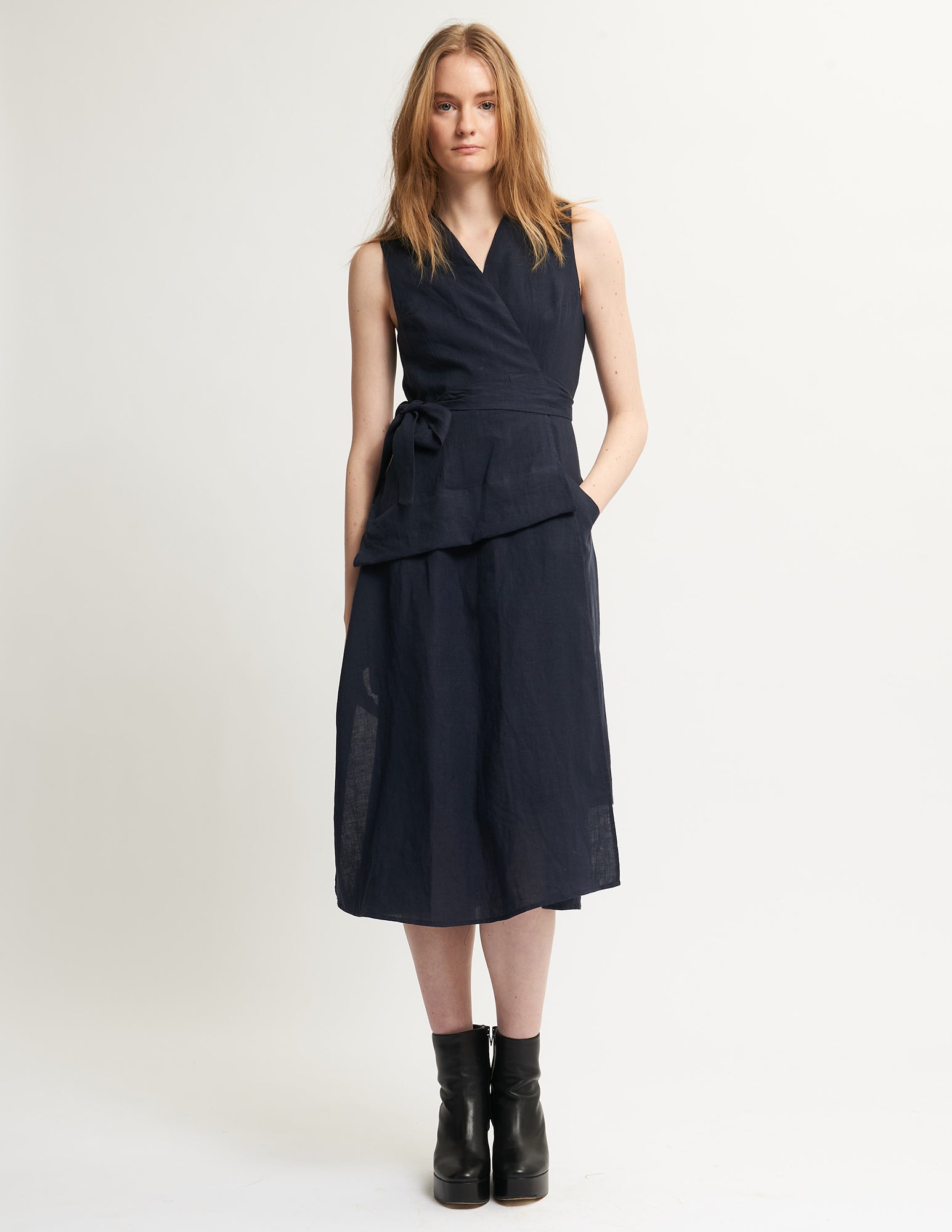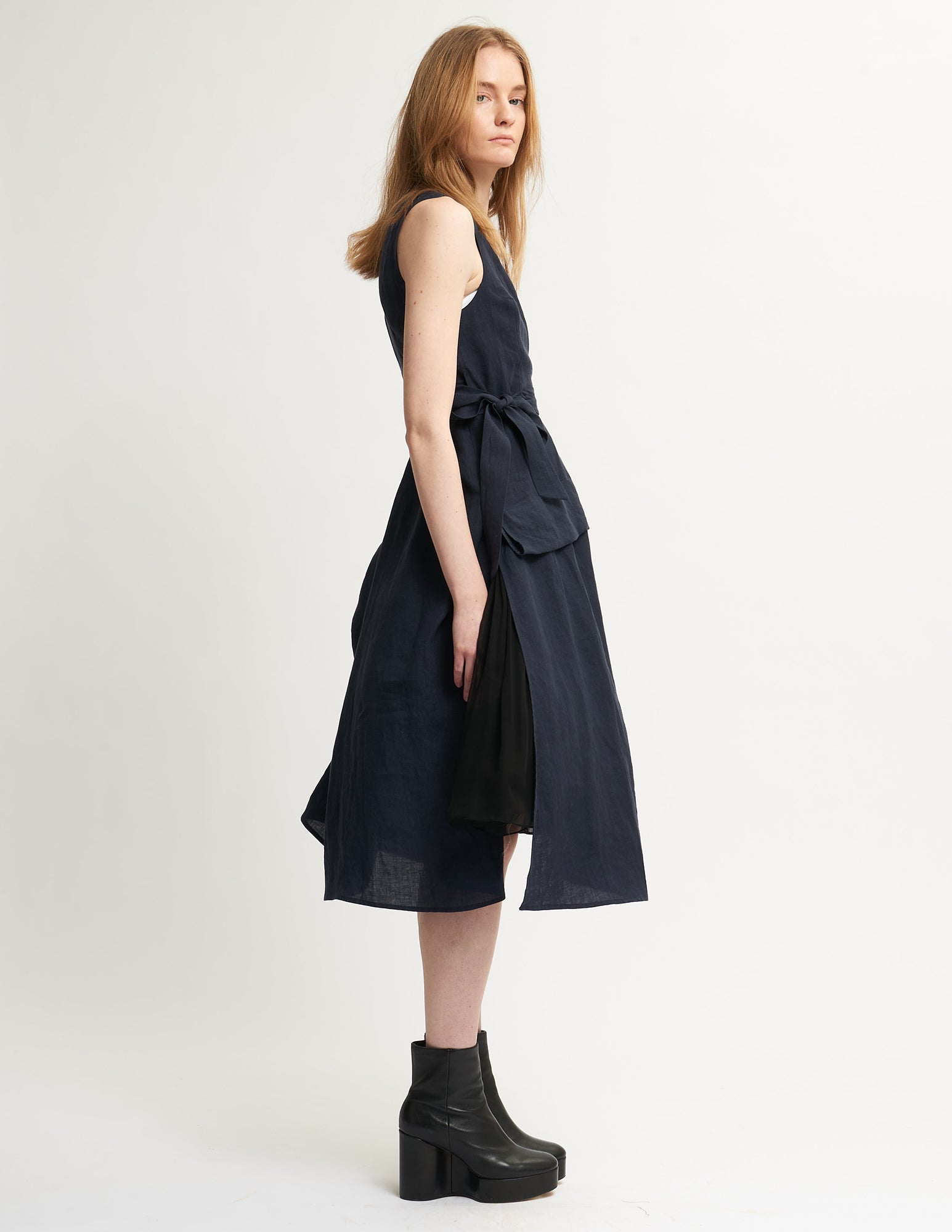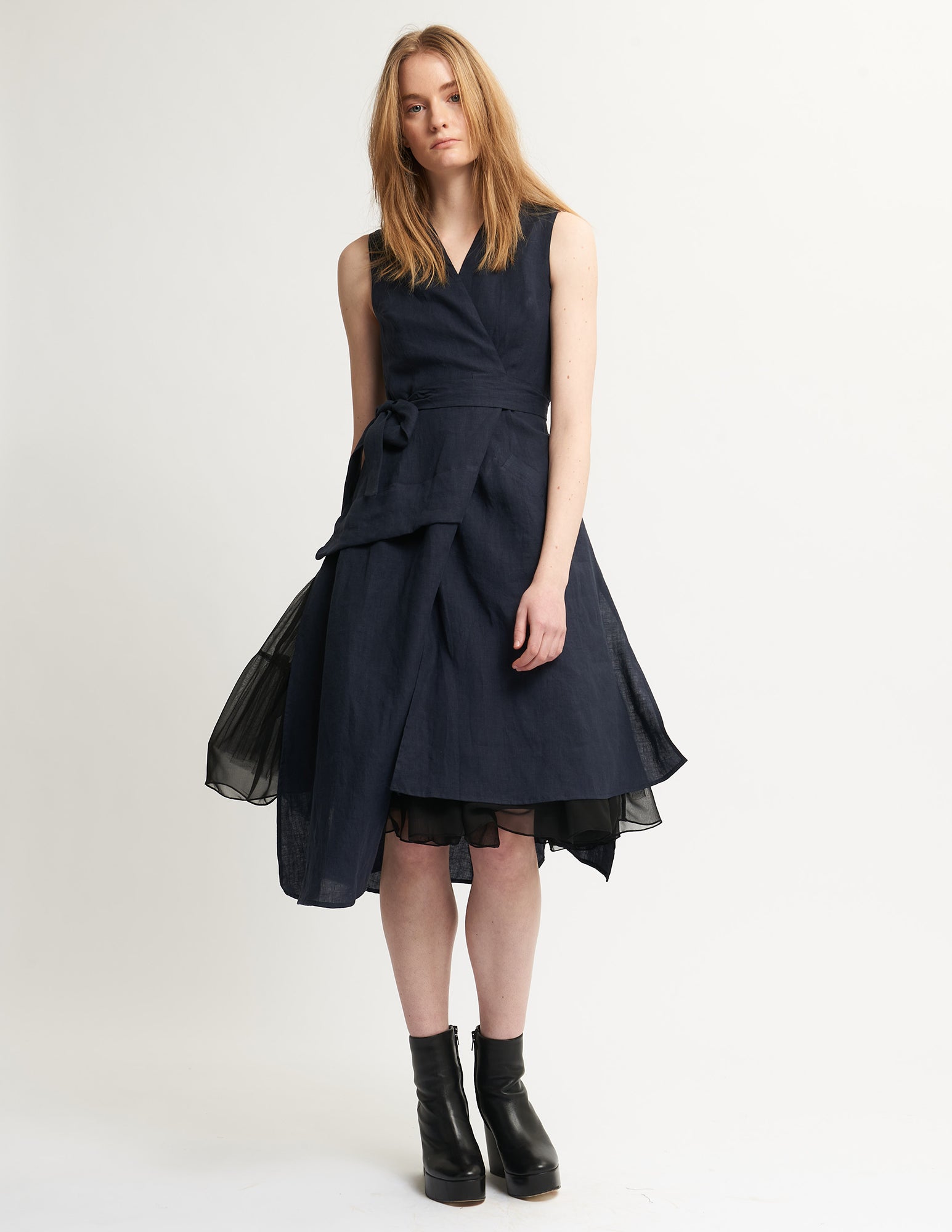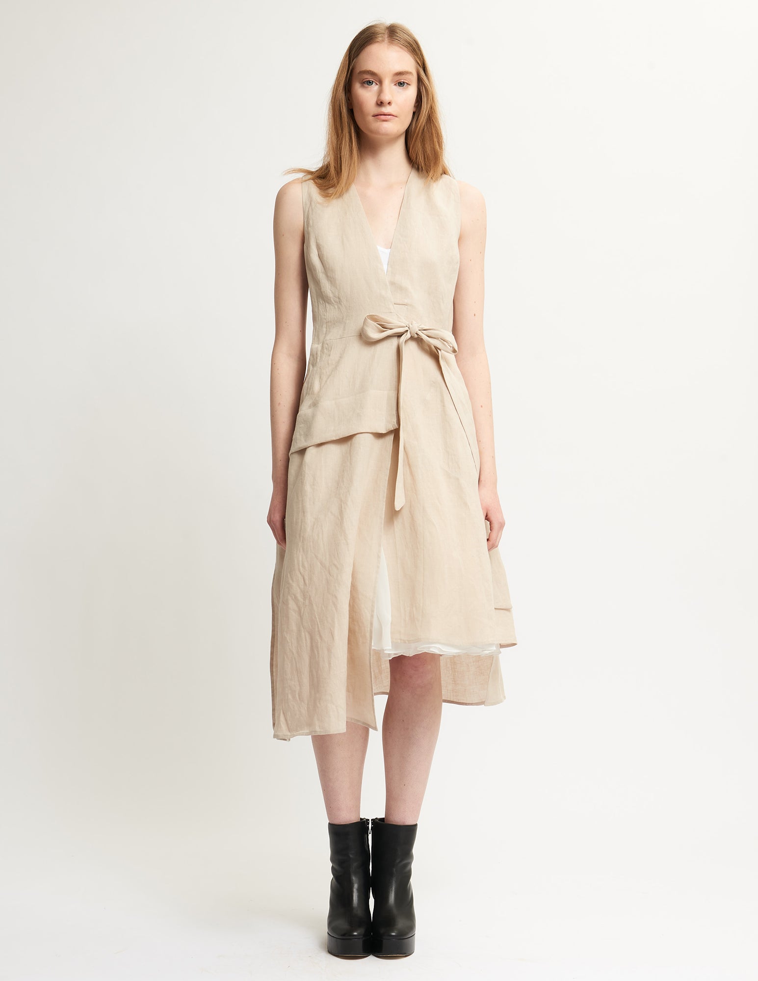 fitted maxi vest with wrap around tie detail and layered draping with optional ties for additional bustling. styled with the galileo skirt.
