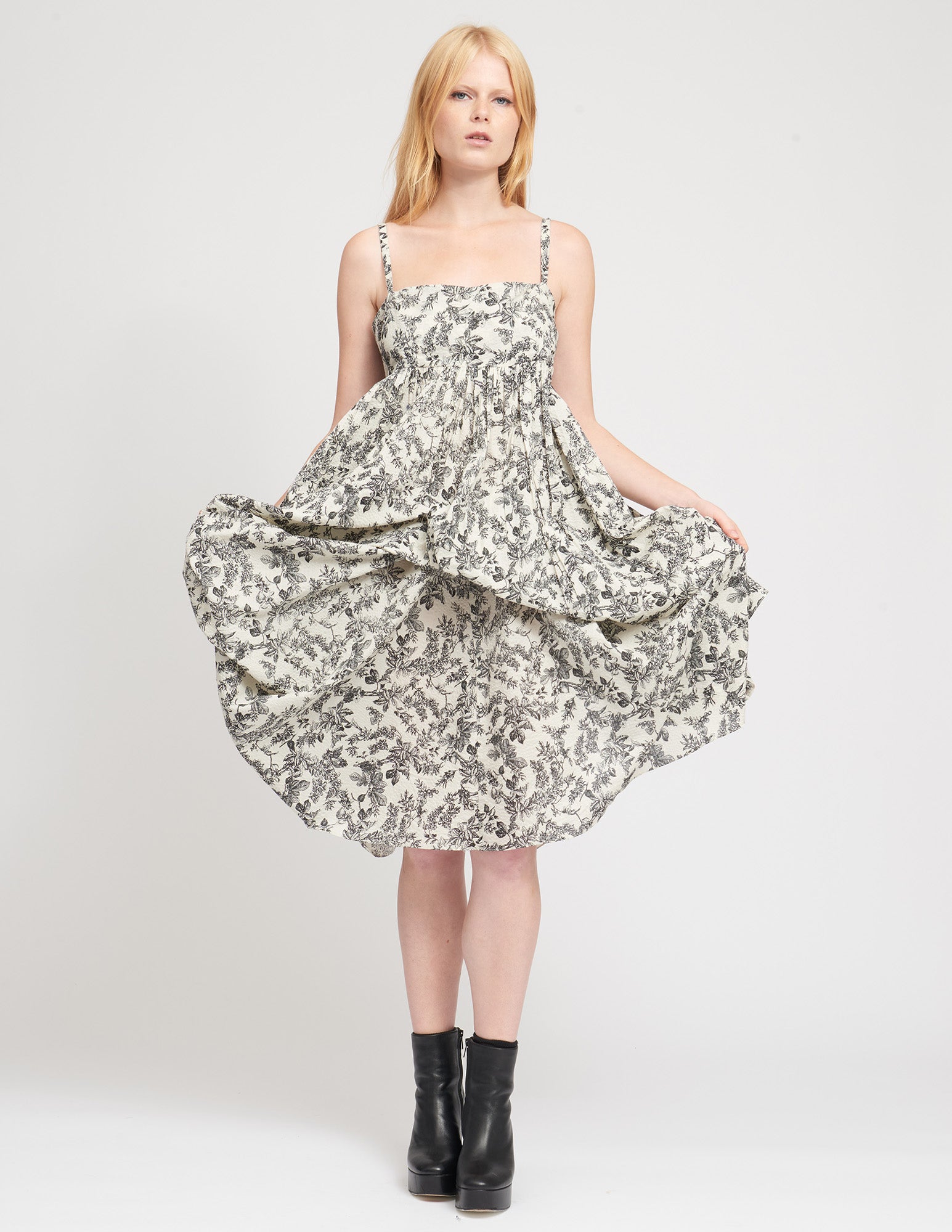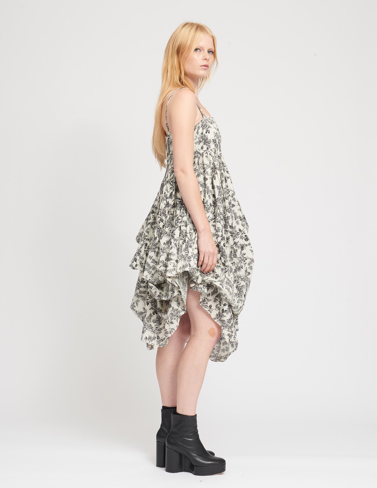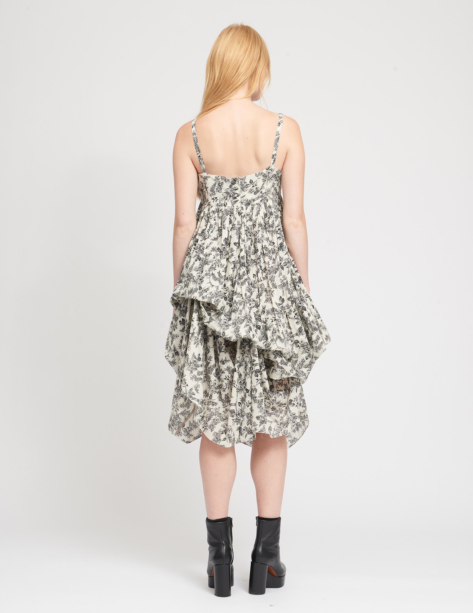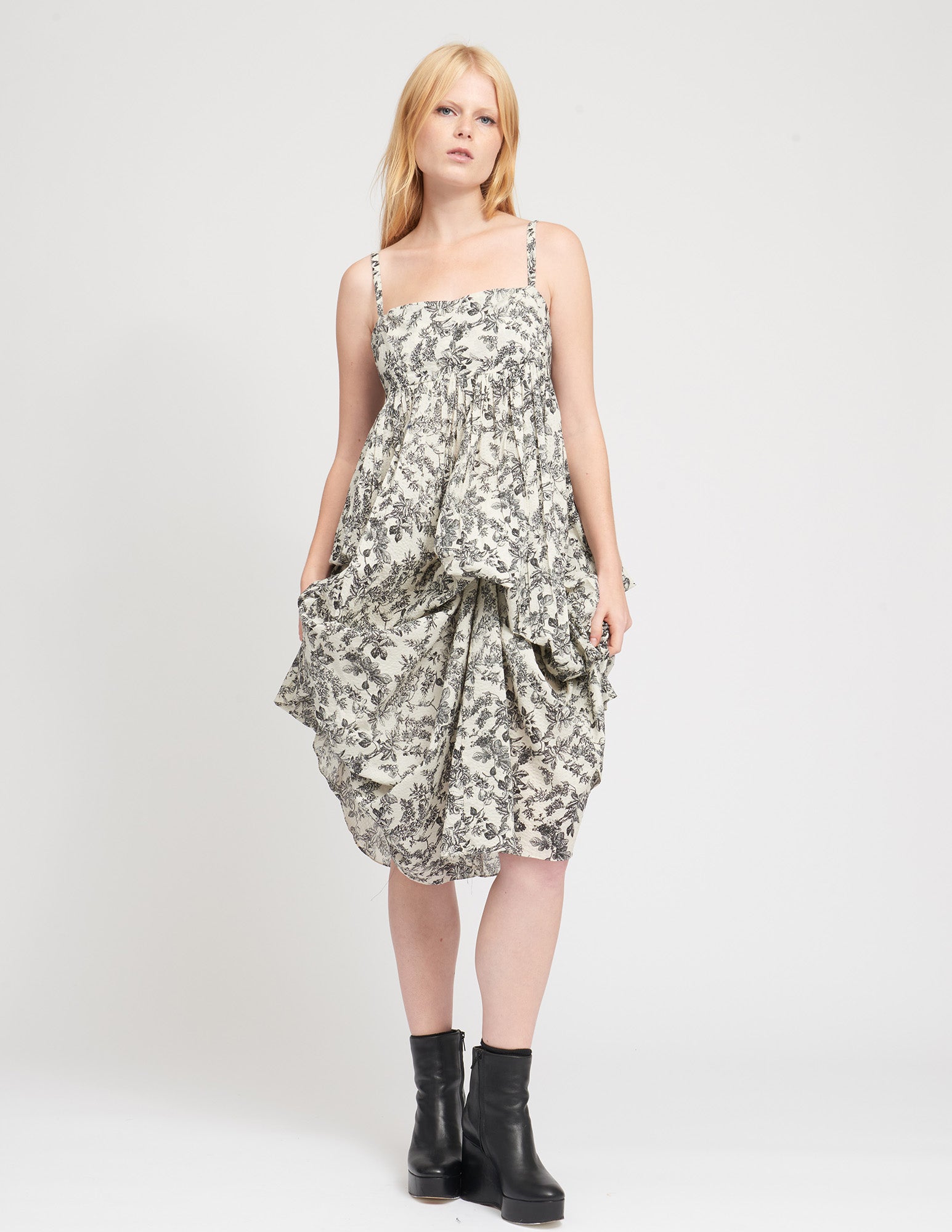 ballgown with a fitted bodice, spaghetti straps, and an a-line silhouette with several interior ties to create romantic drapery.