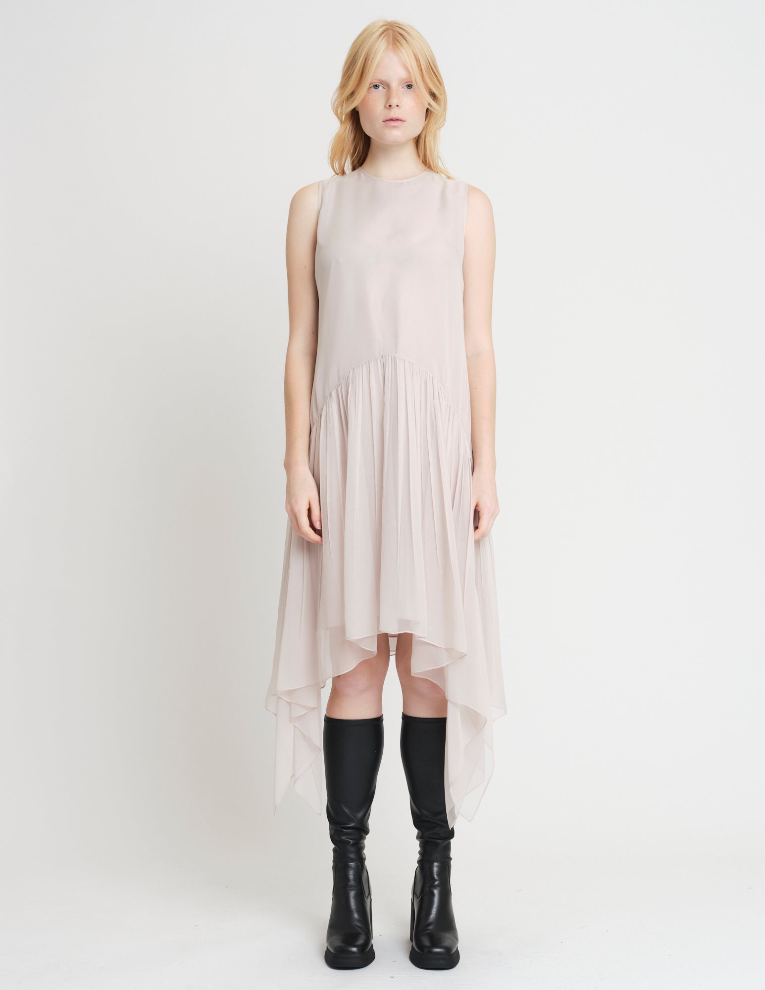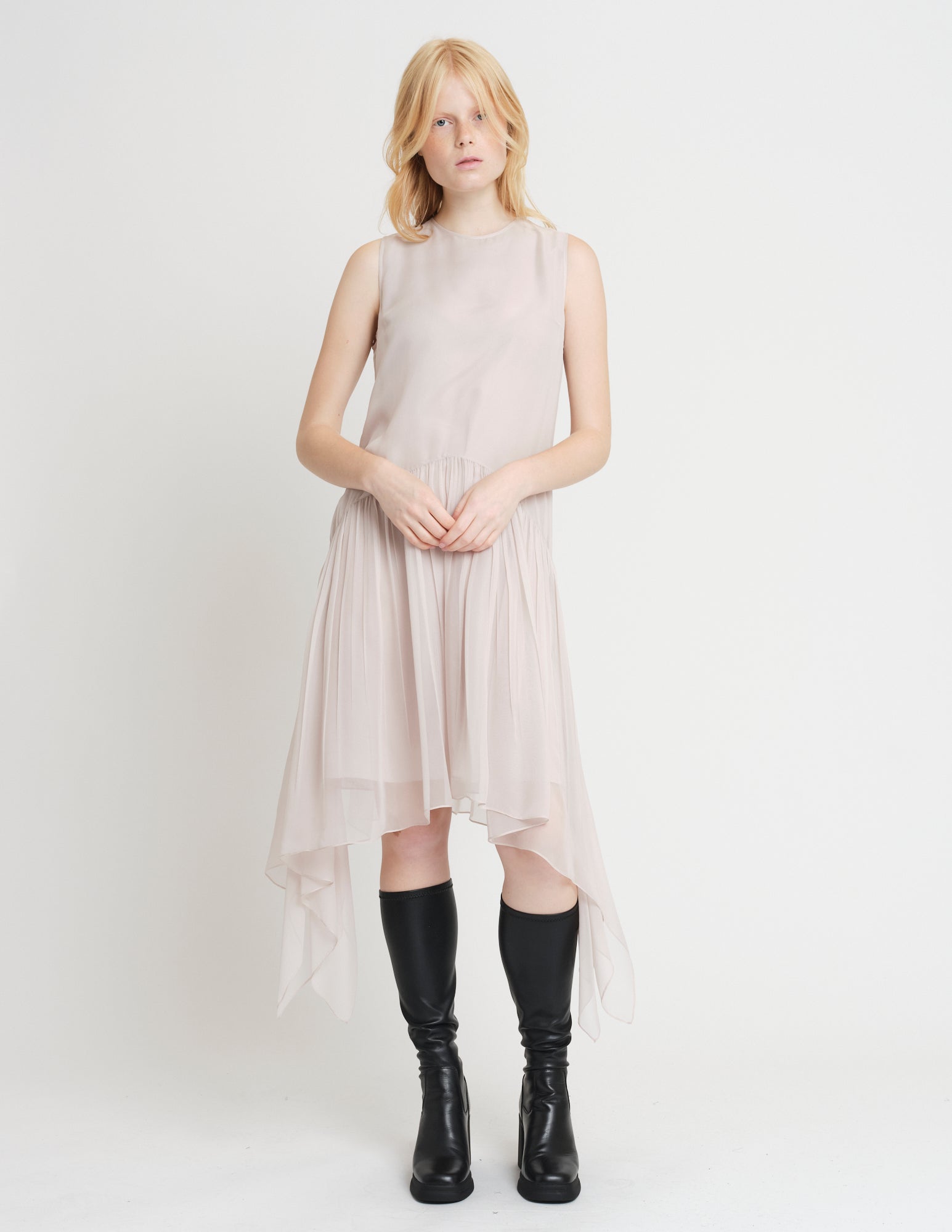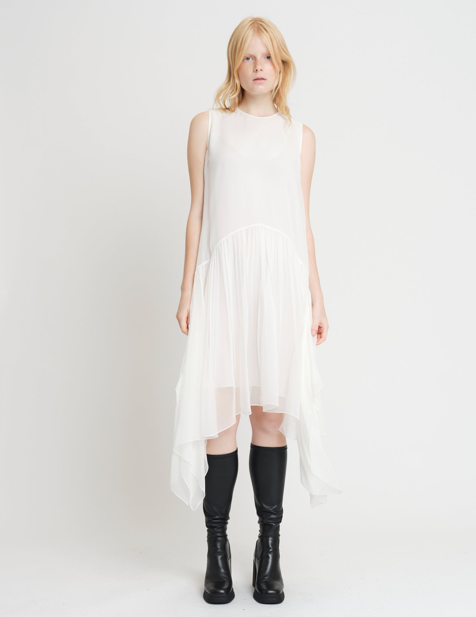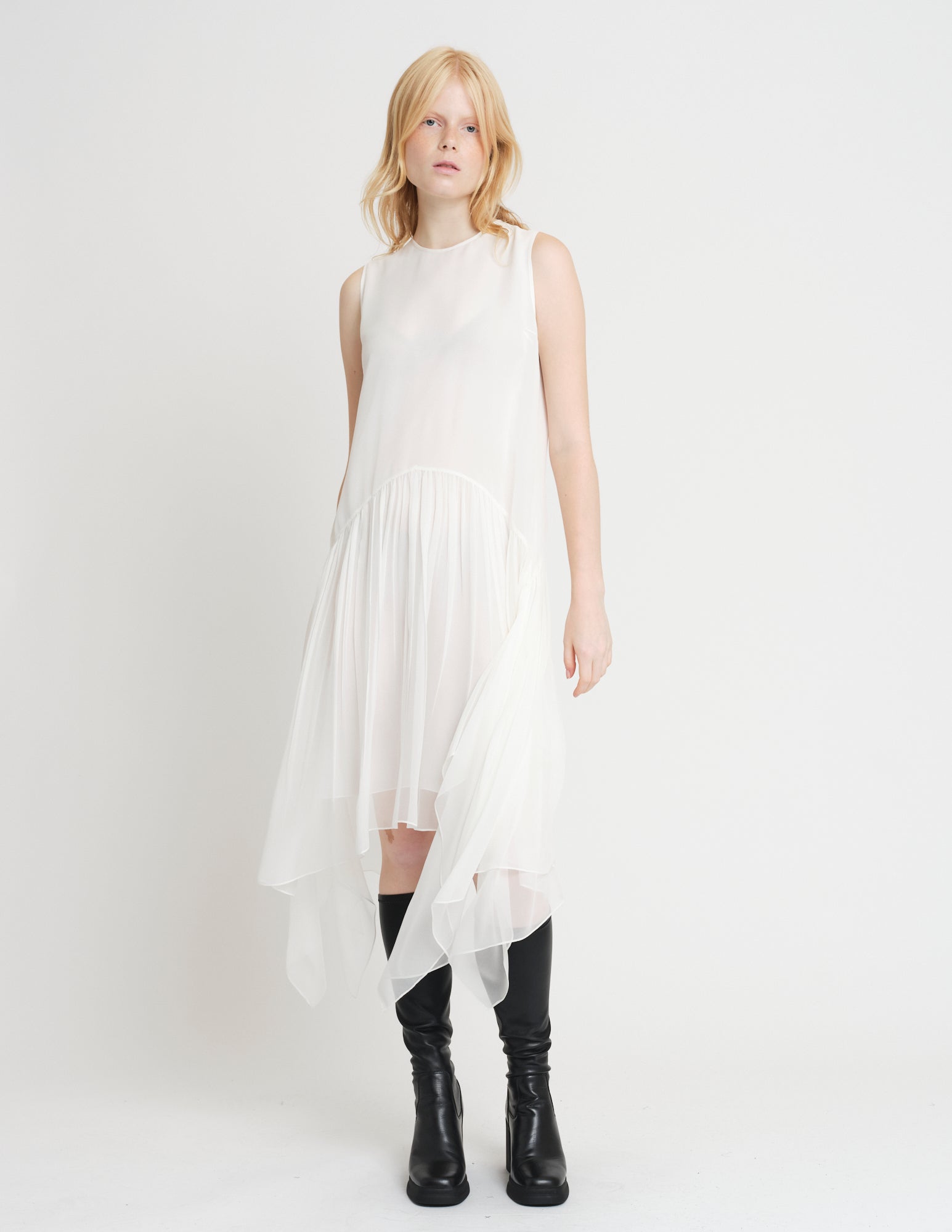 sleeveless silk chiffon dress featuring a-line silhouette, angled waist seam, and delicate asymmetrical shirred skirt. styled with the aura crinoline.