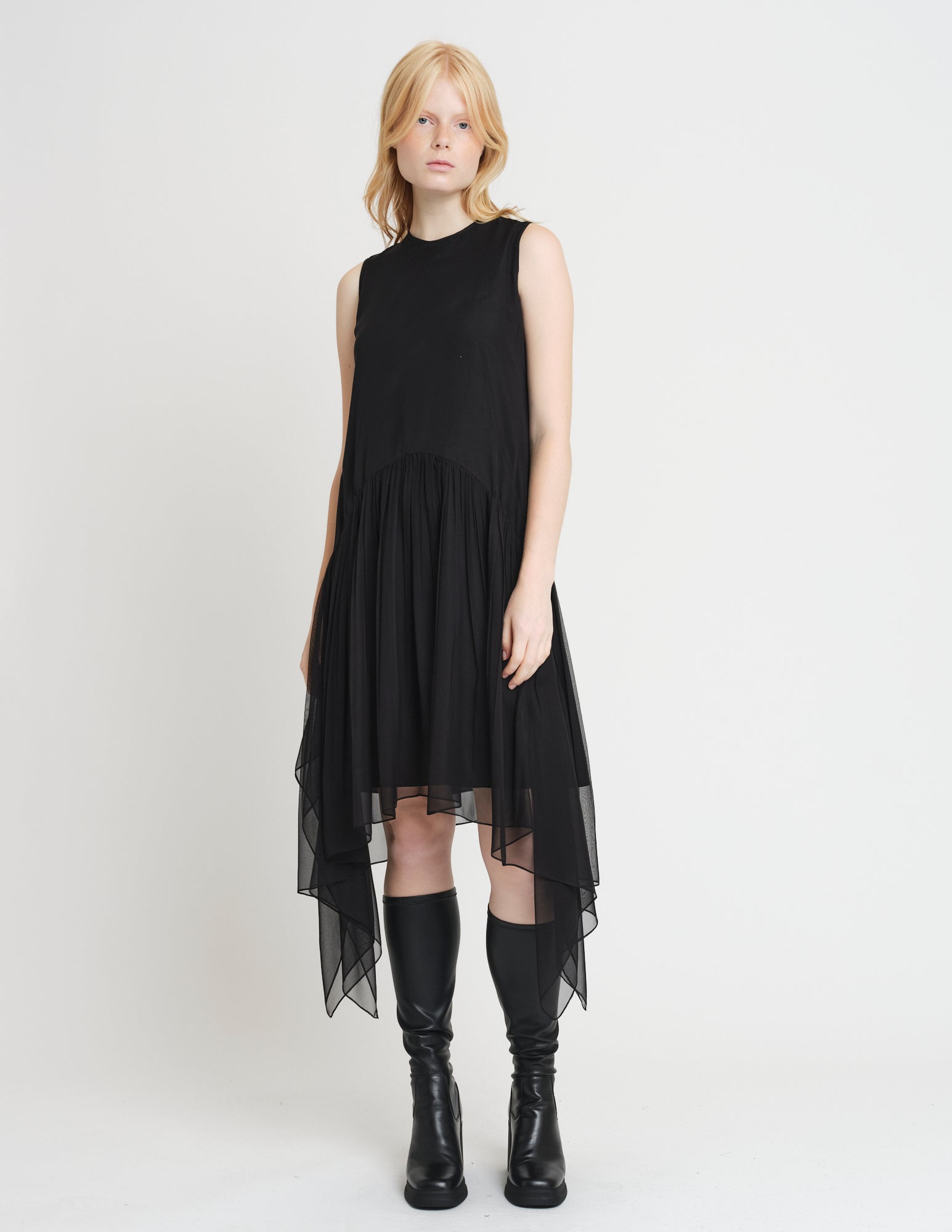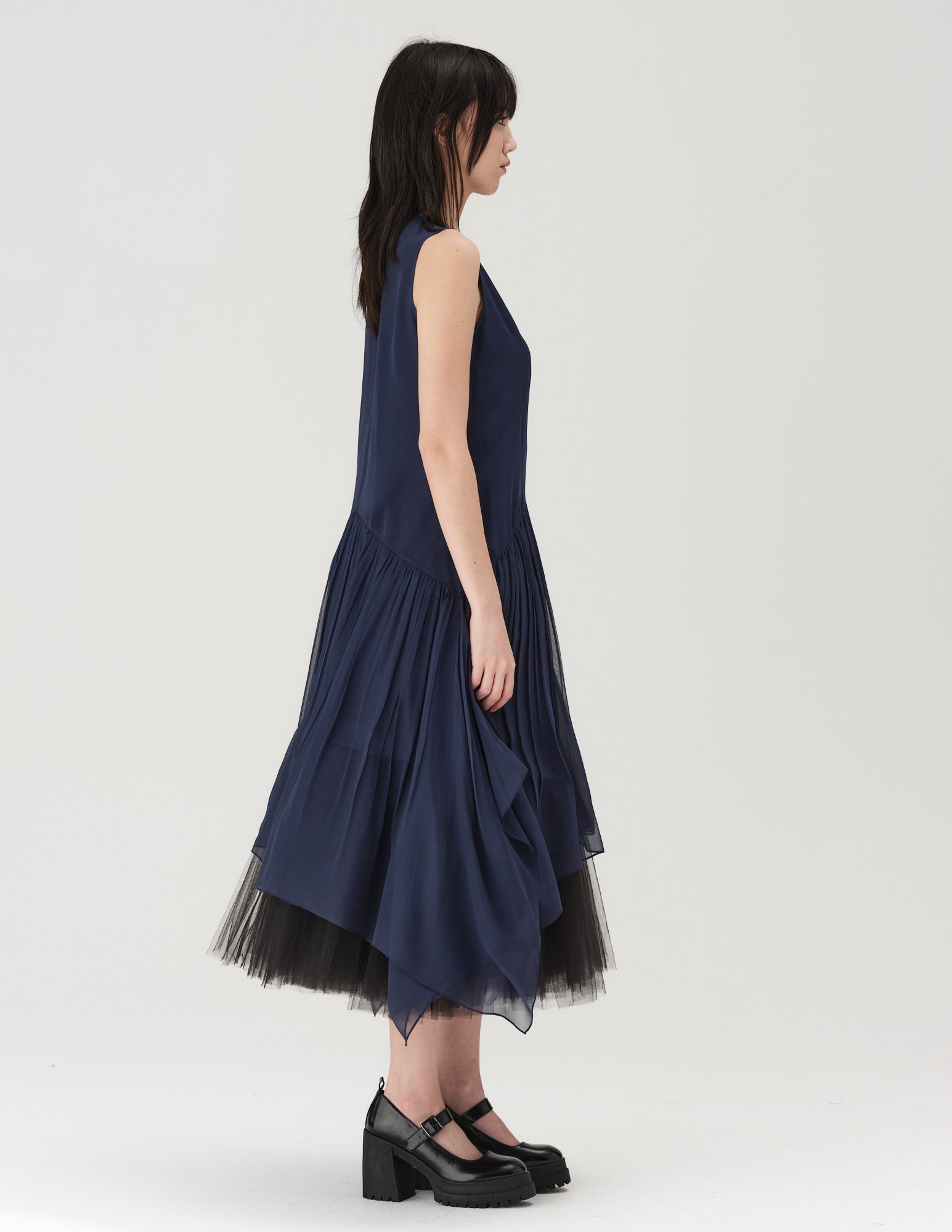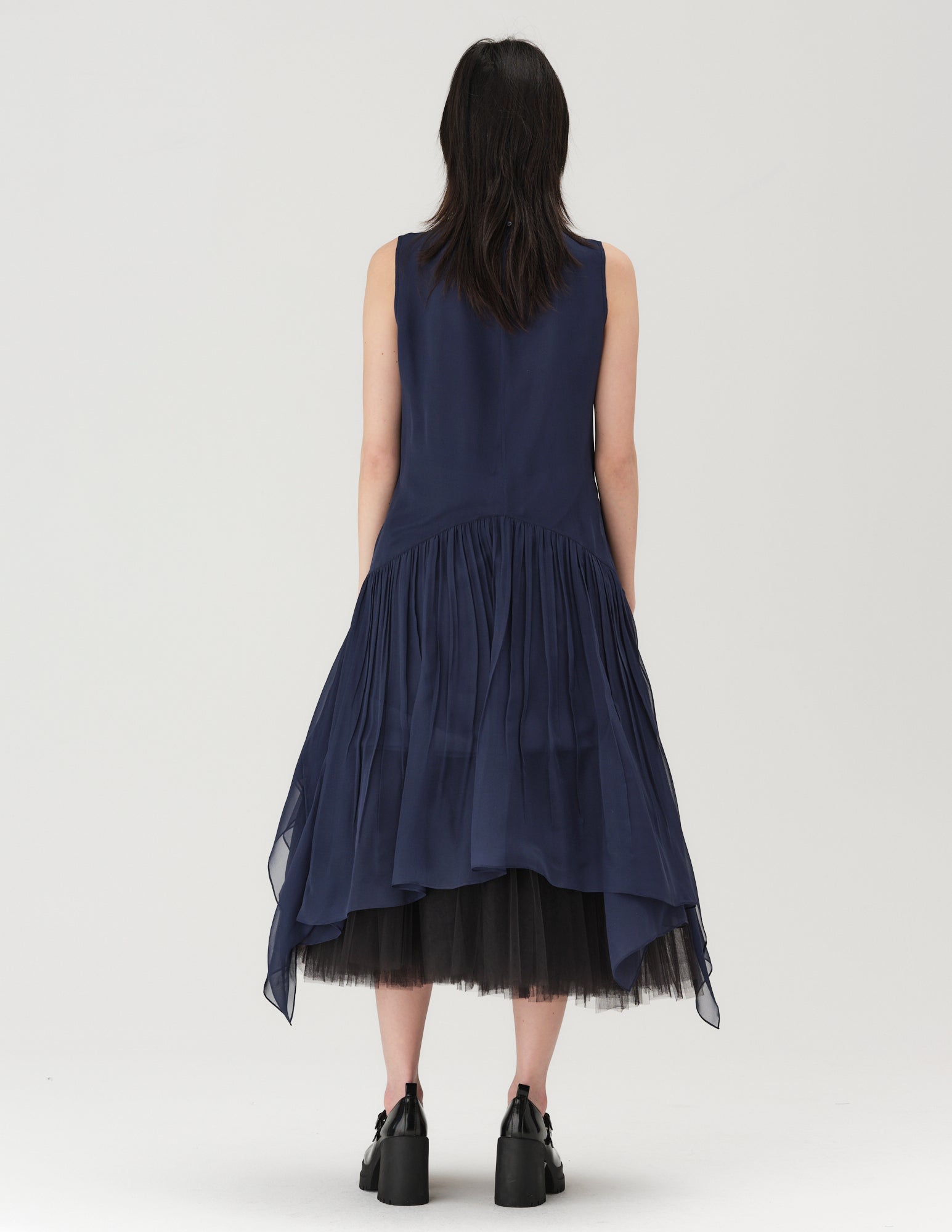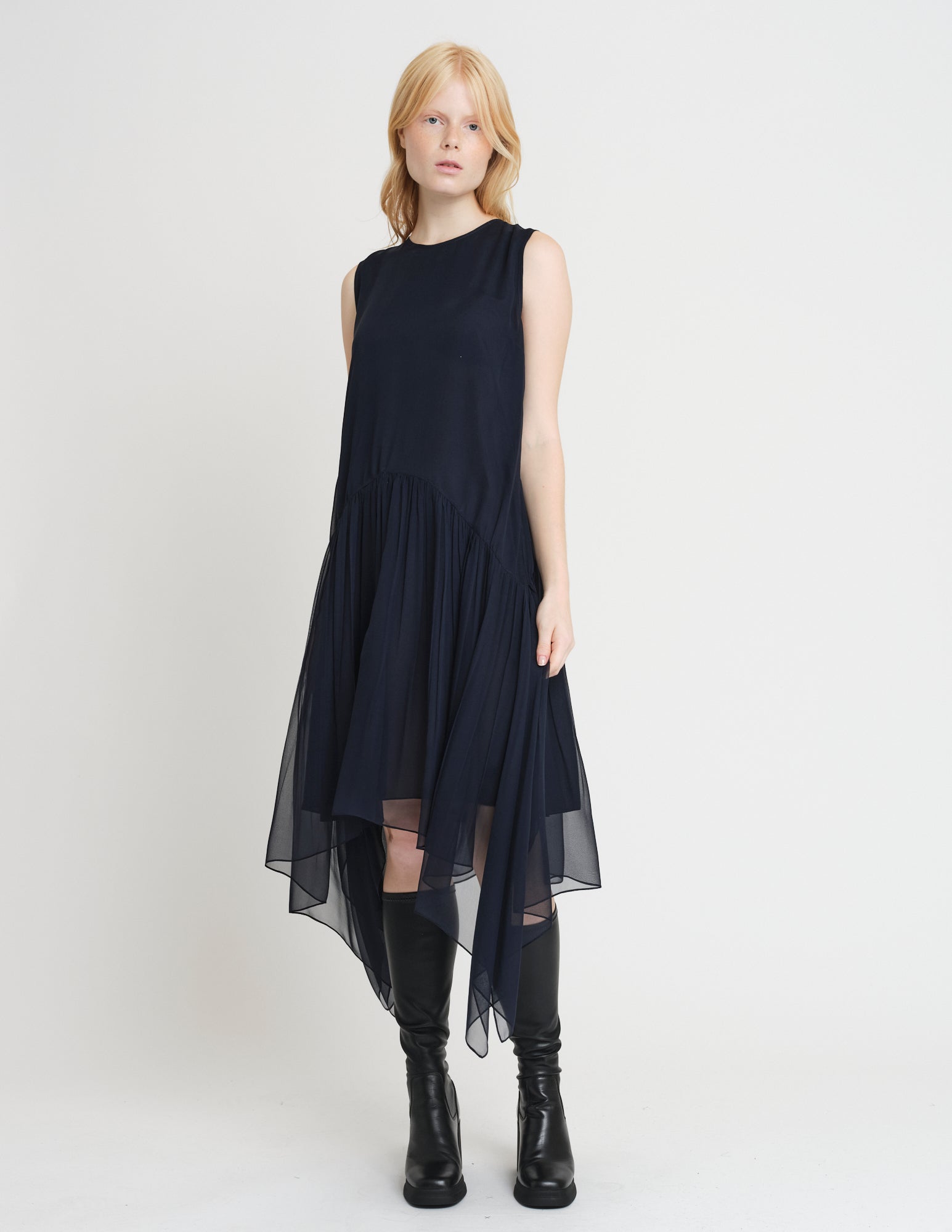 sleeveless silk chiffon dress featuring a-line silhouette, angled waist seam, and delicate asymmetrical shirred skirt. styled with the aura crinoline.