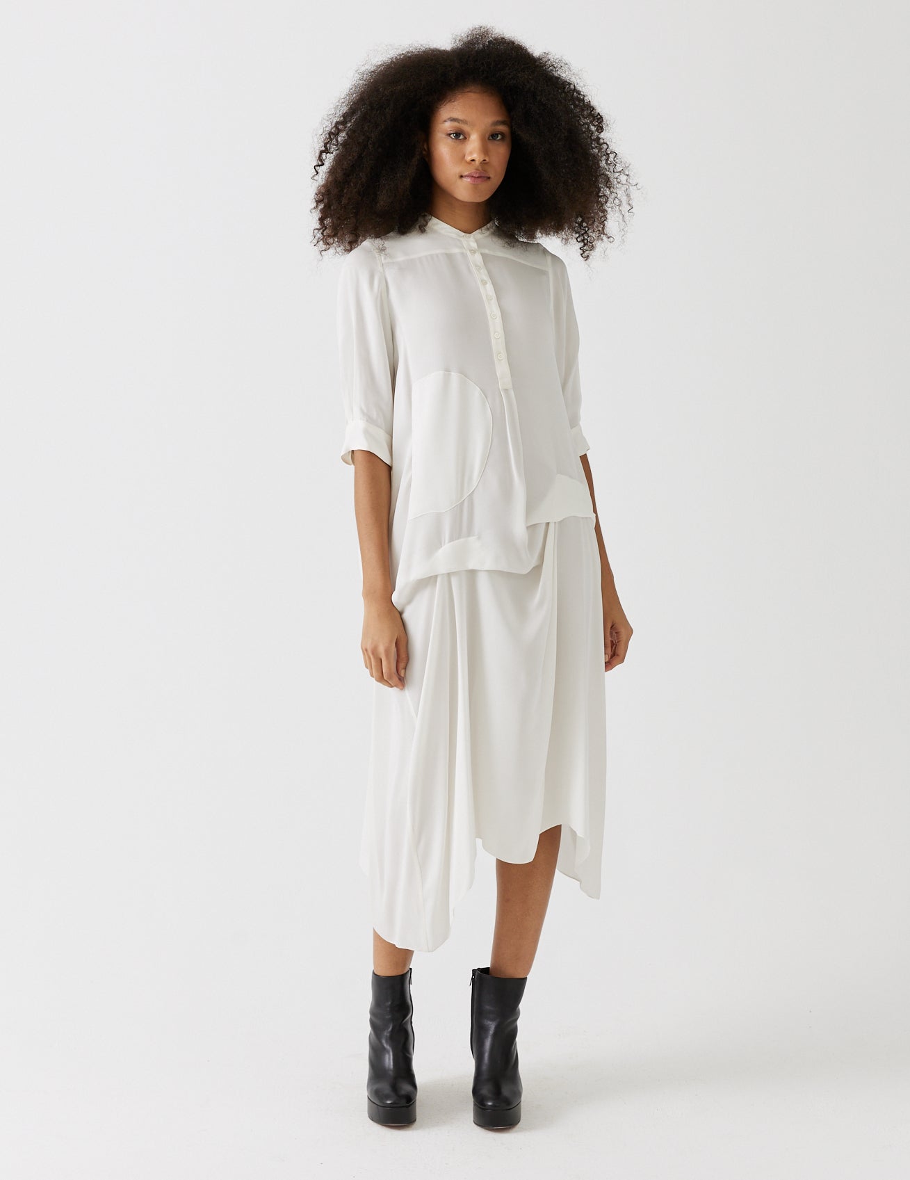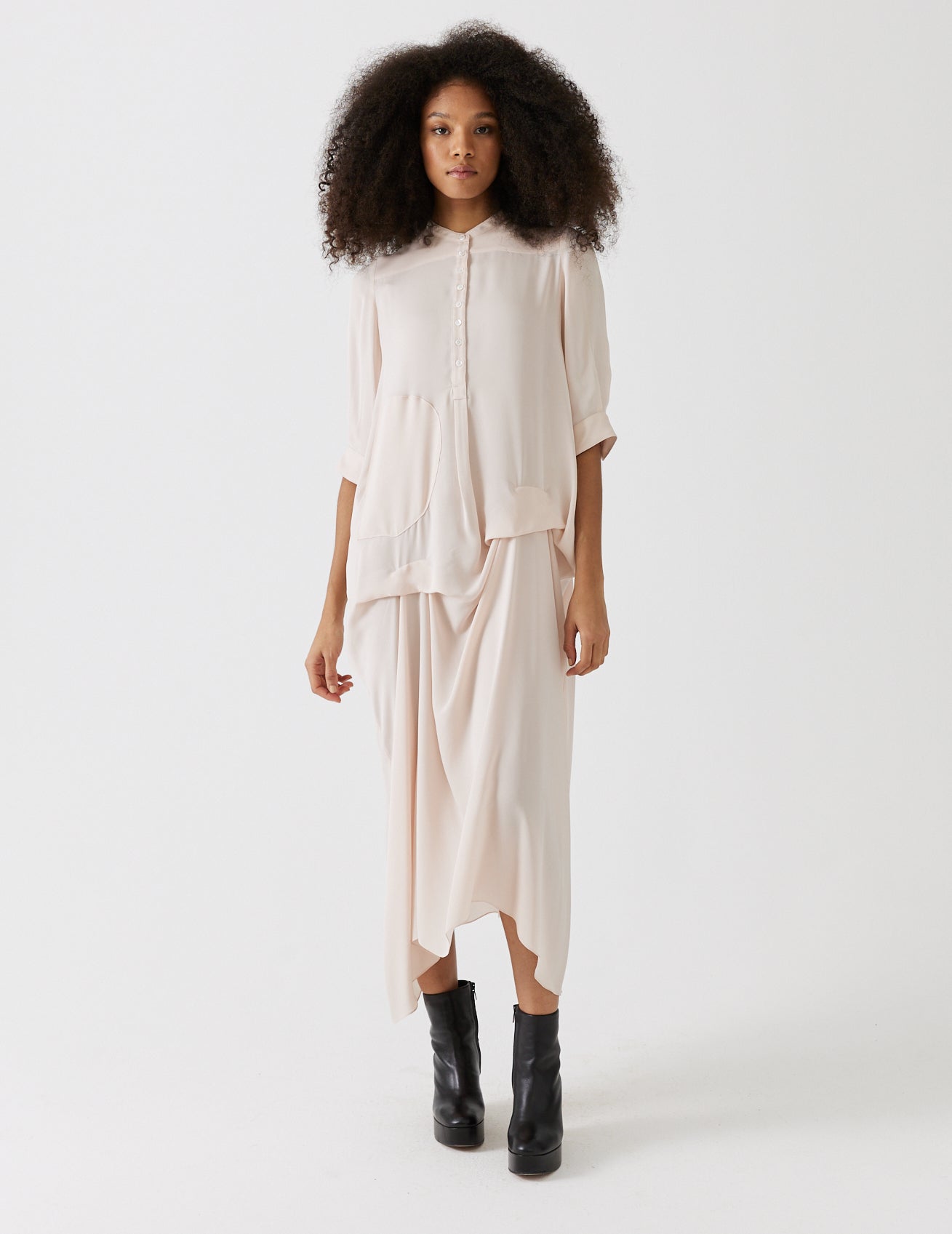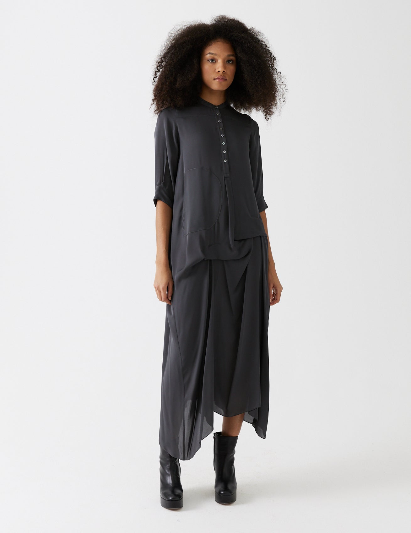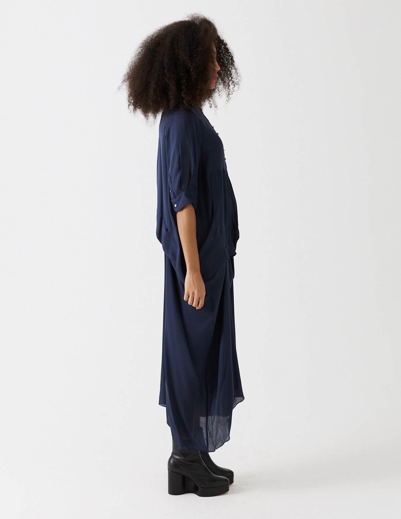 midi double georgette dress featuring center-front button closures, a rounded pocket, and asymmetrical drapes.