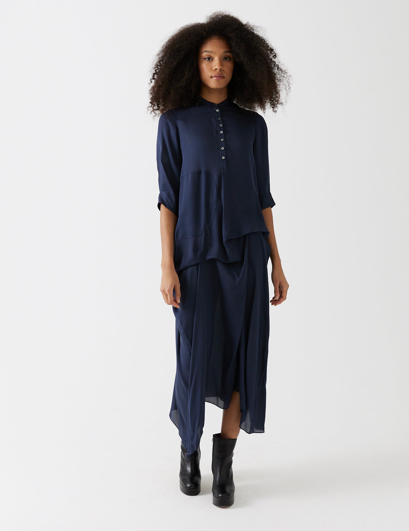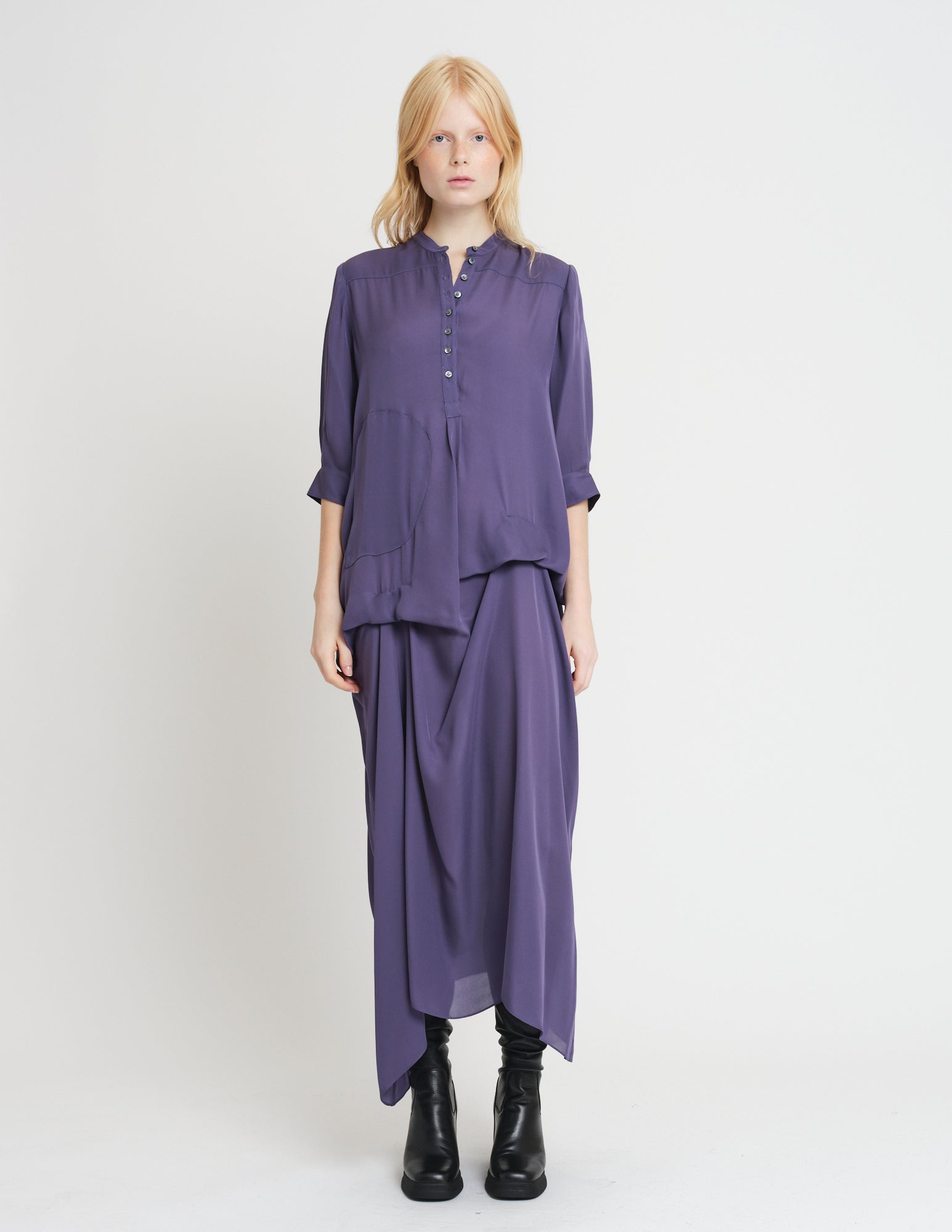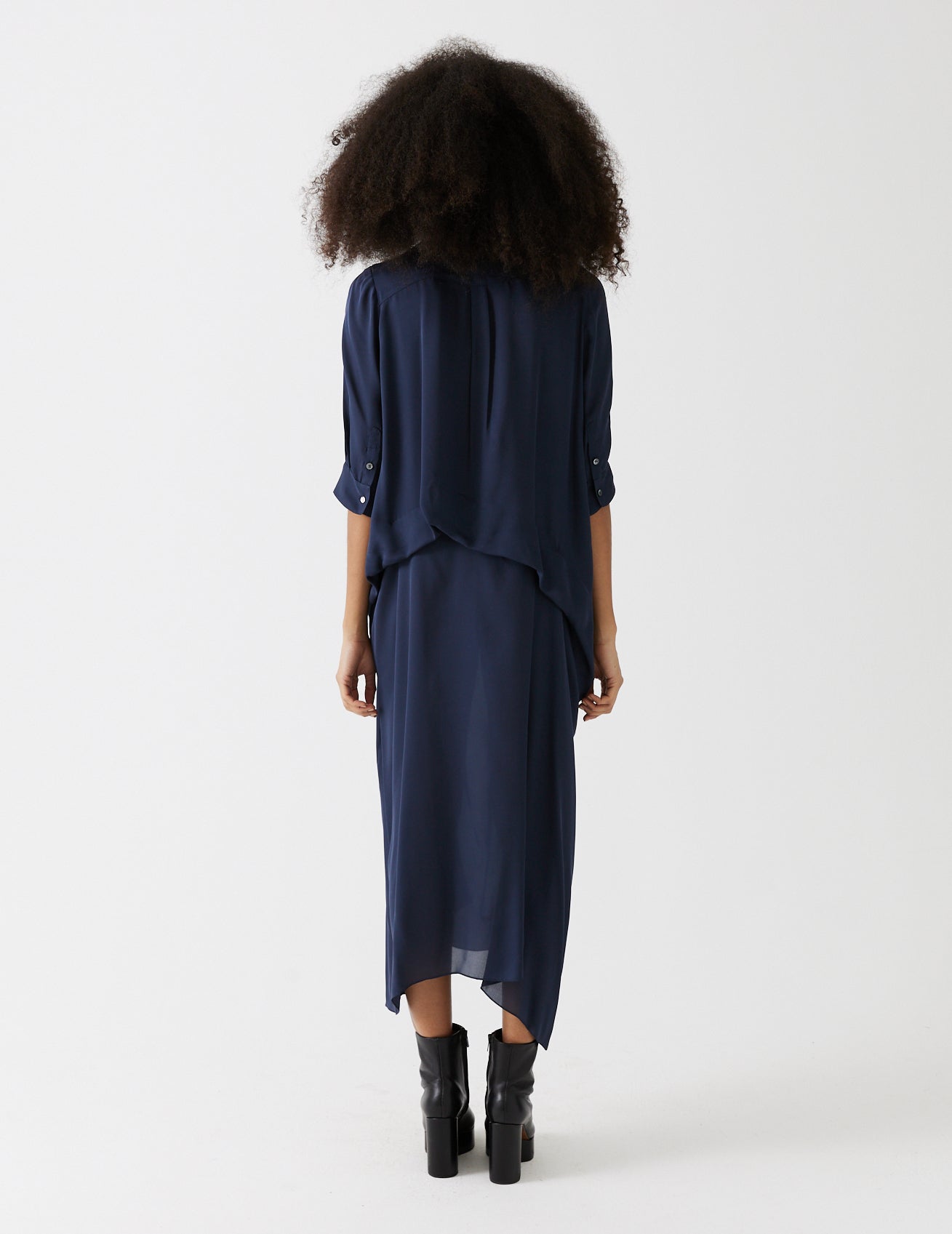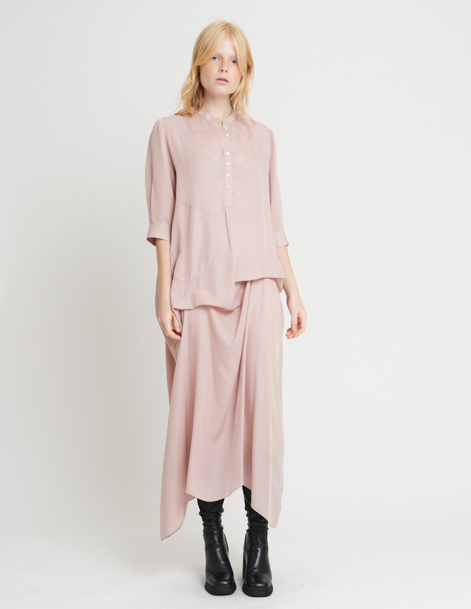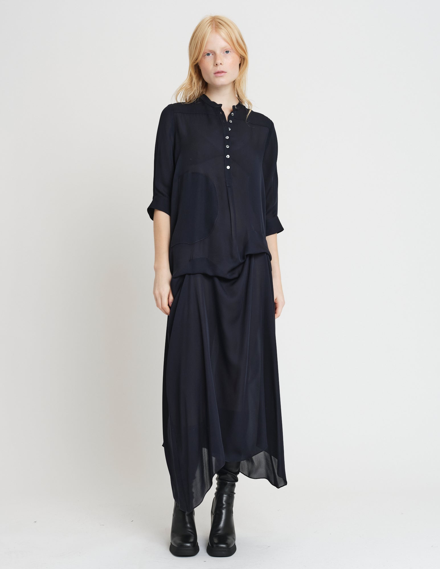 midi double georgette dress featuring center-front button closures, a rounded pocket, and asymmetrical drapes.