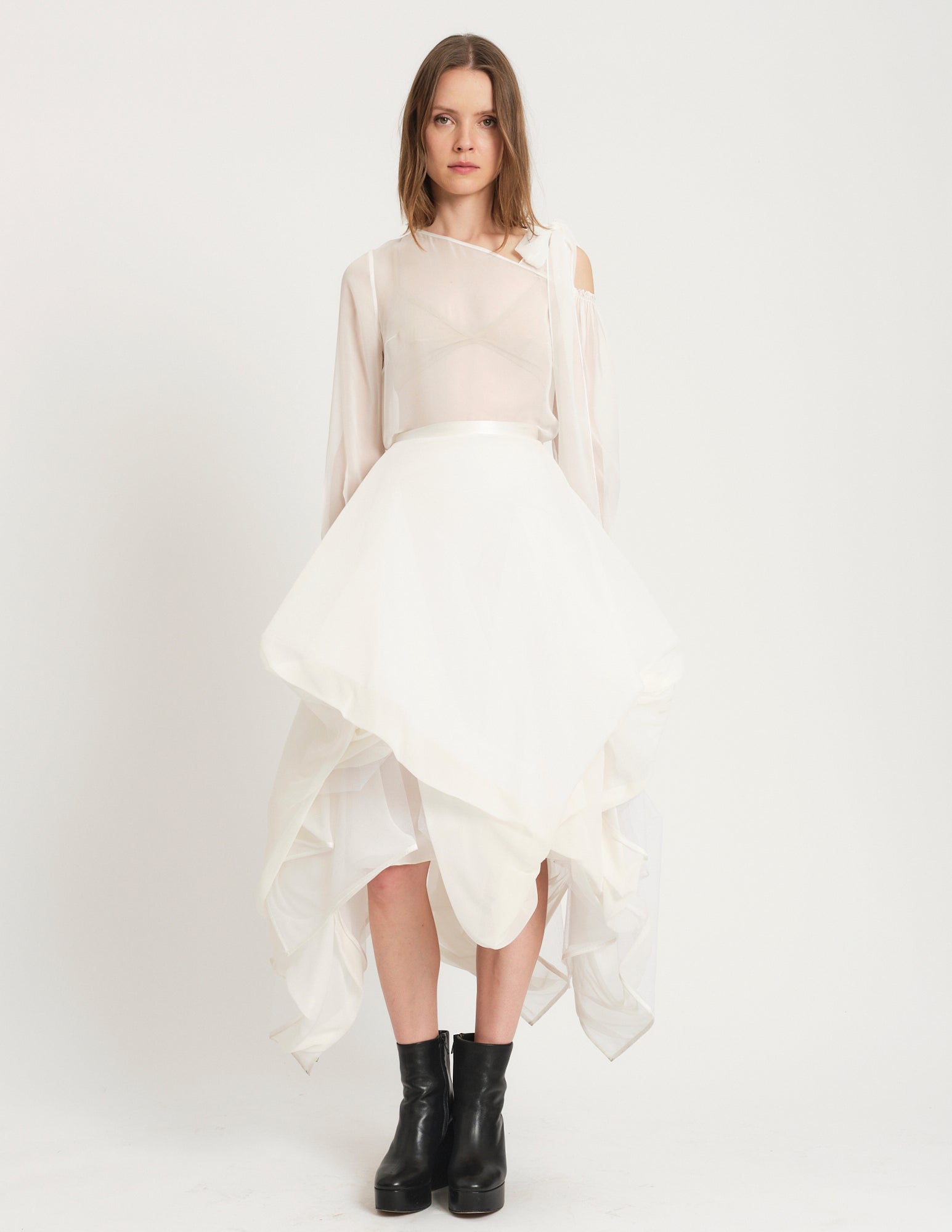 extravagantly draped chiffon and heavy tulle skirt with waist band and back zipper. tea length.