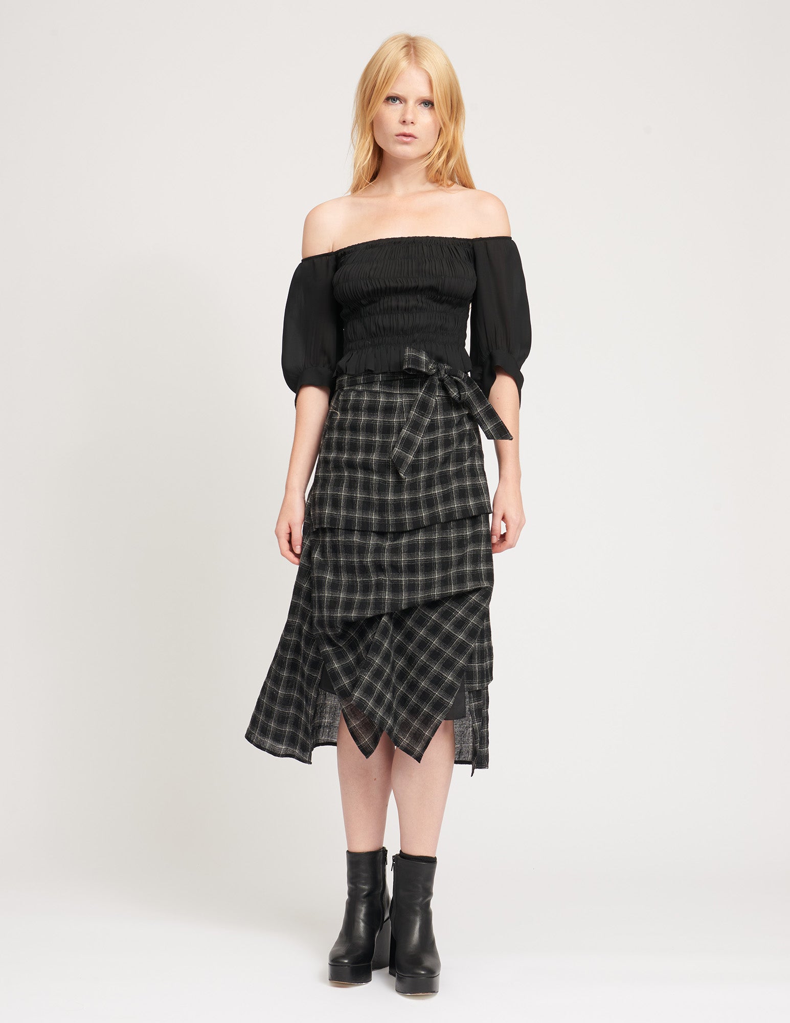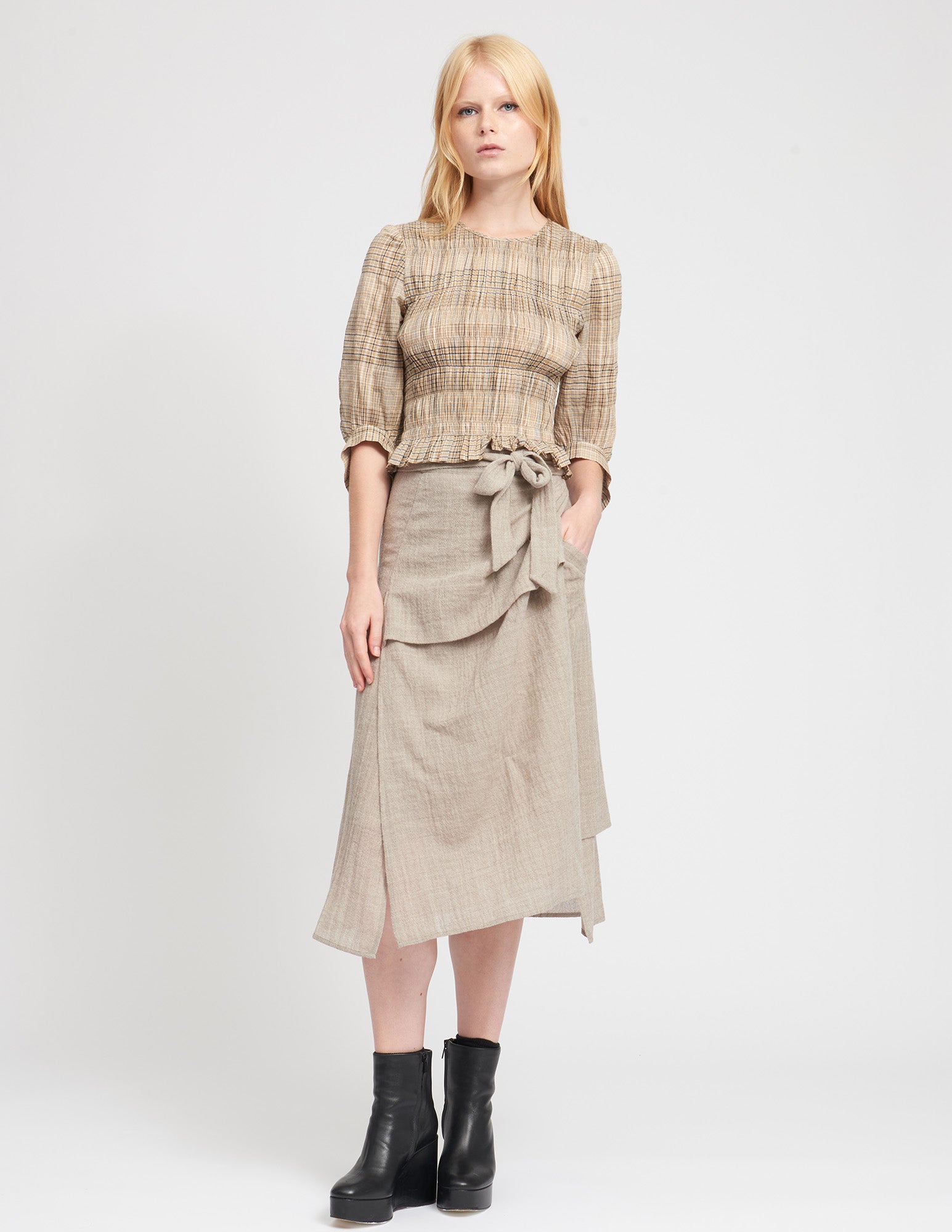 midi-wrap skirt features a fixed front drape, optional interior ties for added drapery, and a front panel pocket. styled with the nembus blouse and waverly blouse.