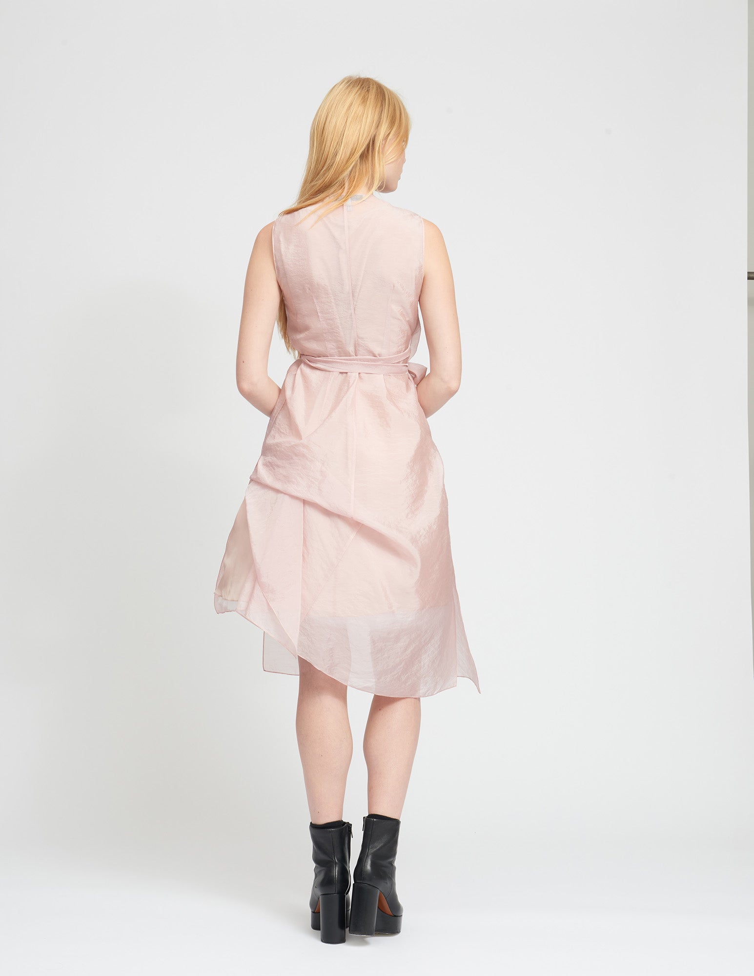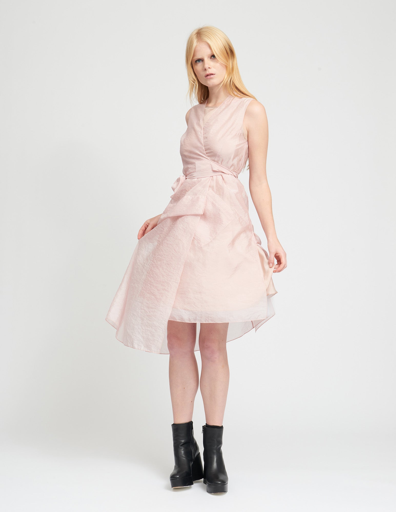 fitted maxi wrap dress with layered panels, a tie detail, and a romantic fixed drape. comes with a slip and styled with the st. moritz crinoline.
