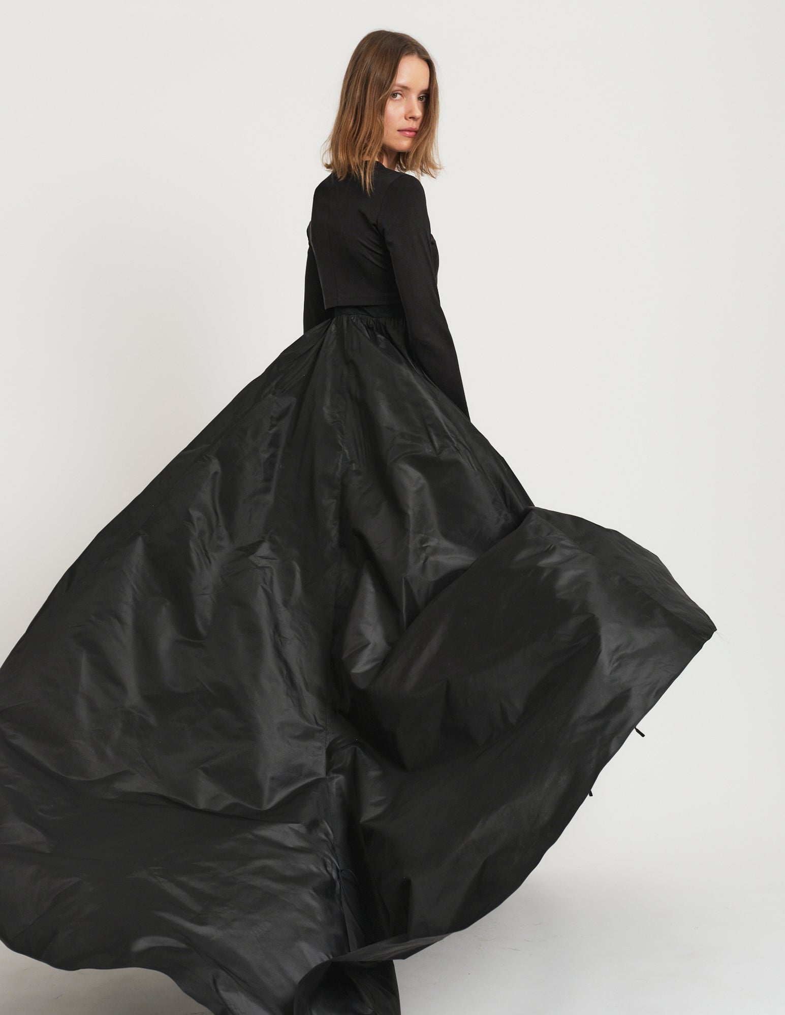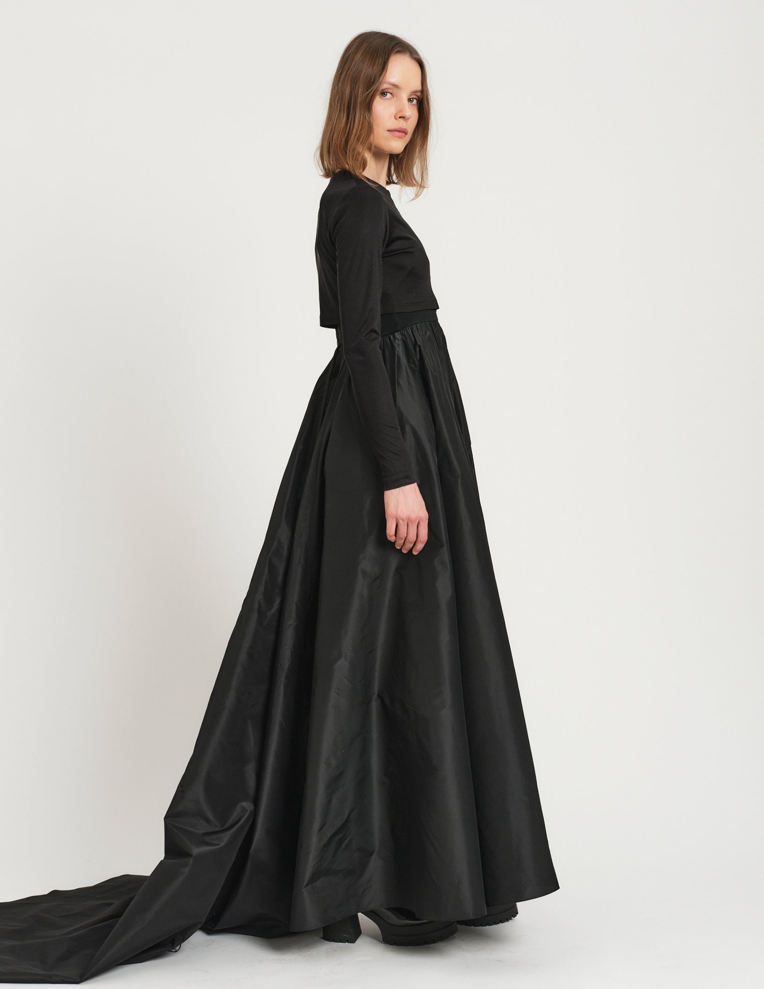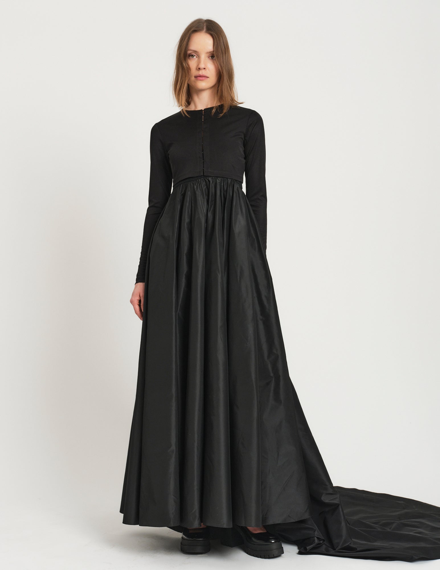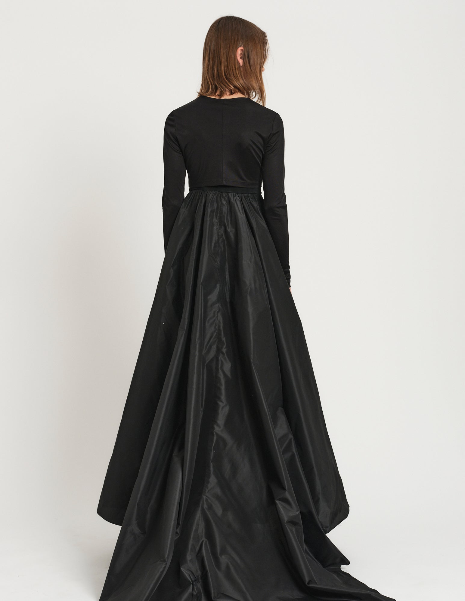 a playful pairing to the morgane gown, the morgane cardigan is a cropped silk jersey cardigan featuring hook and eye closures. styled with the morgane gown.