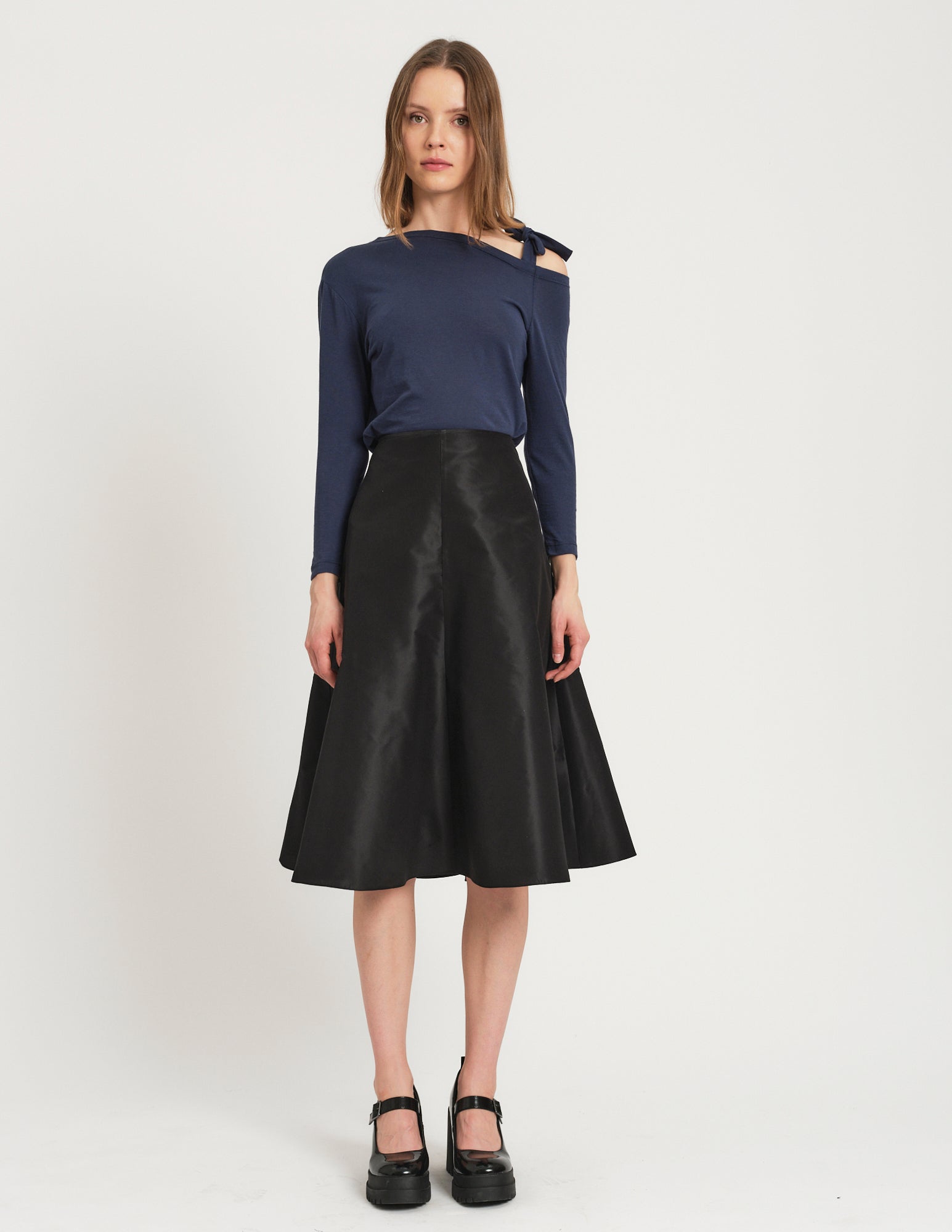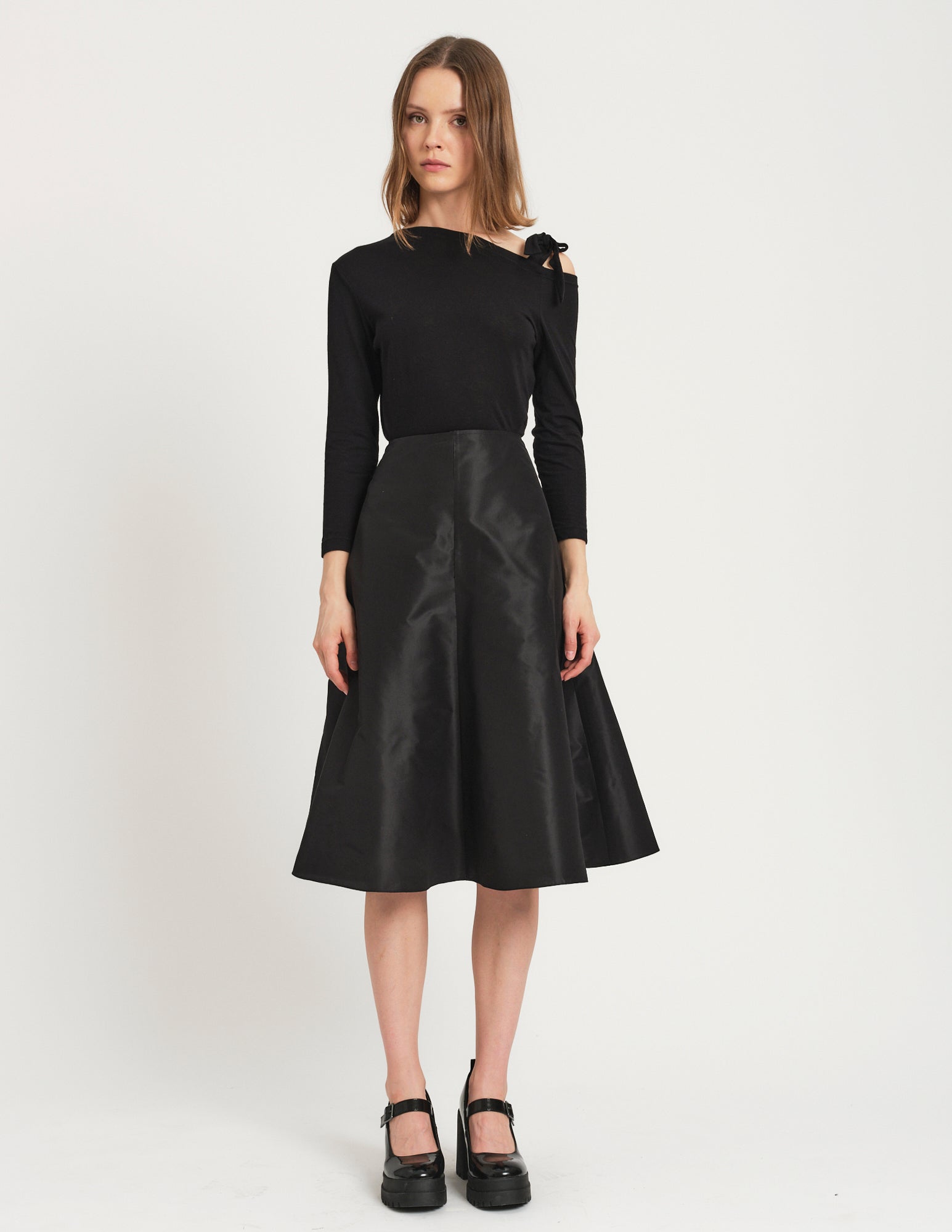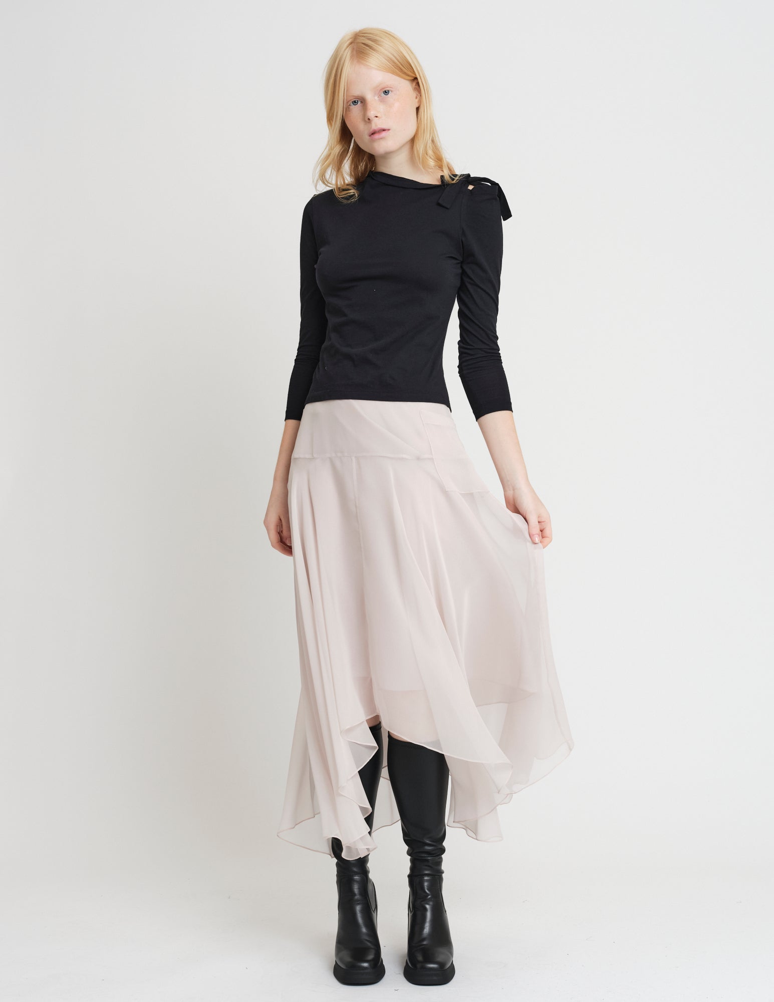 crafted in cotton jersey, a romantic take on a long sleeve t-shirt features an asymmetrical neckline with ties to be formed in a bow at the left shoulder. styled with the bjorn skirt.