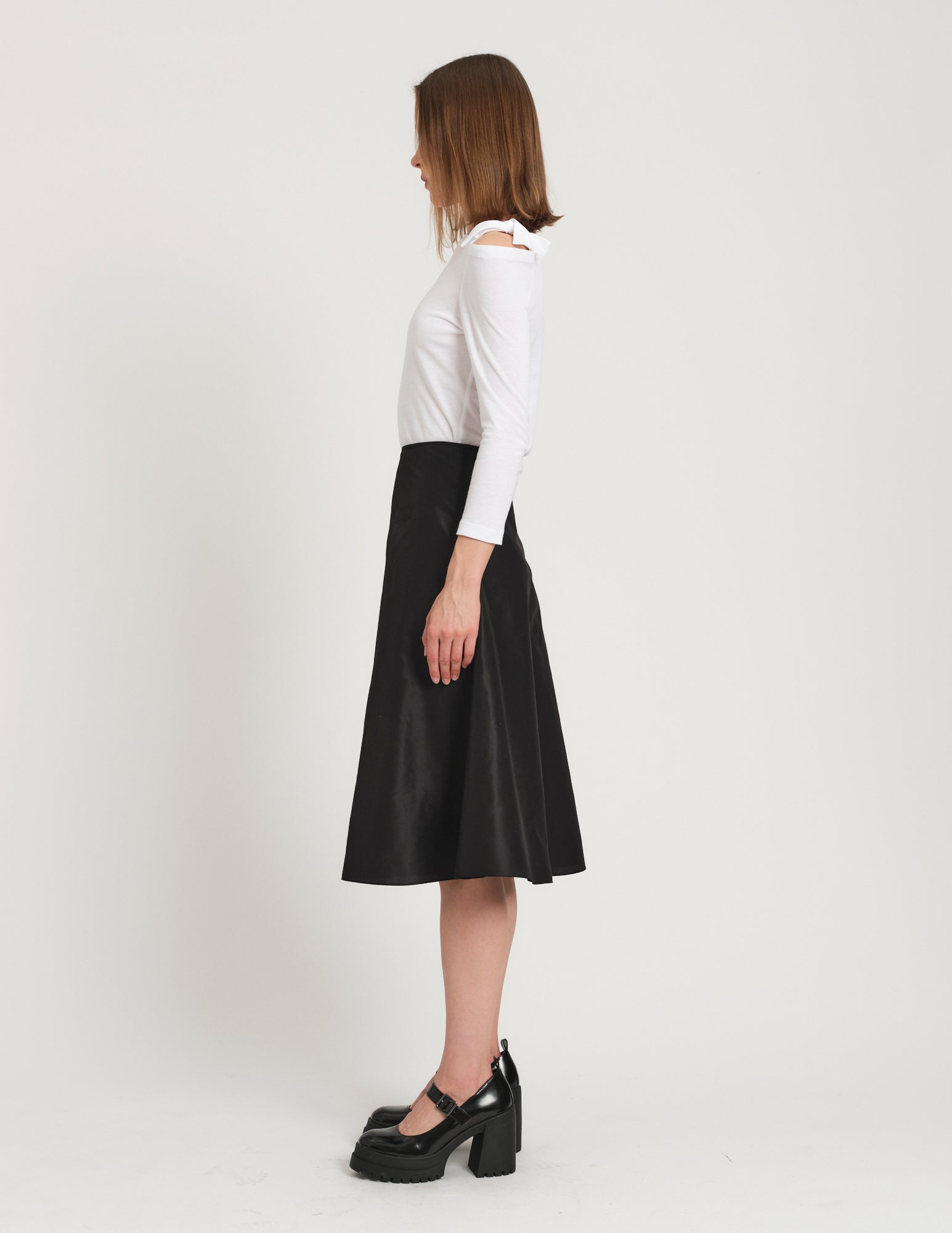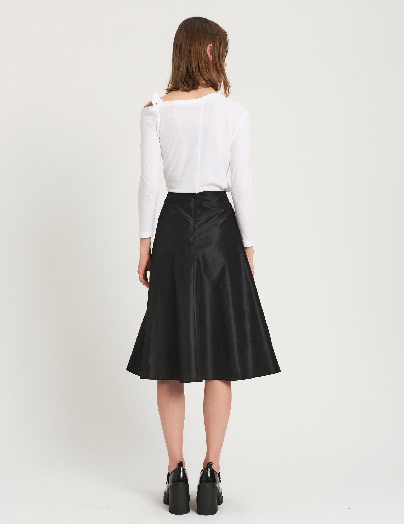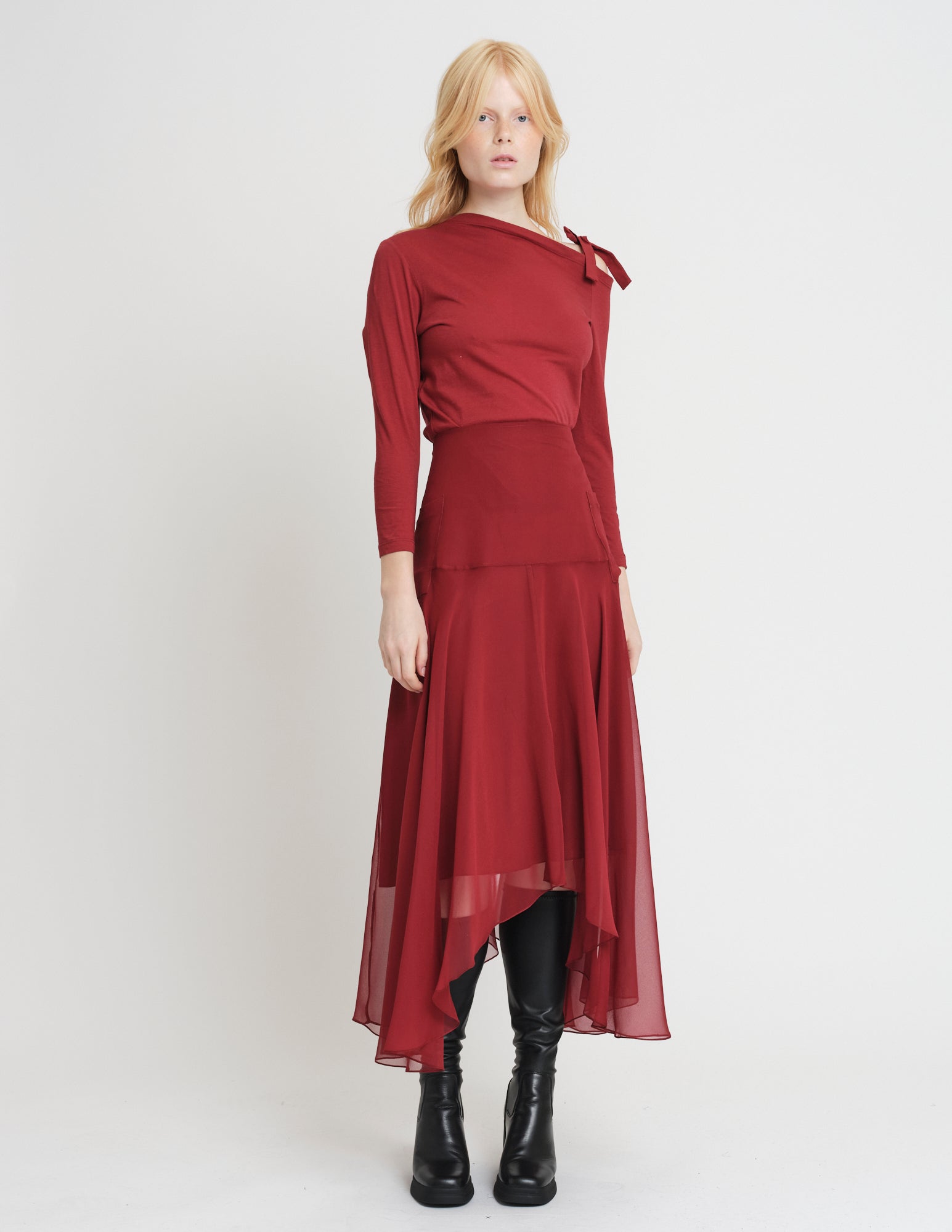 crafted in cotton jersey, a romantic take on a long sleeve t-shirt features an asymmetrical neckline with ties to be formed in a bow at the left shoulder. styled with the bjorn skirt.