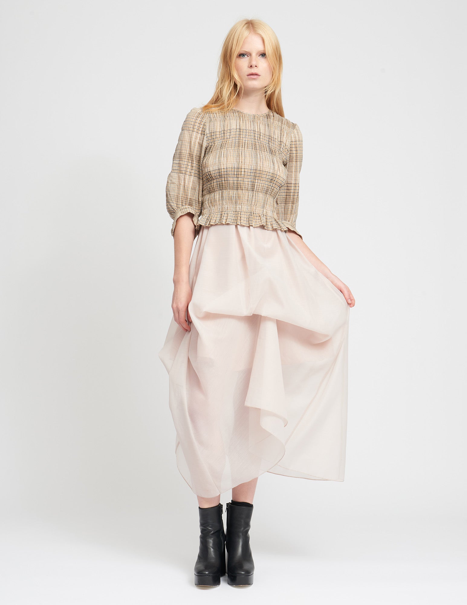 blouse with a fitted silhouette, ruching detailing, and our signature 3/4 sleeves. styled over our incense dress.