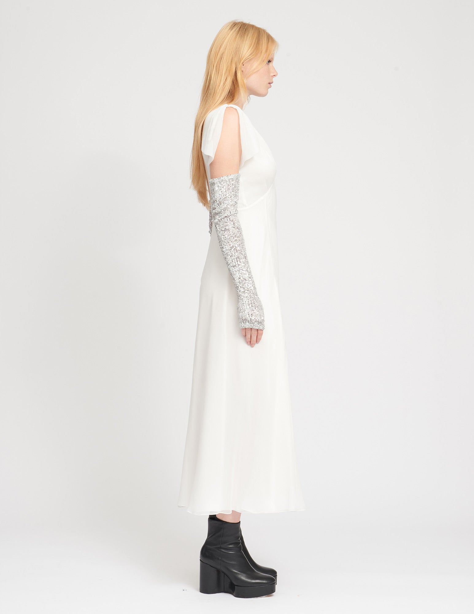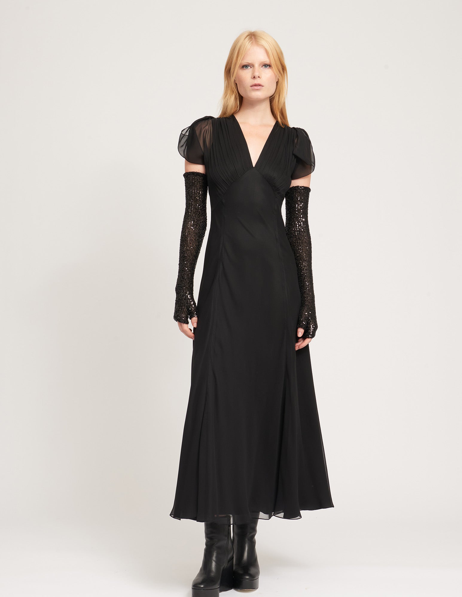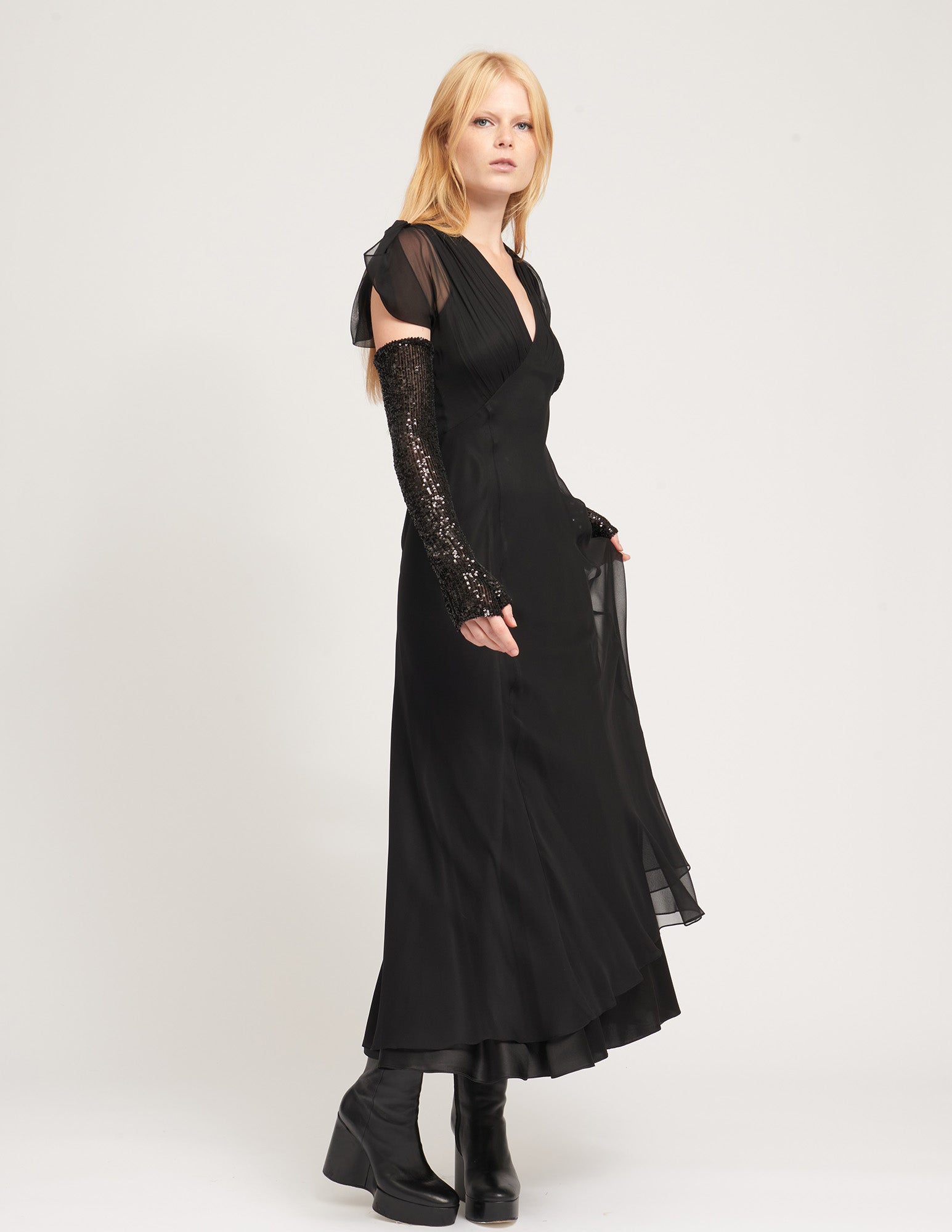 the opera gloves add a dreamy touch of brilliance to any outfit. crafted from hand-sewn french sequin fabric in our signature fingerless glove. styled with the dafodil dress.