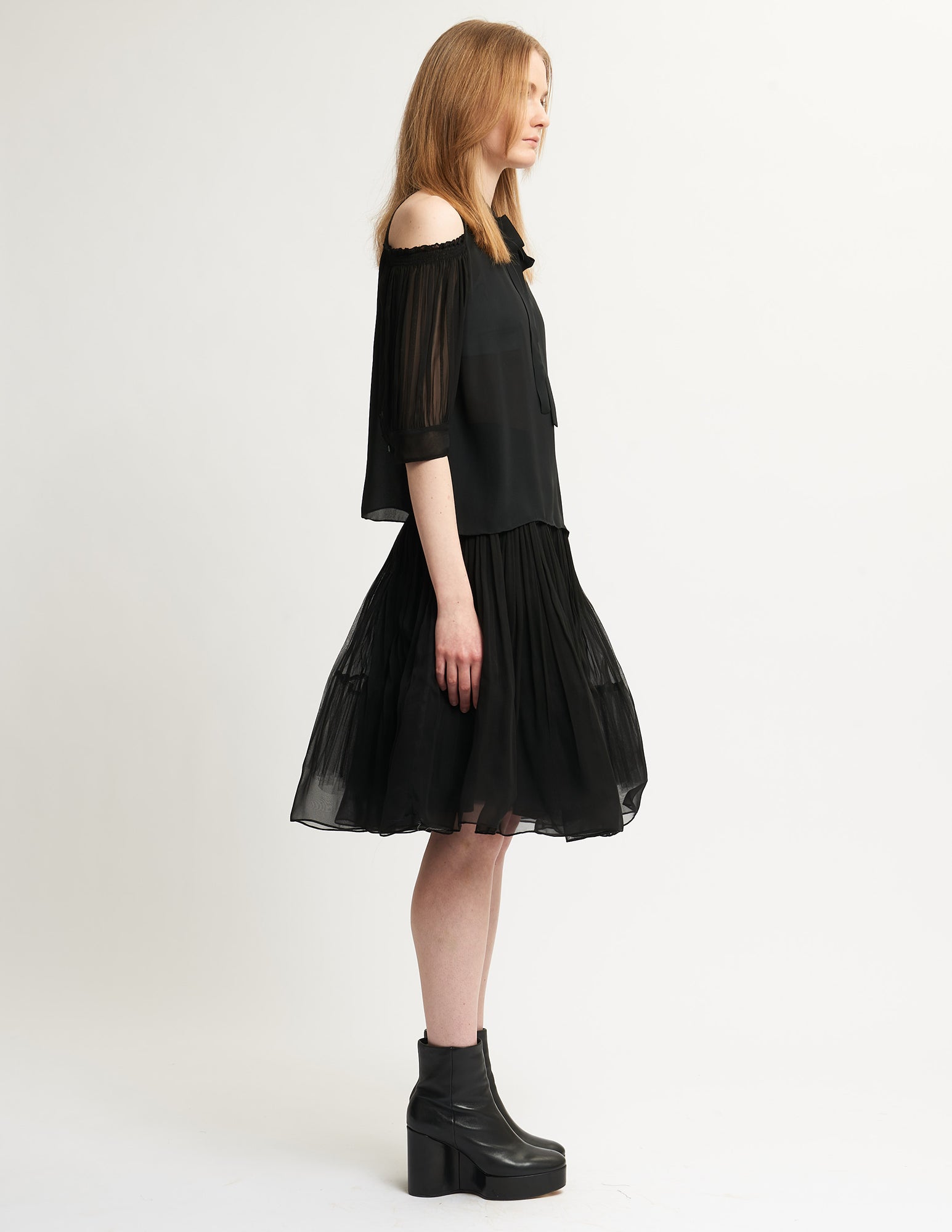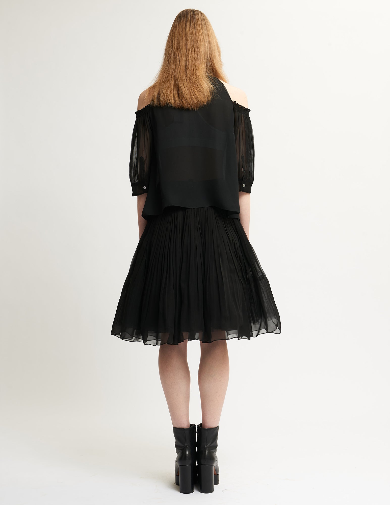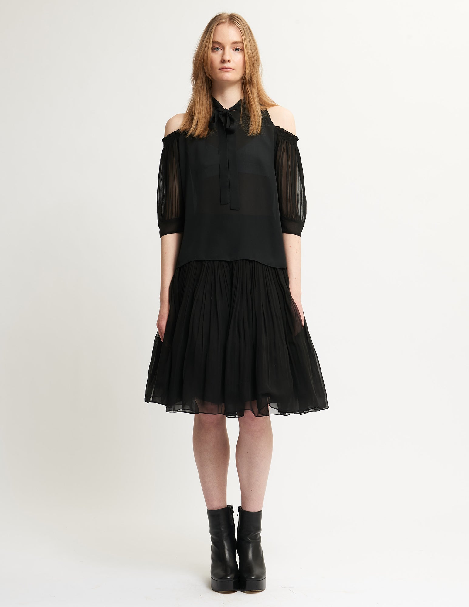 halter blouse that has a relaxed fit, pleated sleeves, and a neck tie. styled with the galileo skirt.