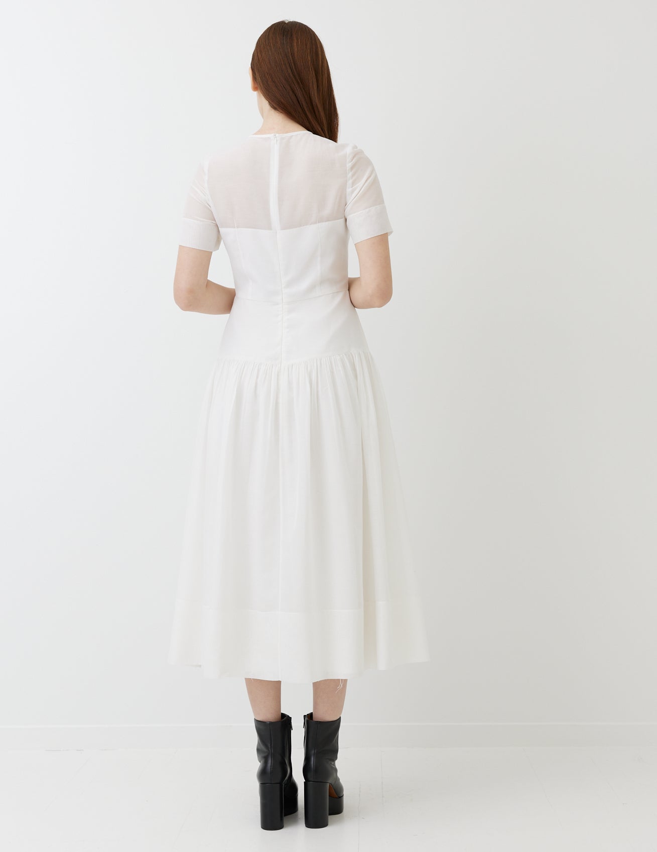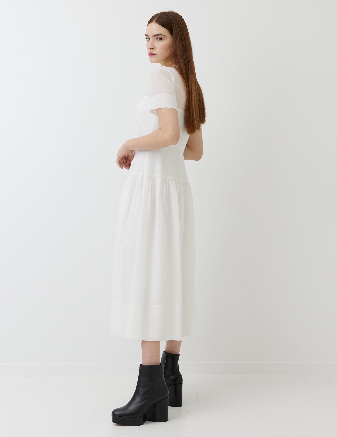 romantic dress with short sleeves in light, cotton voile. features fitted bodice and elegantly gathered skirt.