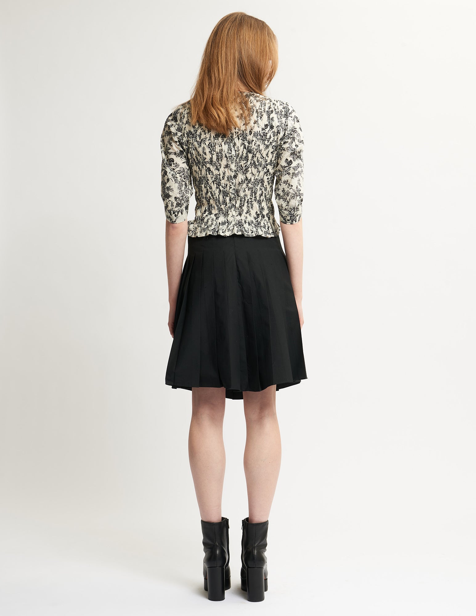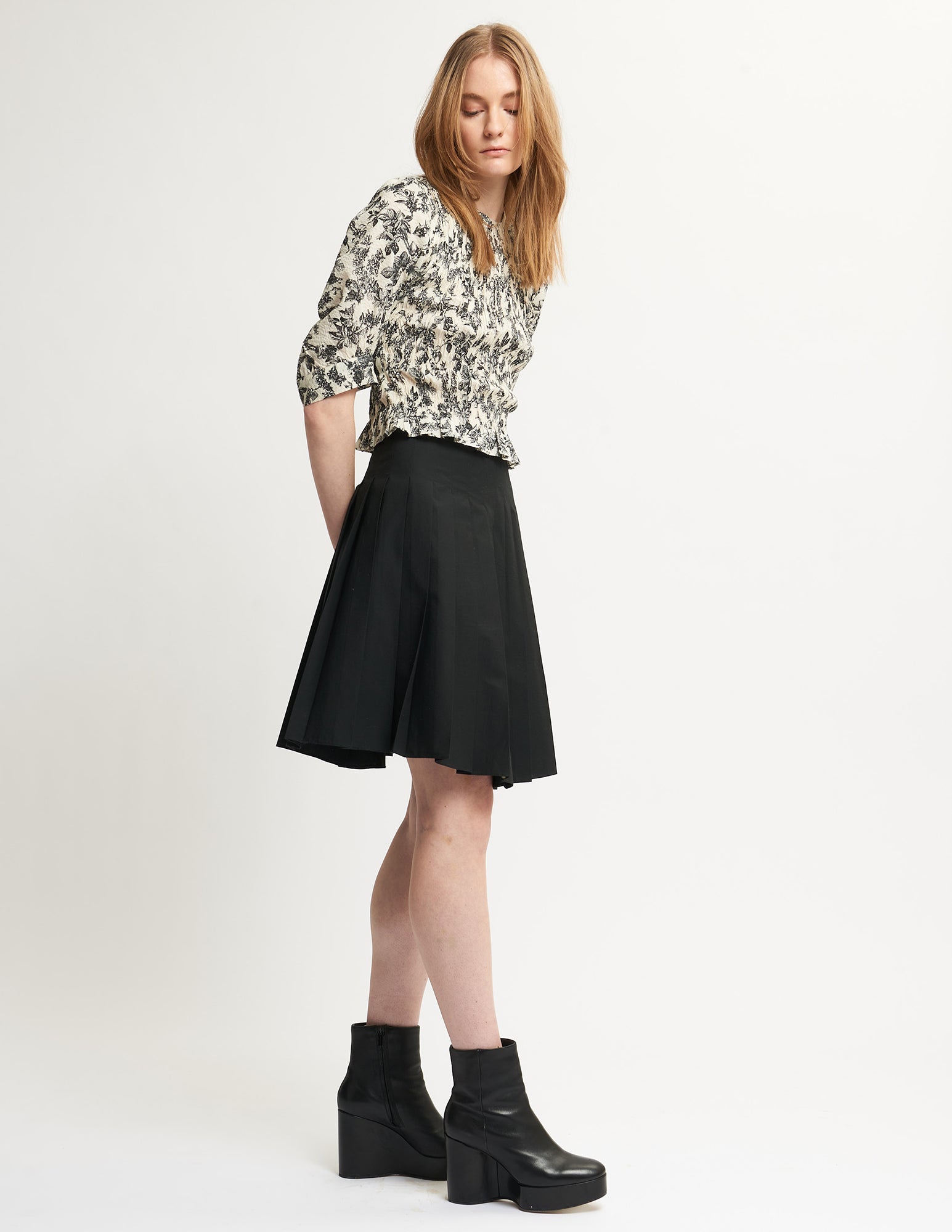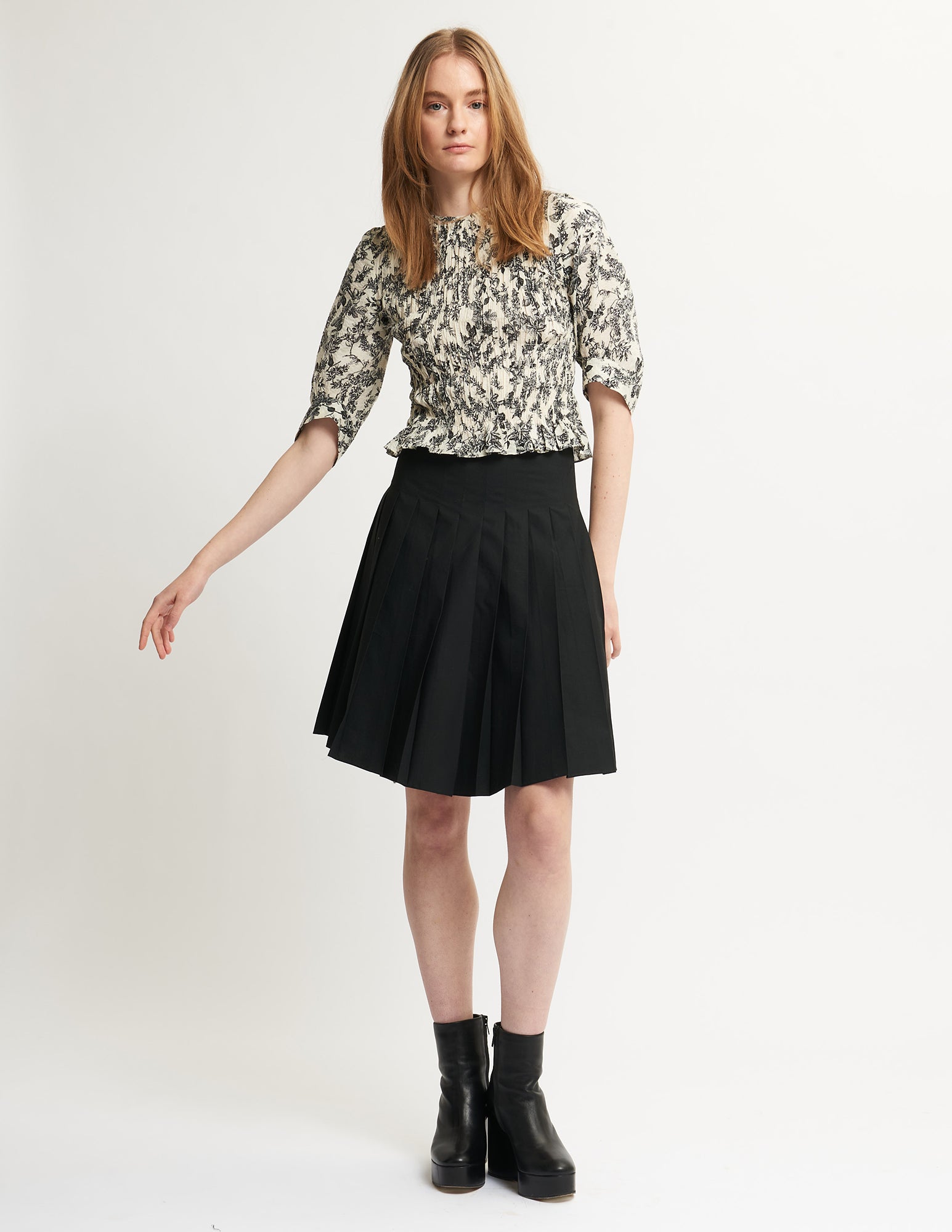 blouse with a fitted silhouette, ruching detailing, and our signature 3/4 sleeves. styled with the adalaide skirt.