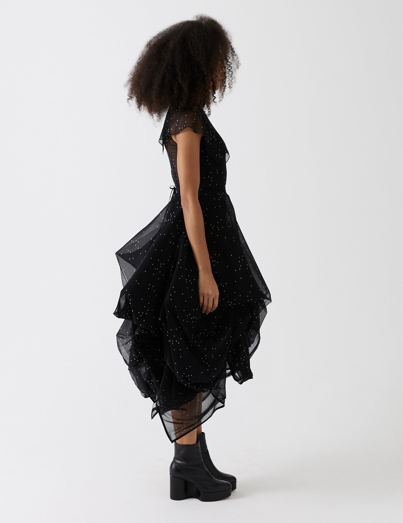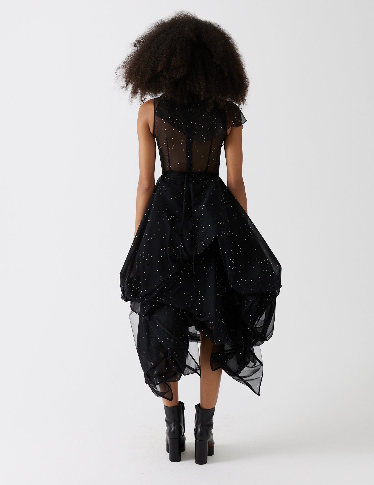 enchanting ballgown in our signature star print featuring structural draping and paneled high neck collar.
