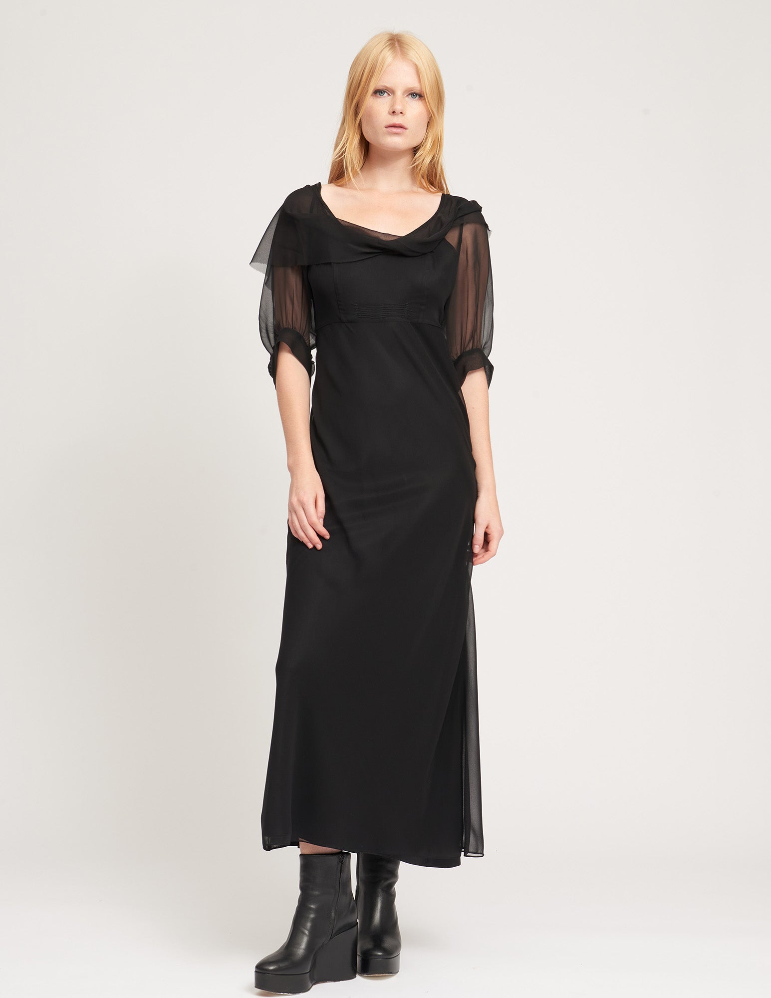 midi dress with voluminous sleeves, asymmetrical neckline, delicate pleat detail, and an open back. comes with a low back maxi slip.