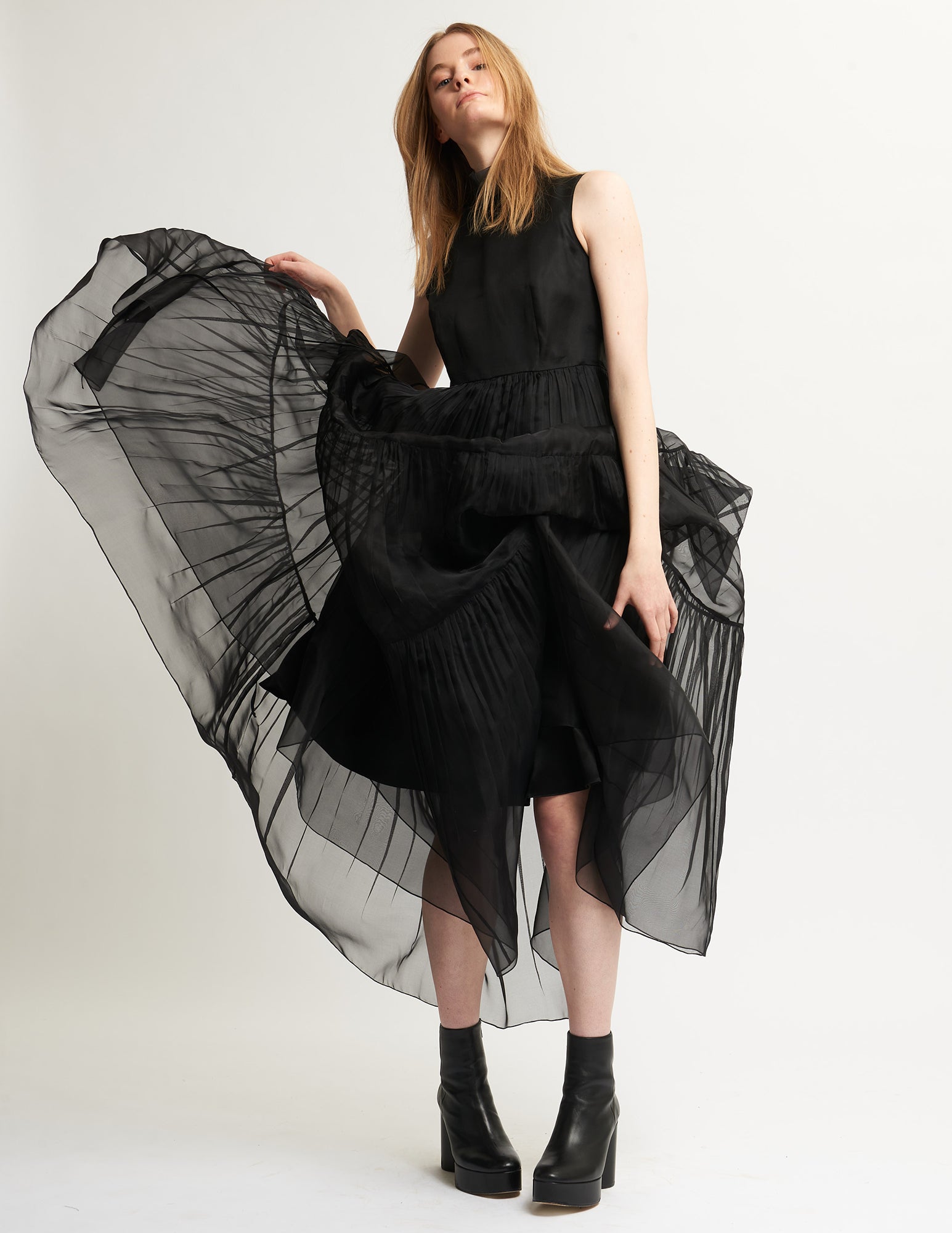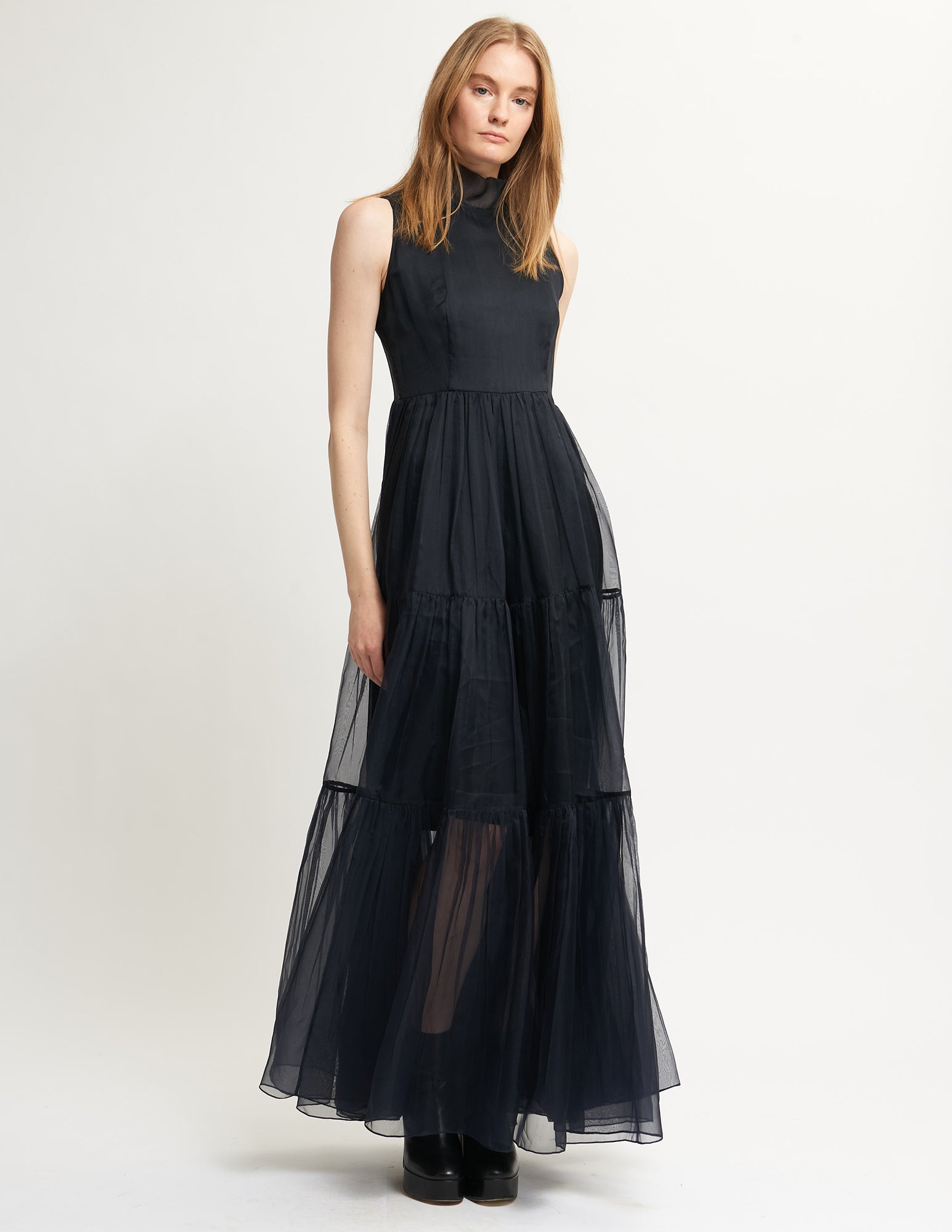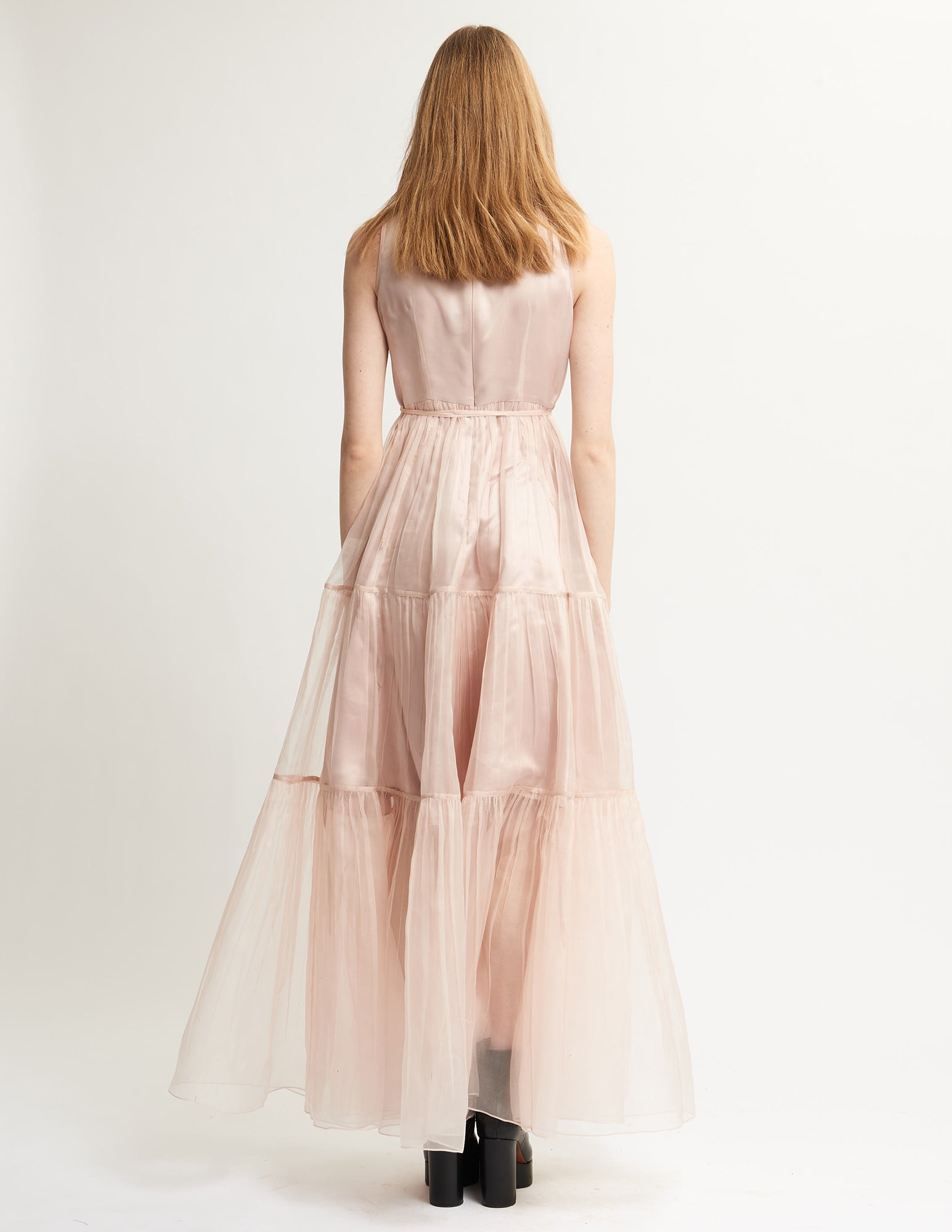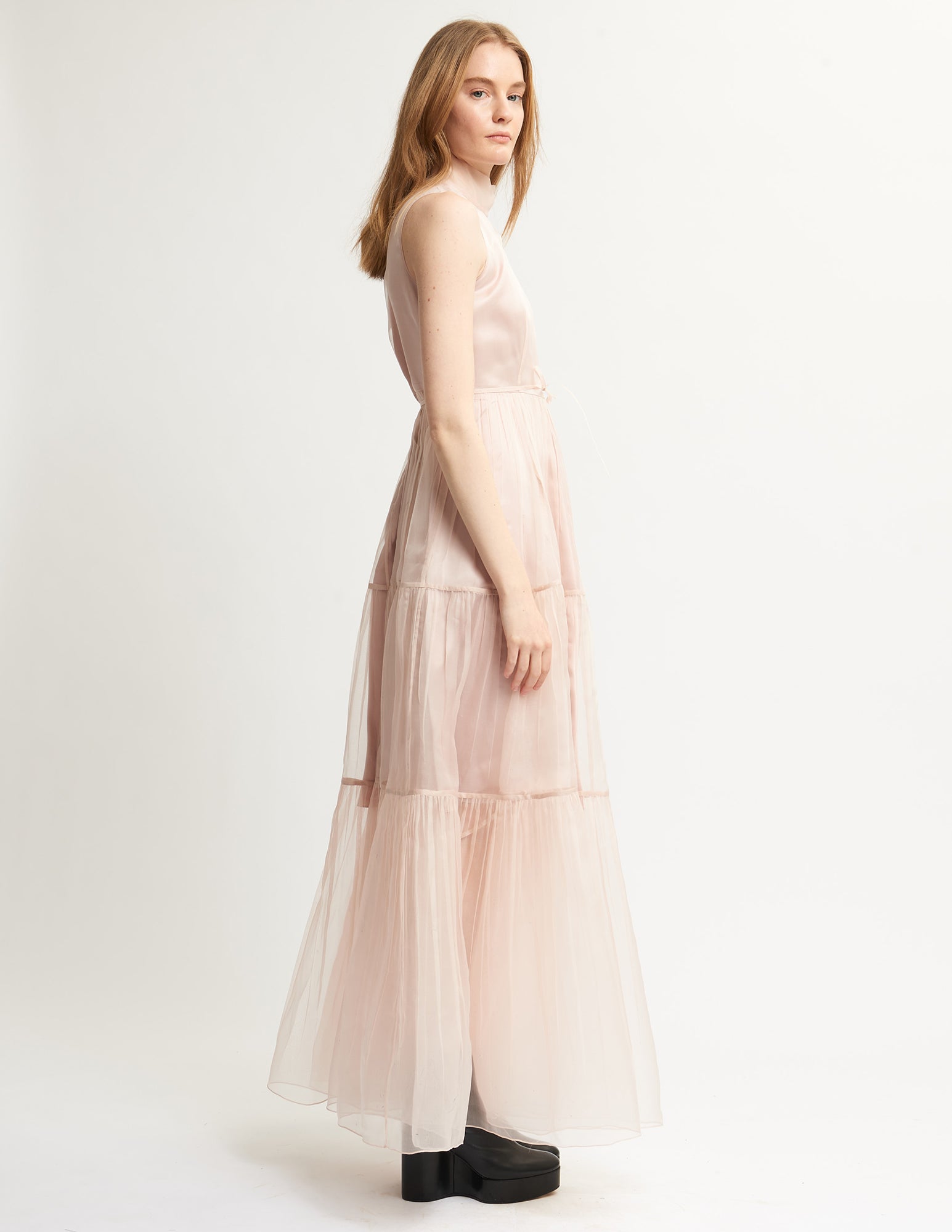 floor length organza gown featuring a fitted bodice and tiered skirt with optional interior ties to create drapery. lined.