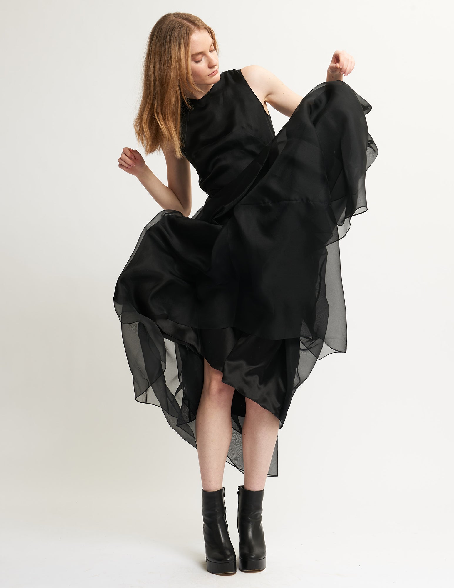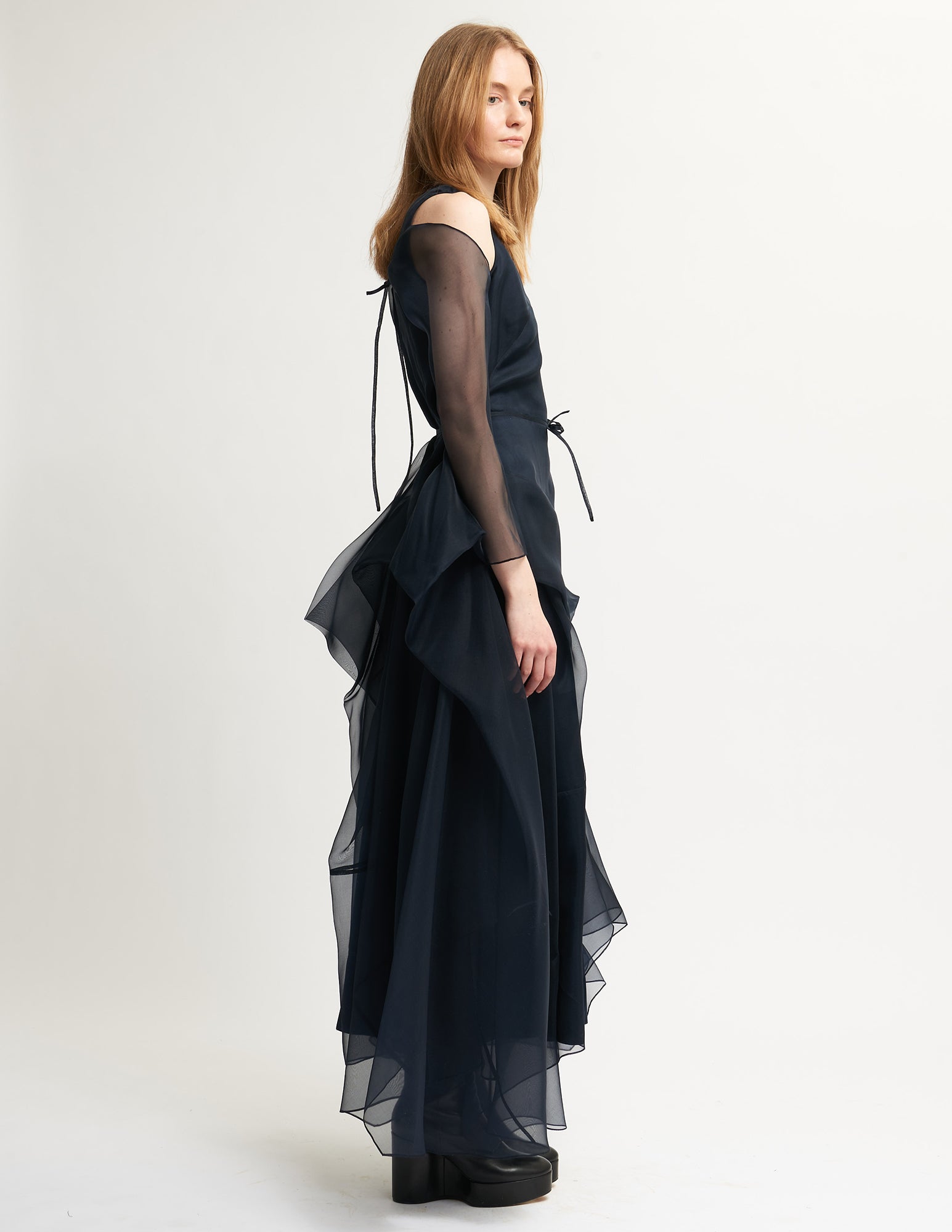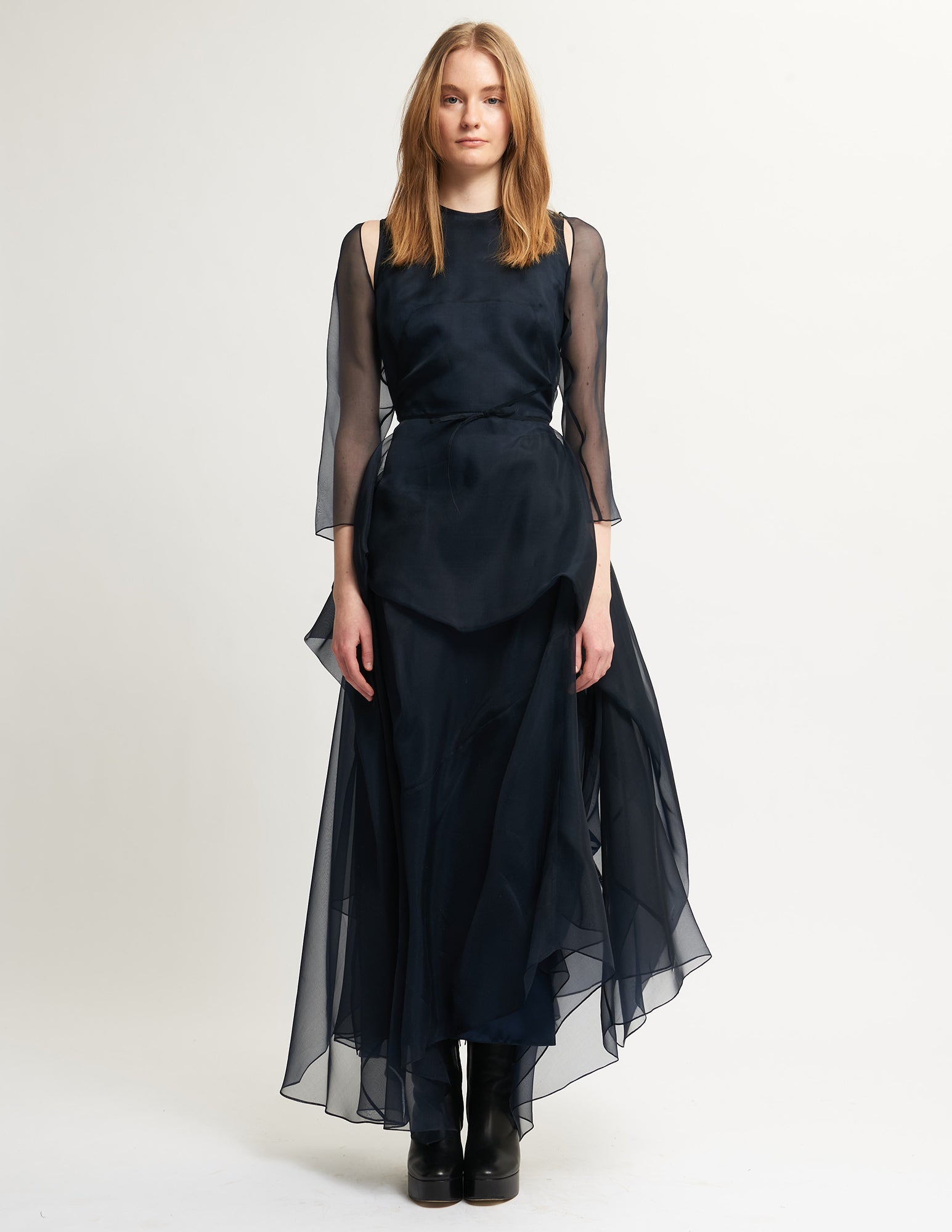 sleeveless fitted organza dress with multi-layered and asymmetrical draped panel skirt with a thin waist tie, optional detachable organza sleeves included.